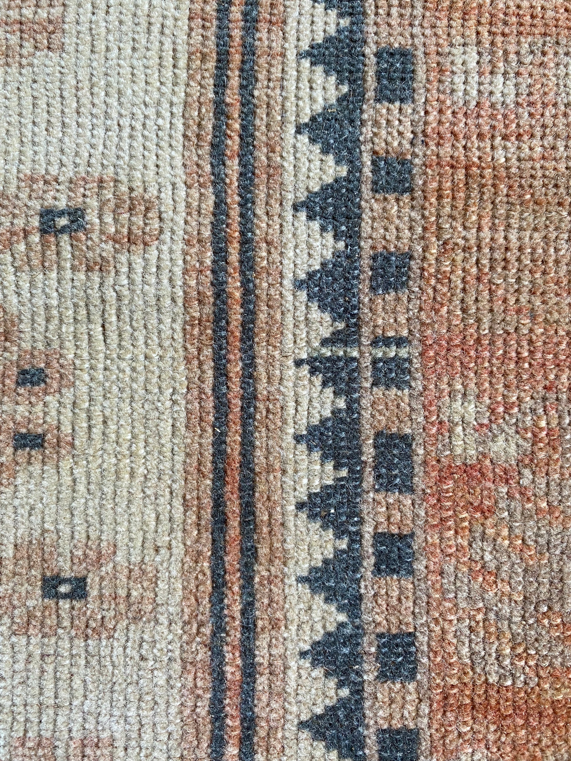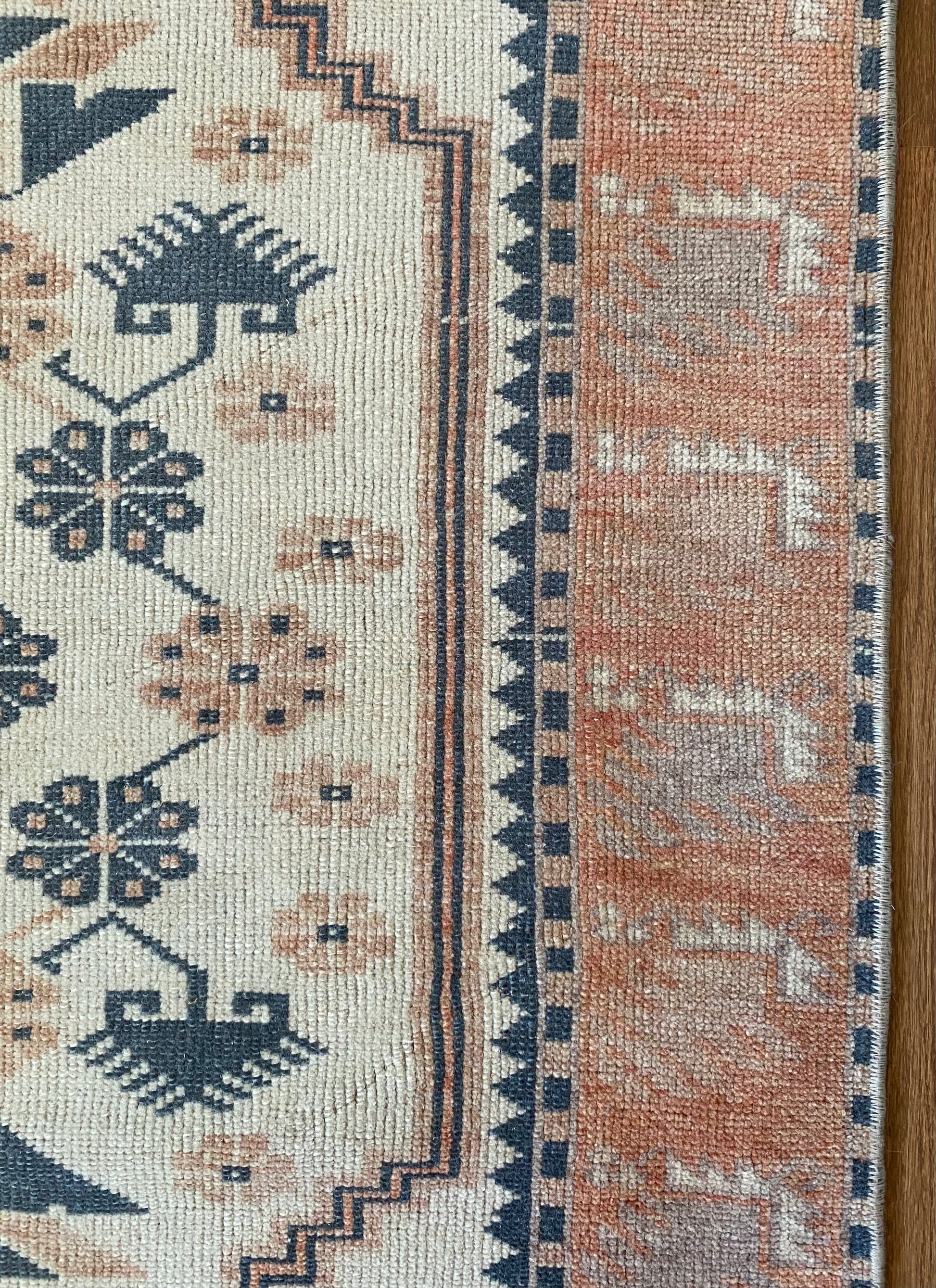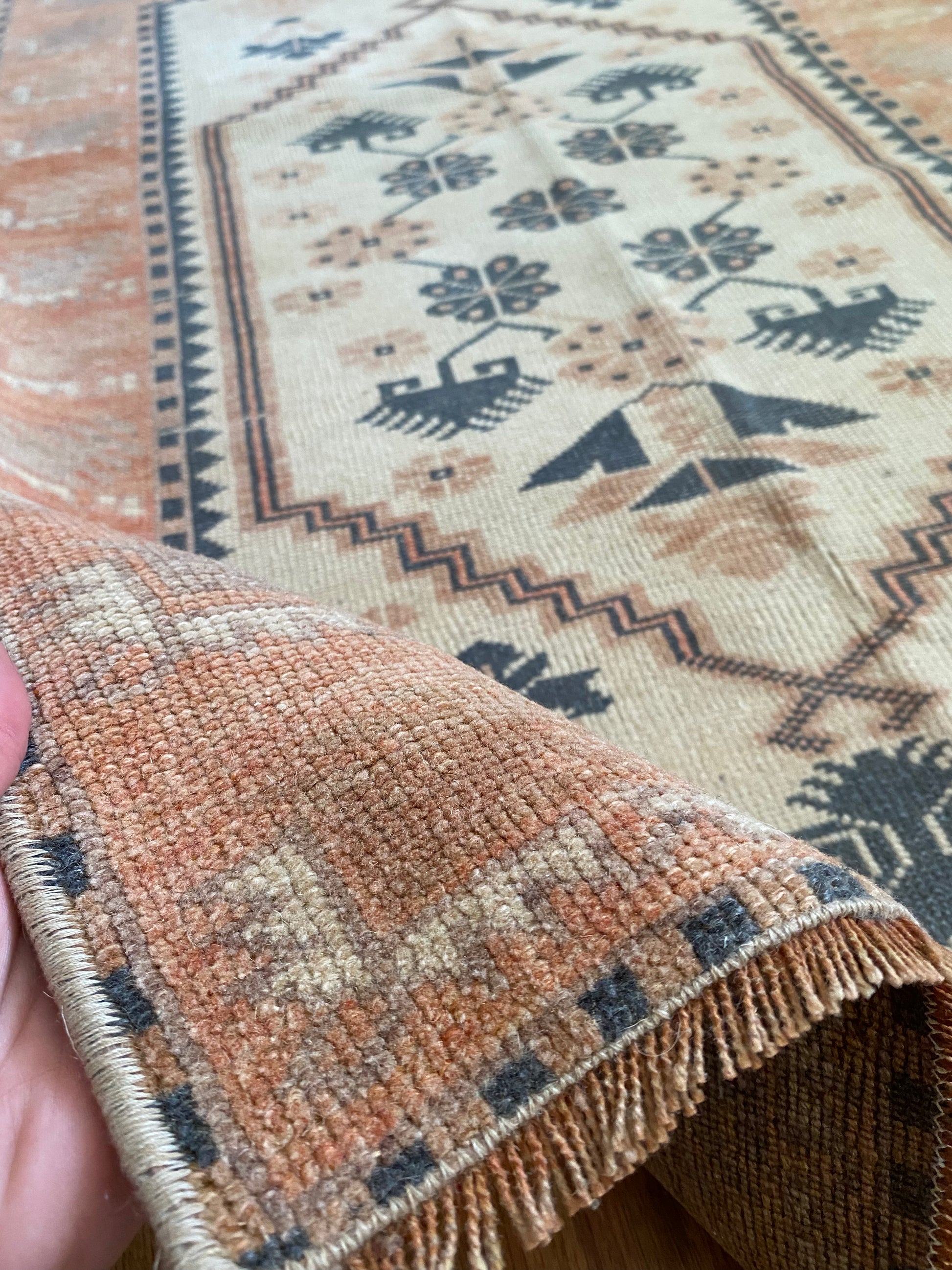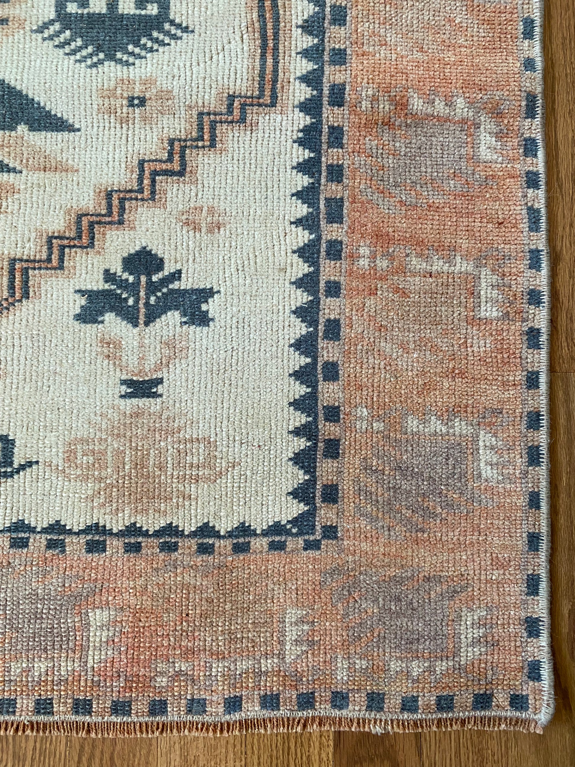 All of our rugs have been professionally cleaned prior to listing.  These unique vintage rugs have normal wear related to their age. Some may have minor repairs.  All photographs are taken in natural light; colors may vary depending on the placement in your home. Many rugs do not have perfect lines-we believe this adds to the authenticity of these hand-woven beauties. High quality wool contains a substance called lanolin, which emits a metallic-y, but sweet and grassy scent. ALL SALES FINAL.