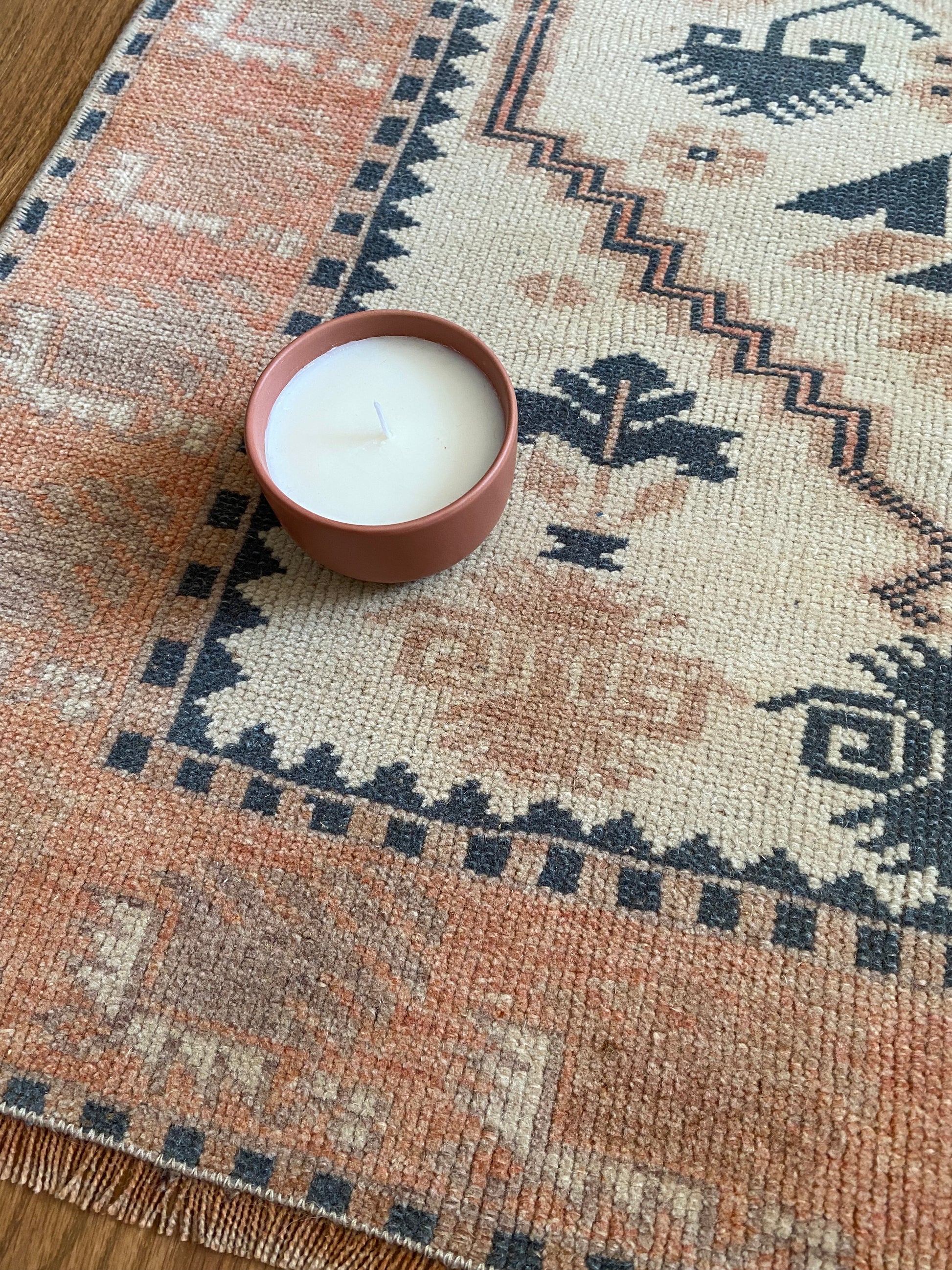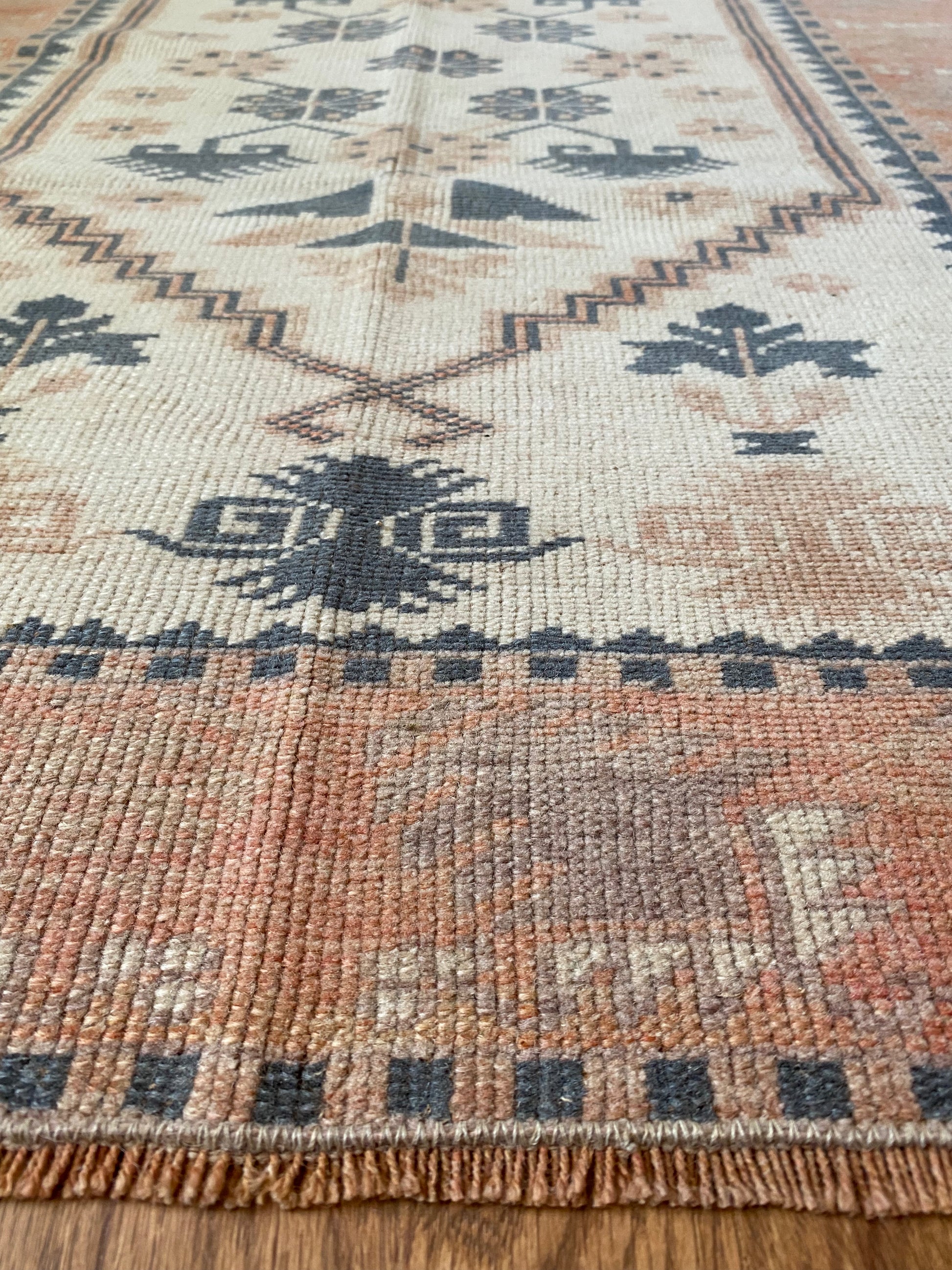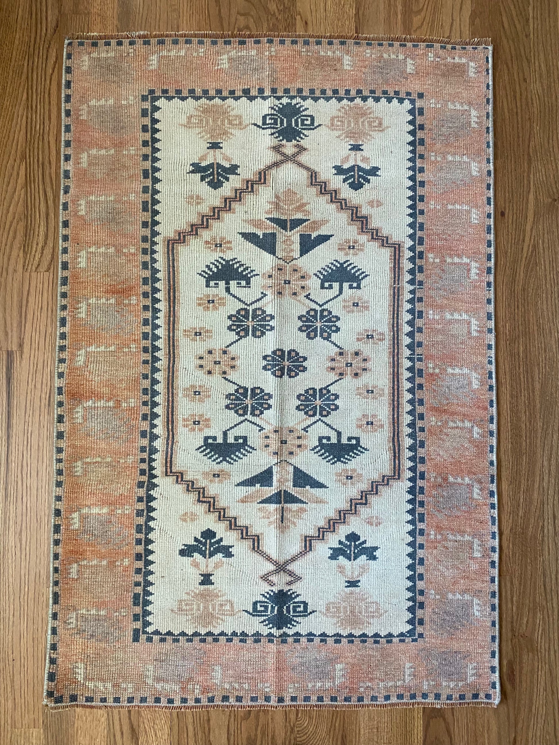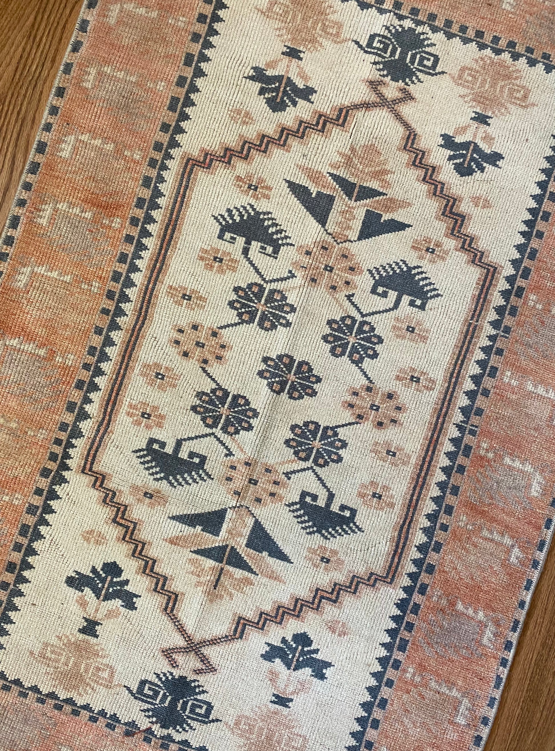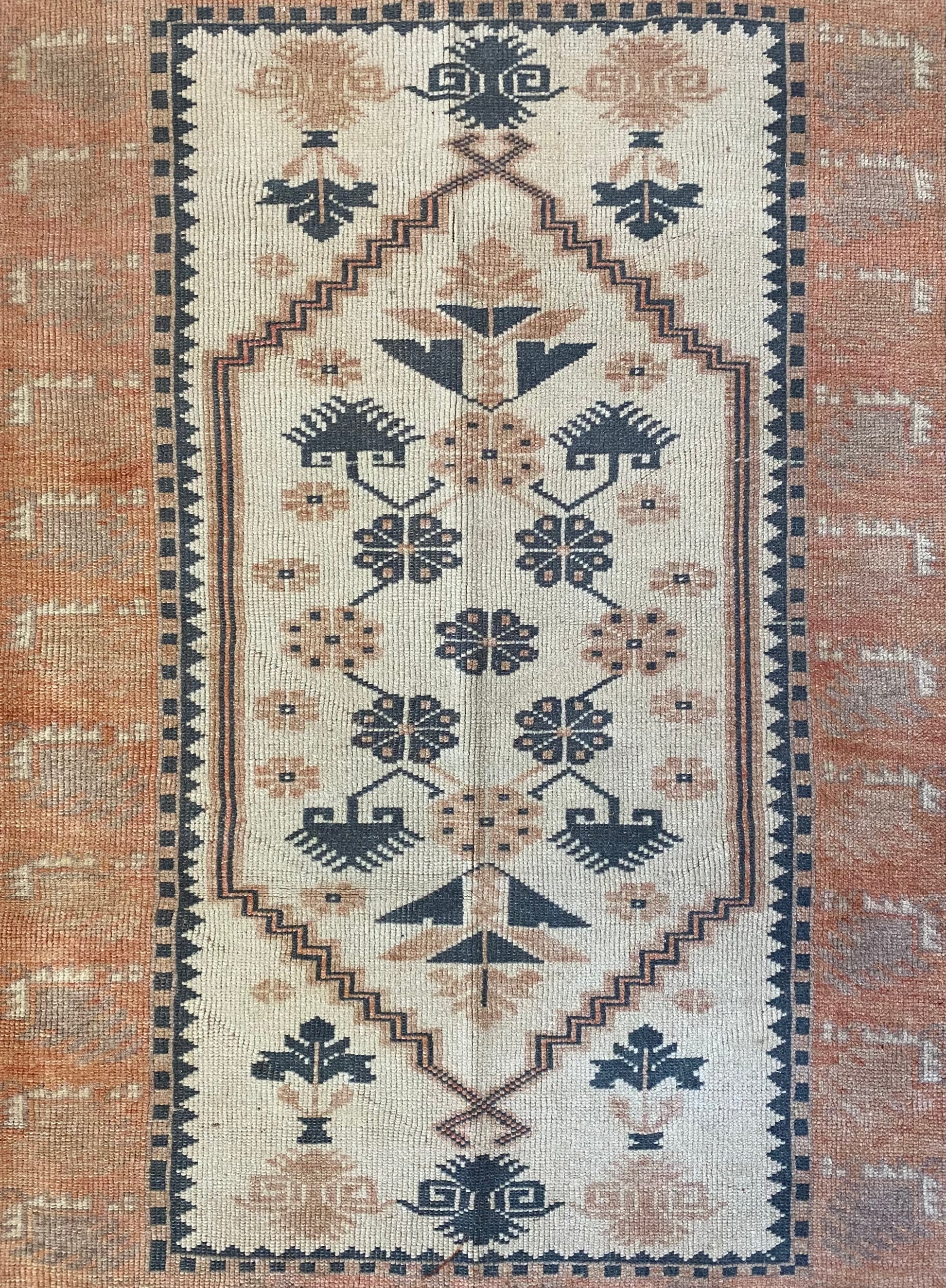 All of our rugs have been professionally cleaned prior to listing.  These unique vintage rugs have normal wear related to their age. Some may have minor repairs.  All photographs are taken in natural light; colors may vary depending on the placement in your home. Many rugs do not have perfect lines-we believe this adds to the authenticity of these hand-woven beauties. High quality wool contains a substance called lanolin, which emits a metallic-y, but sweet and grassy scent. ALL SALES FINAL.