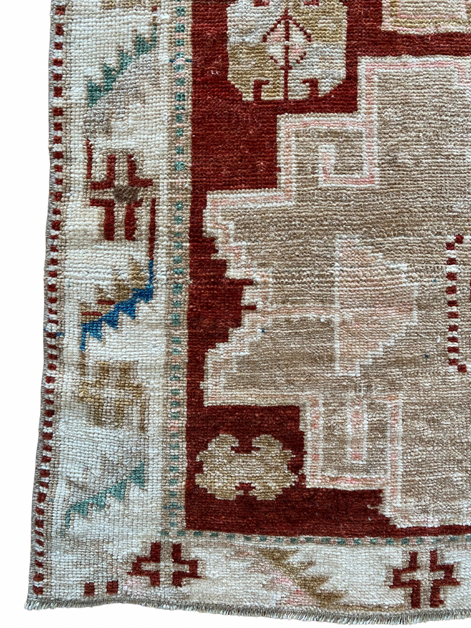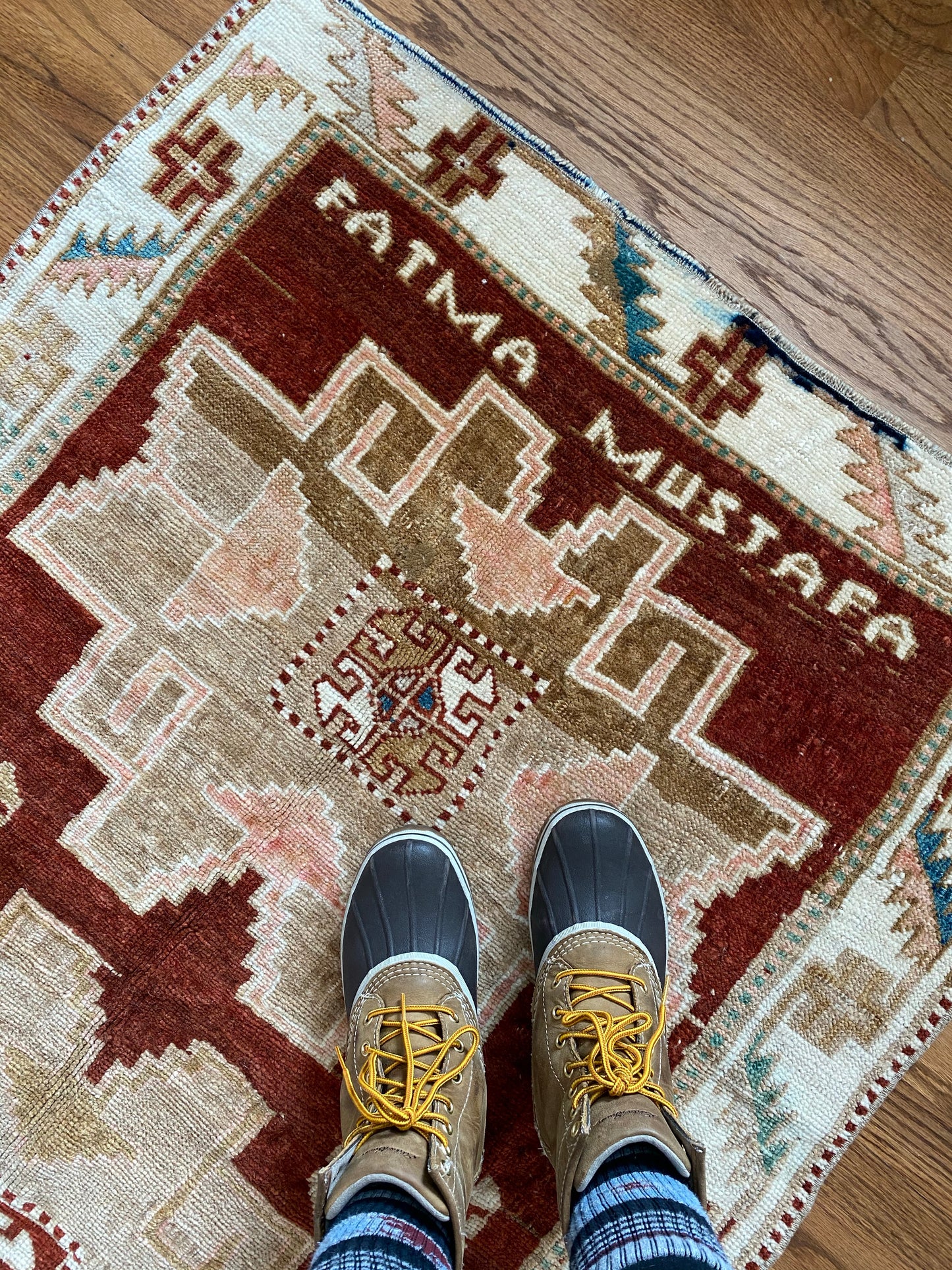 All of our rugs have been cleaned prior to listing. These unique vintage rugs have normal wear related to their age. All photographs are taken in natural light; colors may vary depending on the placement in your home. Many rugs do not have perfect lines-we believe this adds to the authenticity of these hand-woven beauties.