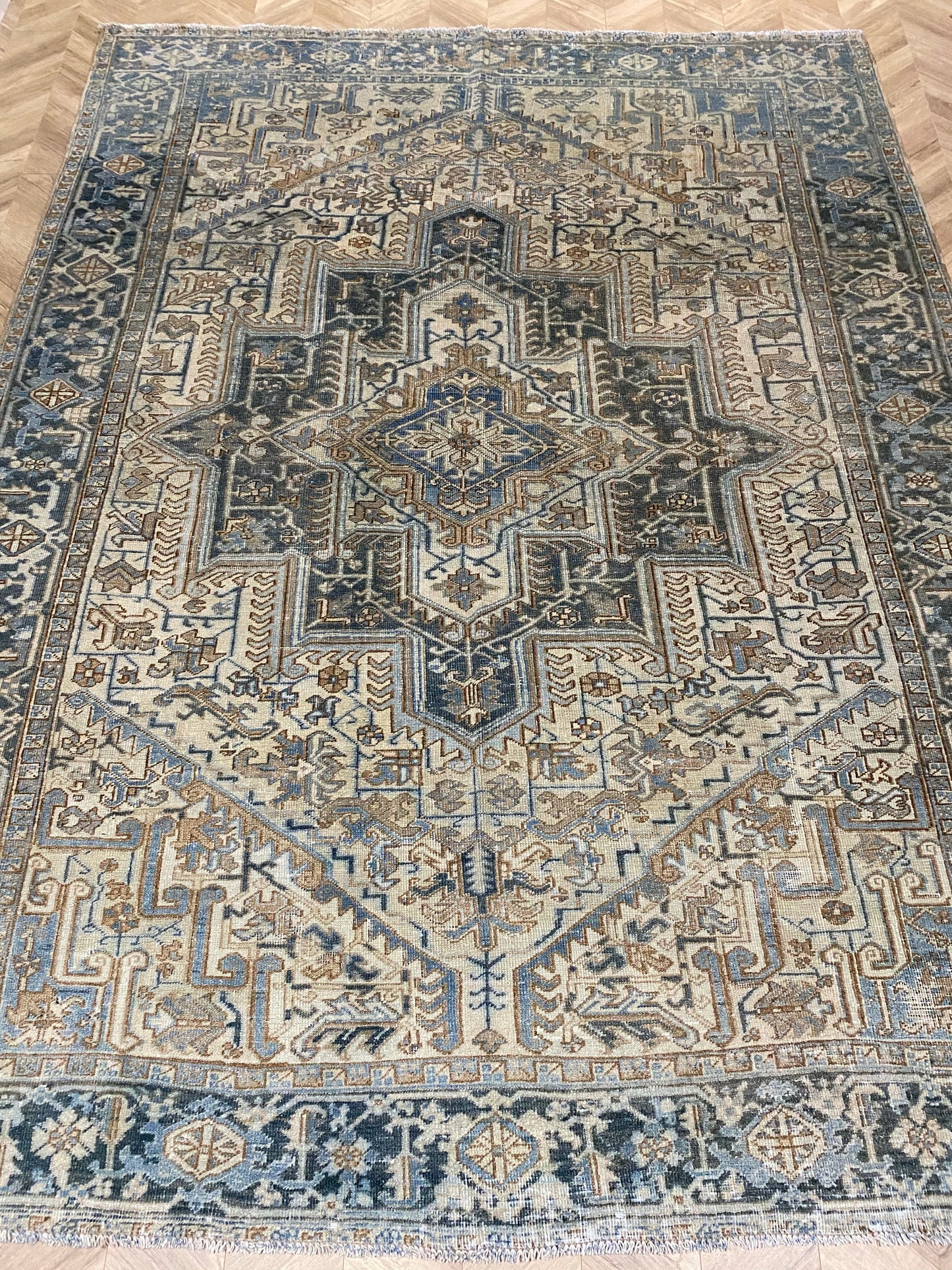 All of our rugs have been professionally cleaned prior to listing. These unique vintage rugs have normal wear related to their age. Some may have minor repairs. All photographs are taken in natural light; colors may vary depending on the placement in your home. Many rugs do not have perfect lines-we believe this adds to the authenticity of these hand-woven beauties.