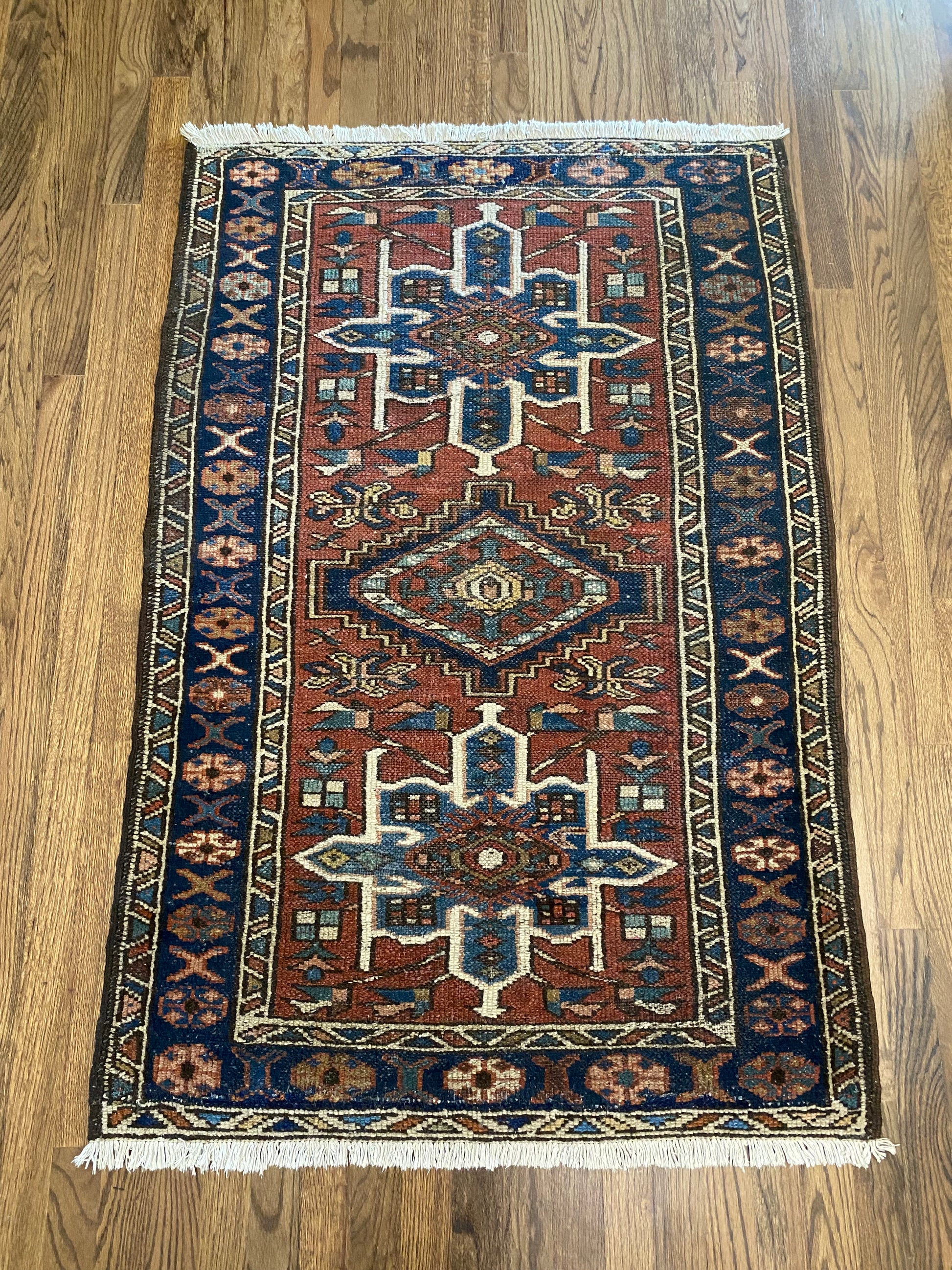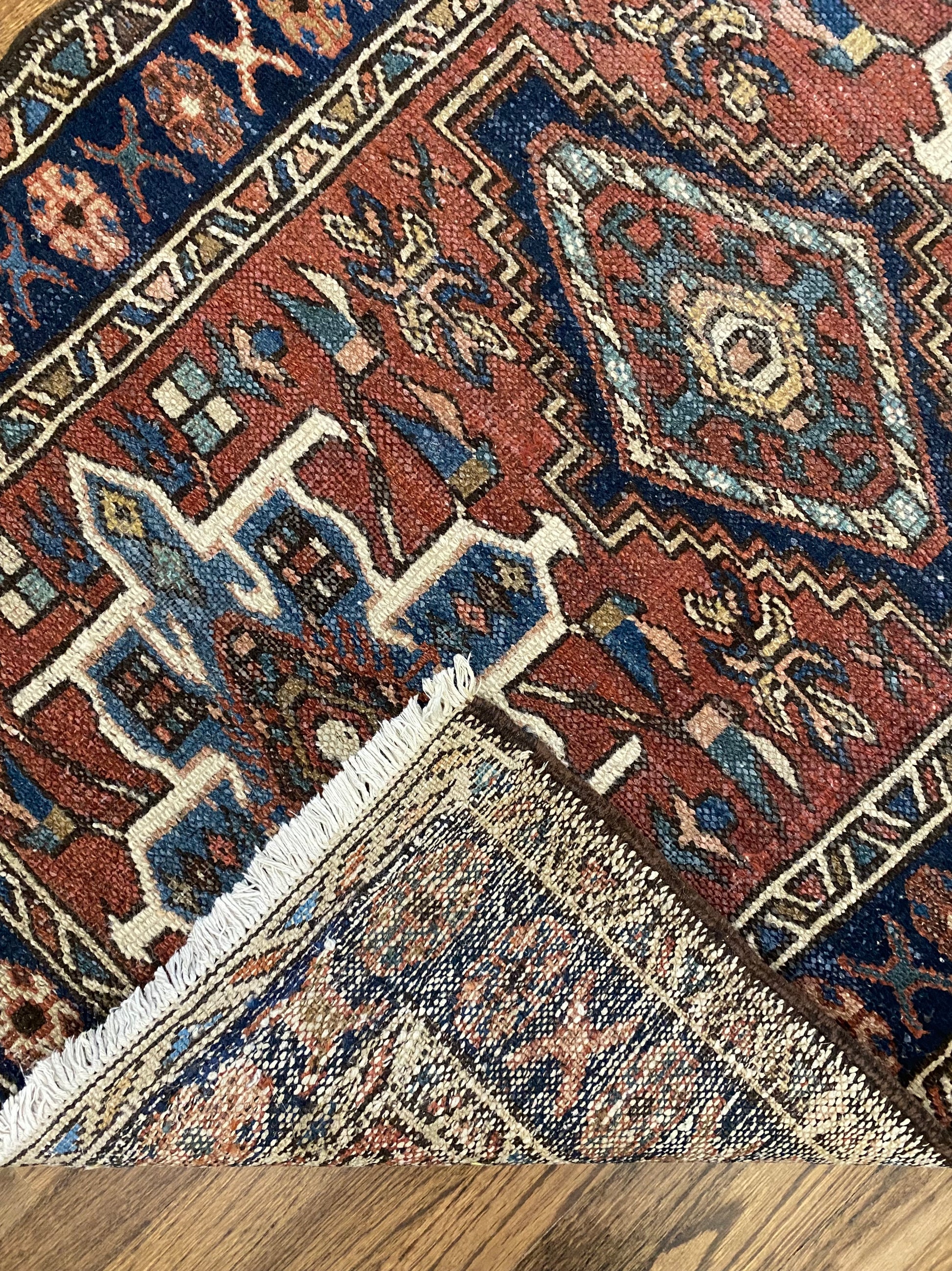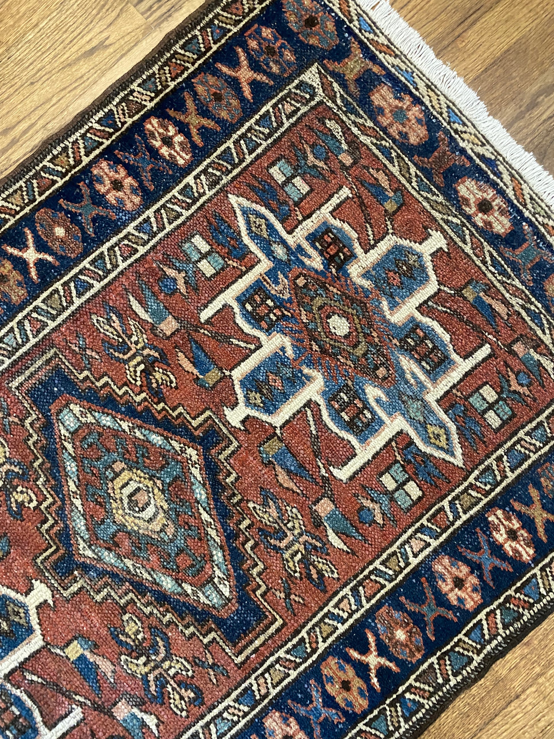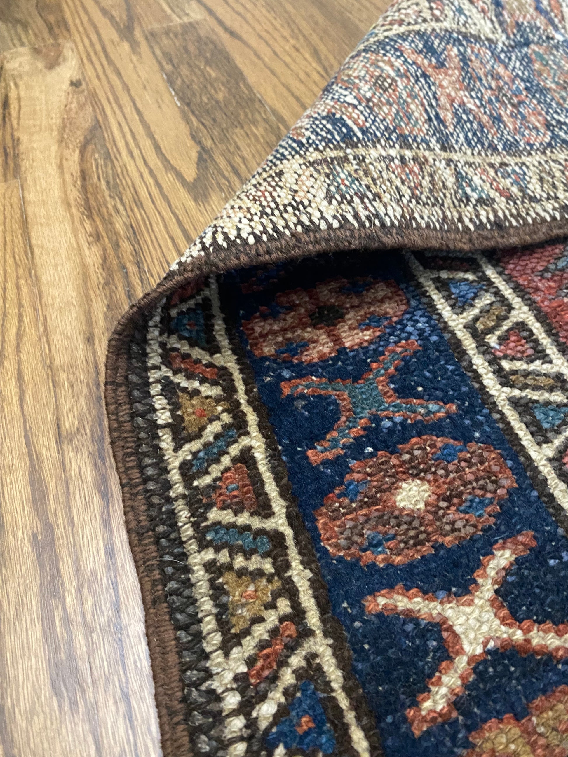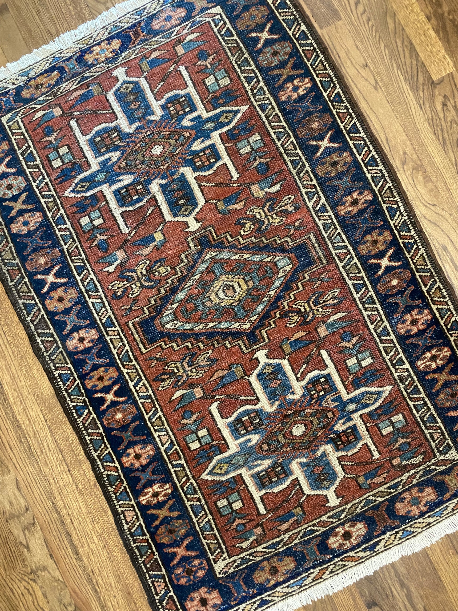 All of our rugs have been professionally cleaned prior to listing. We strive to deliver rugs that everyone loves, but please note that when you purchase from Two Sisters Rugs you are purchasing an item that is pre-owned and vintage by nature. Rugs might have areas of wear, minor repairs, or other unique characteristics, but we believe this is what makes them beautiful and one of a kind. Many rugs do not have perfect lines. All photographs are taken on an iPhone with no filter in natural light unless otherwise noted; colors may vary depending on the placement in your home. Colors may also vary depending on your phone or screen settings. If the area you are placing the rug has less natural light, the rug will appear darker in person. We aim to represent each rugs true colors and designs on the listing photos, but are happy to send additional photos upon request prior to purchase. High quality wool contains a substance called lanolin, which emits a metallic-y, but sweet and grassy scent. ALL SALES ARE FINAL.