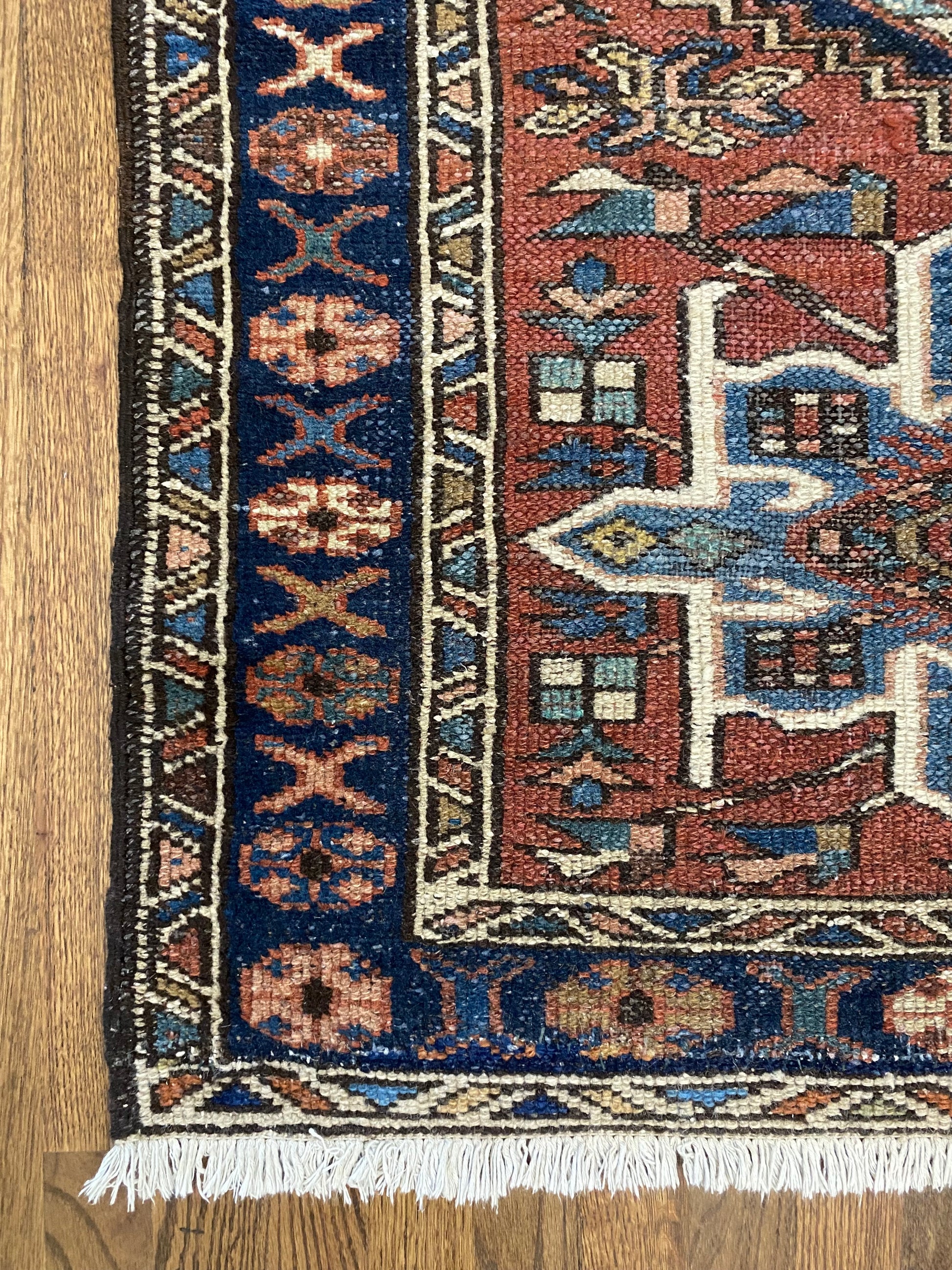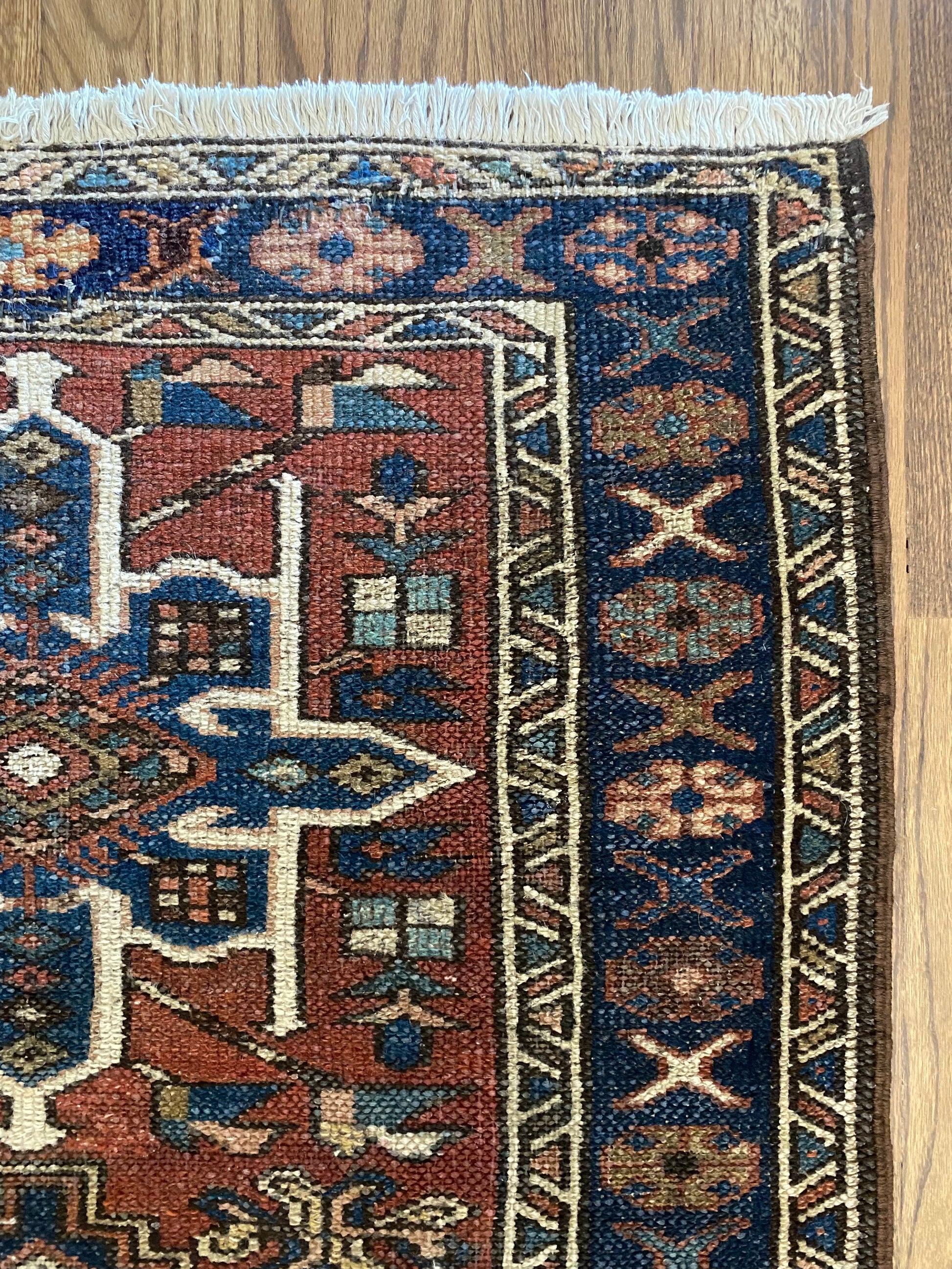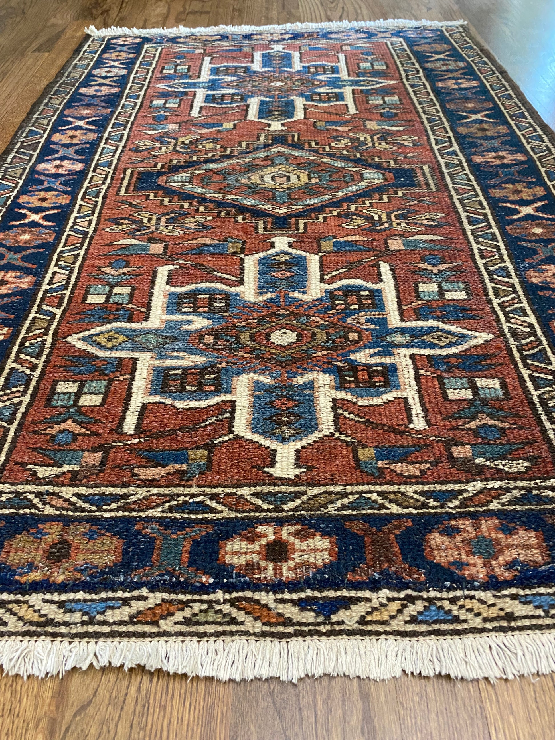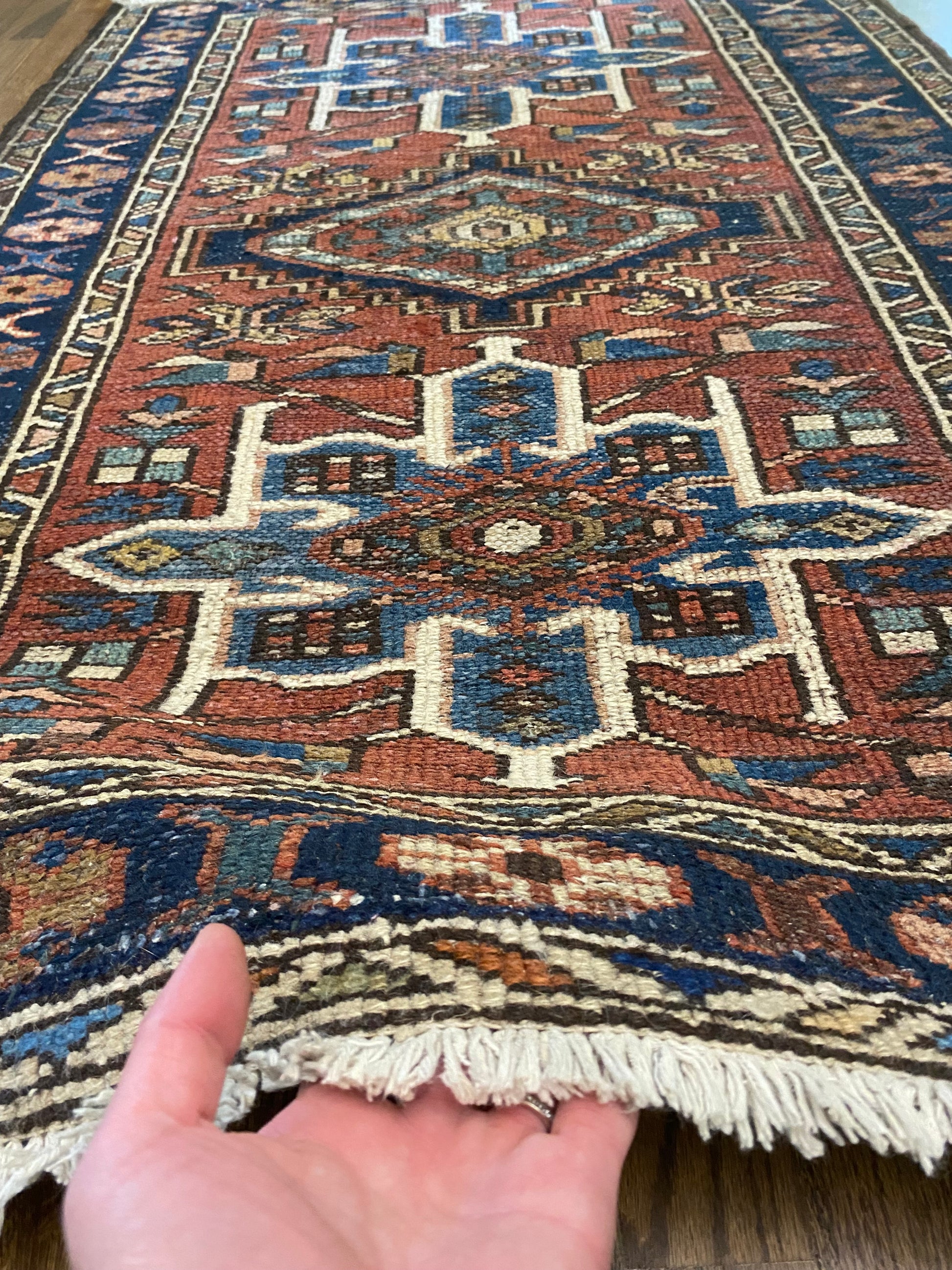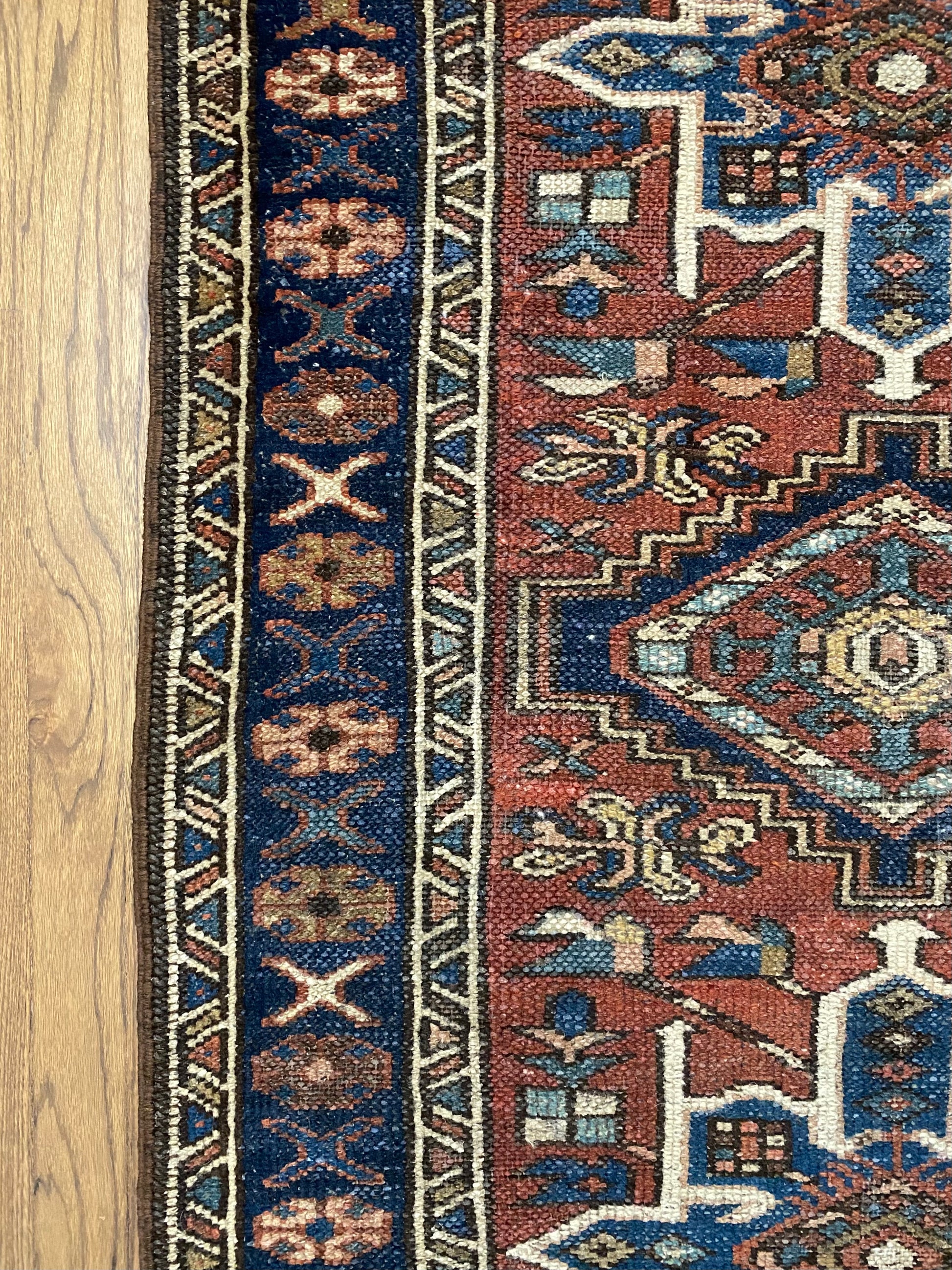 All of our rugs have been professionally cleaned prior to listing. We strive to deliver rugs that everyone loves, but please note that when you purchase from Two Sisters Rugs you are purchasing an item that is pre-owned and vintage by nature. Rugs might have areas of wear, minor repairs, or other unique characteristics, but we believe this is what makes them beautiful and one of a kind. Many rugs do not have perfect lines. All photographs are taken on an iPhone with no filter in natural light unless otherwise noted; colors may vary depending on the placement in your home. Colors may also vary depending on your phone or screen settings. If the area you are placing the rug has less natural light, the rug will appear darker in person. We aim to represent each rugs true colors and designs on the listing photos, but are happy to send additional photos upon request prior to purchase. High quality wool contains a substance called lanolin, which emits a metallic-y, but sweet and grassy scent. ALL SALES ARE FINAL.