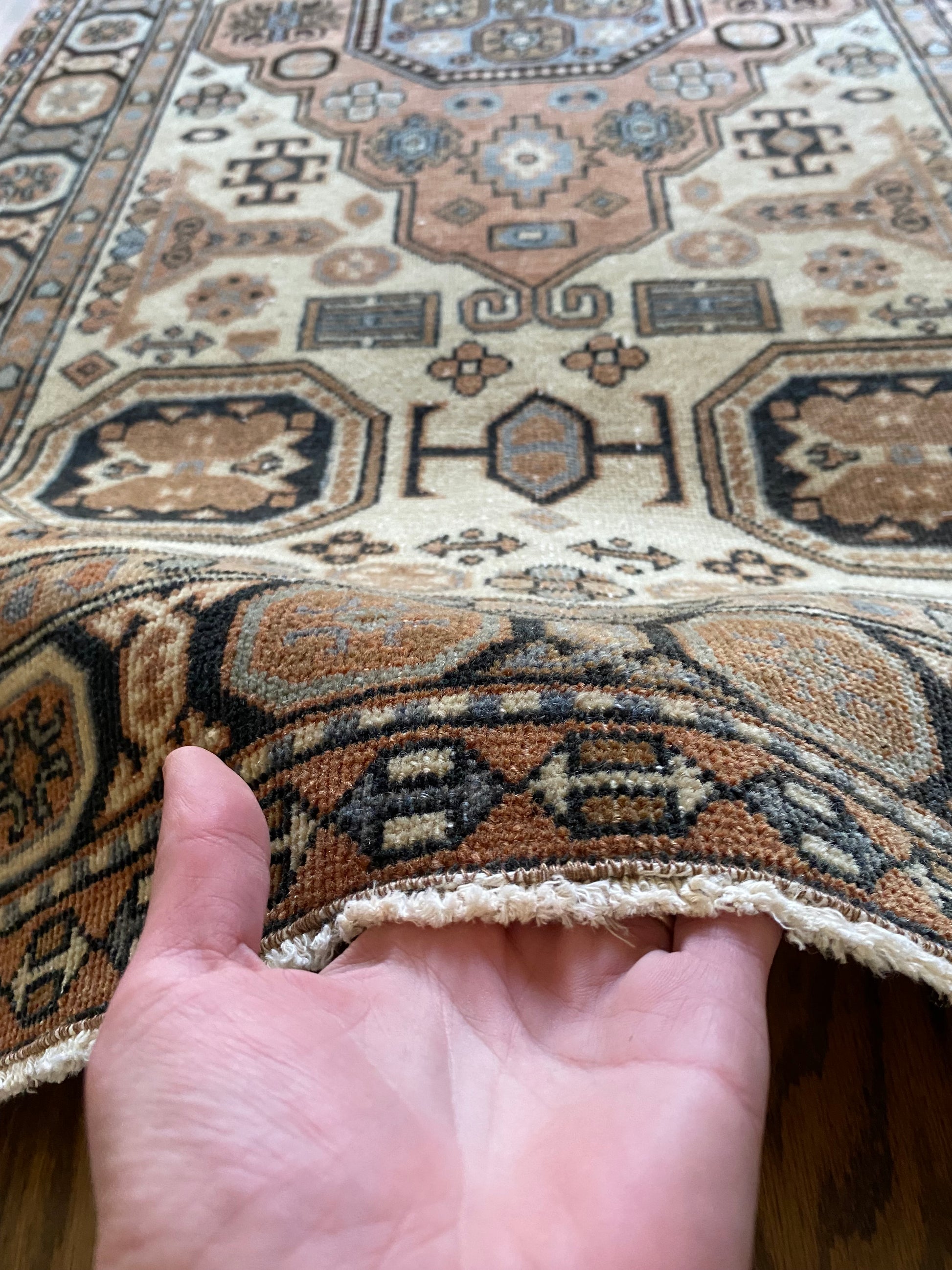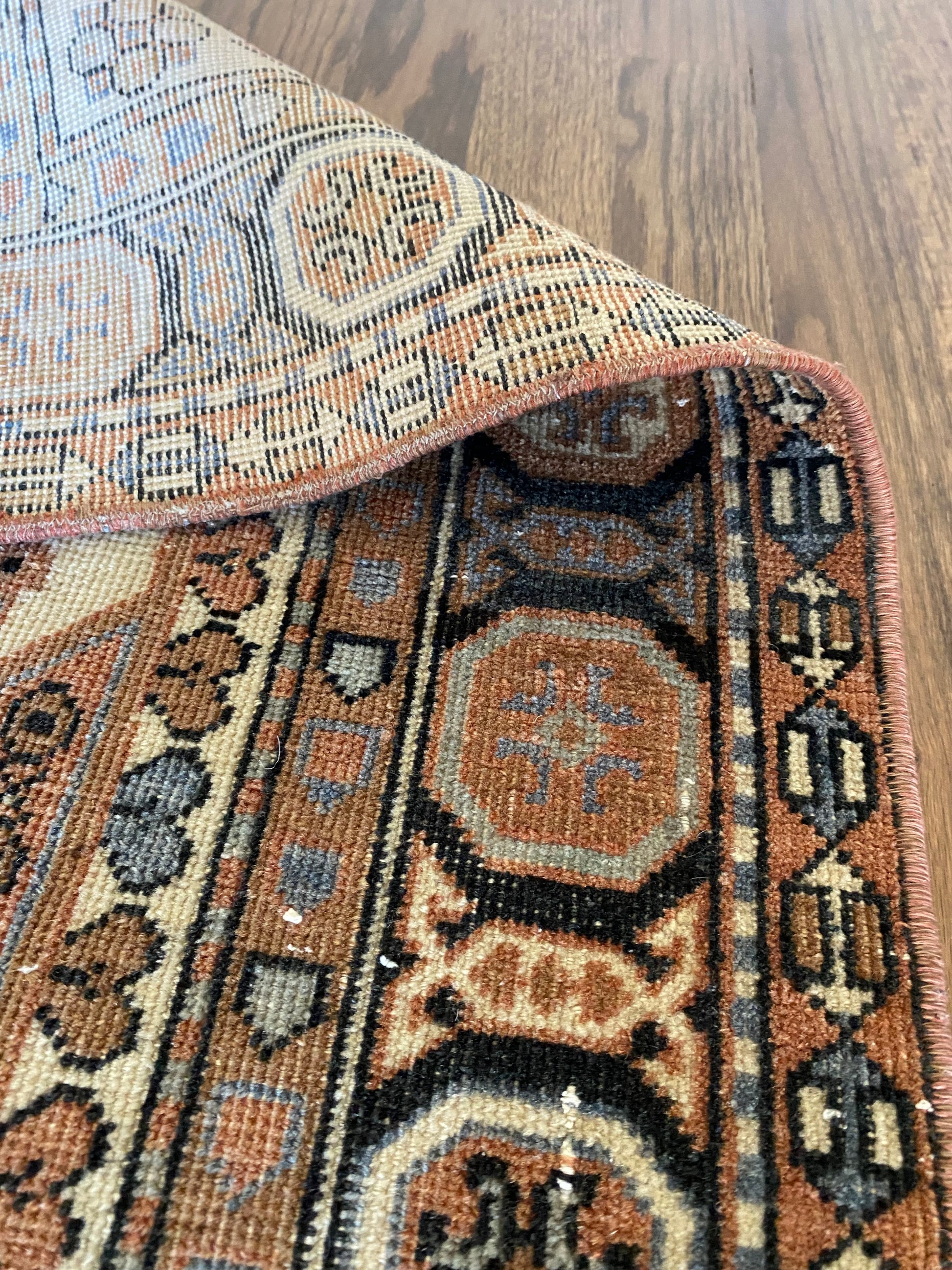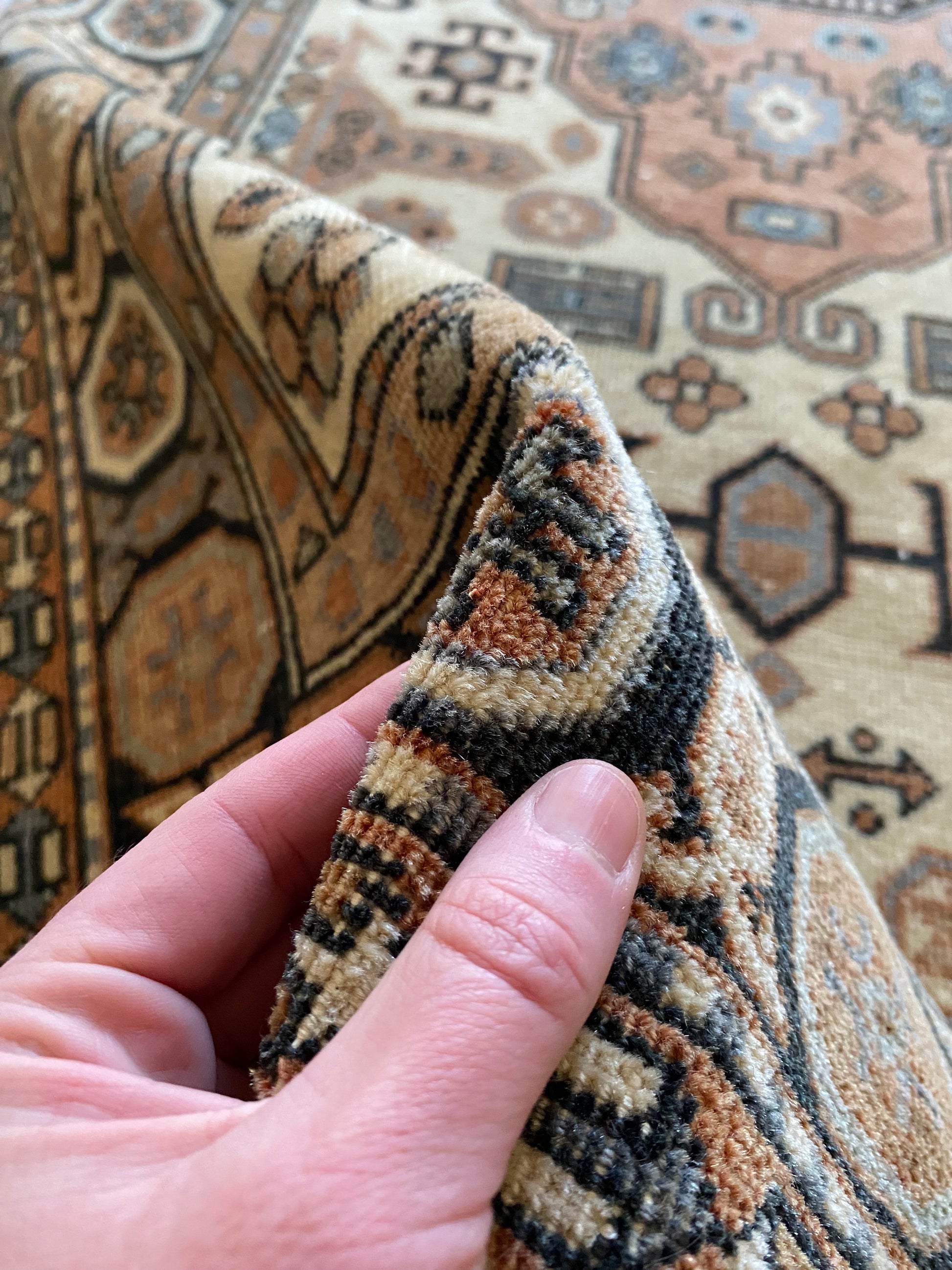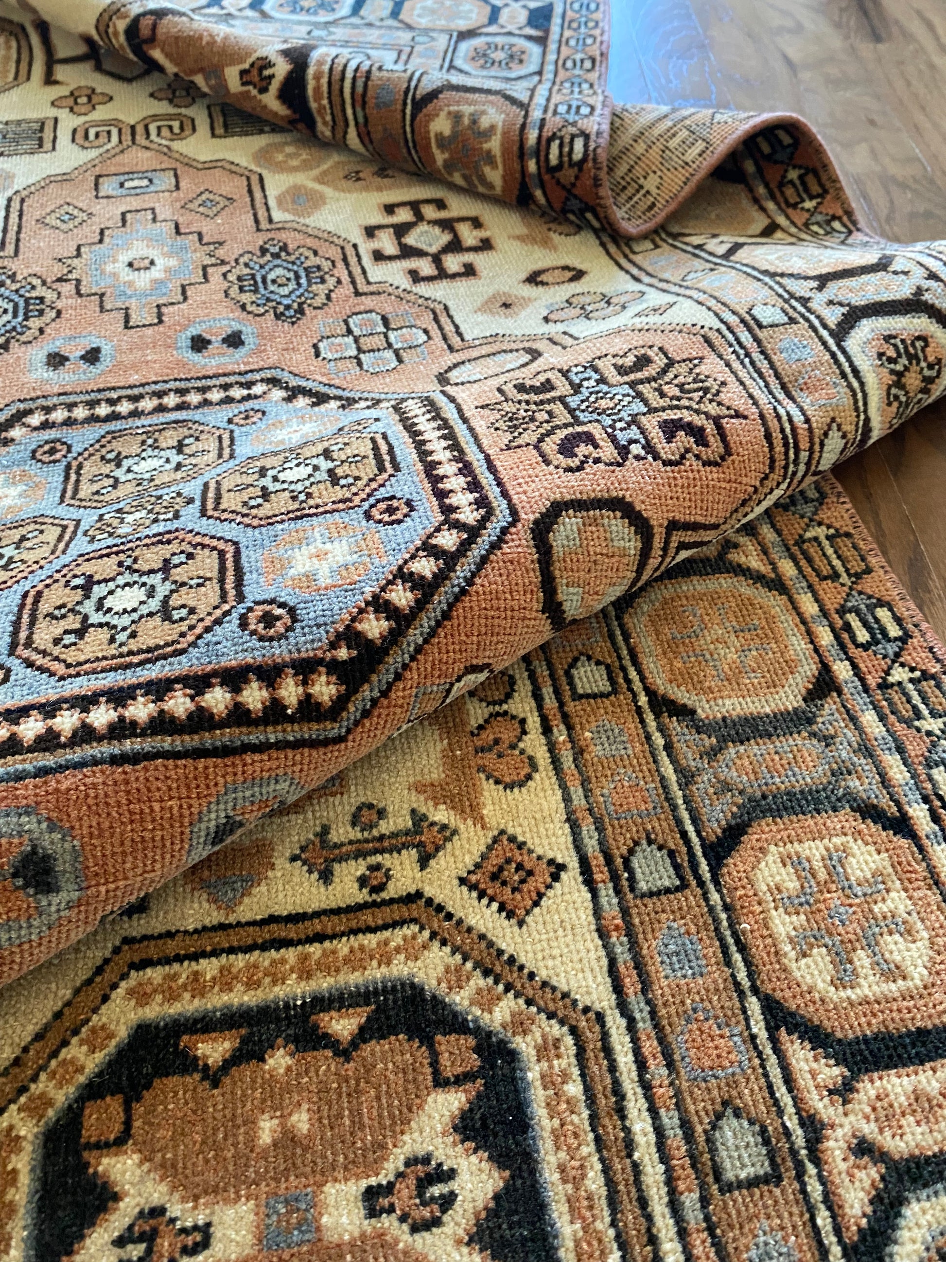 All of our rugs have been professionally cleaned prior to listing. We strive to deliver rugs that everyone loves, but please note that when you purchase from Two Sisters Rugs you are purchasing an item that is pre-owned and vintage by nature. Rugs might have areas of wear, minor repairs, or other unique characteristics, but we believe this is what makes them beautiful and one of a kind. Many rugs do not have perfect lines. All photographs are taken on an iPhone with no filter in natural light unless otherwise noted; colors may vary depending on the placement in your home. Colors may also vary depending on your phone or screen settings. If the area you are placing the rug has less natural light, the rug will appear darker in person. We aim to represent each rugs true colors and designs on the listing photos, but are happy to send additional photos upon request prior to purchase. High quality wool contains a substance called lanolin, which emits a metallic-y, but sweet and grassy scent. ALL SALES ARE FINAL.
