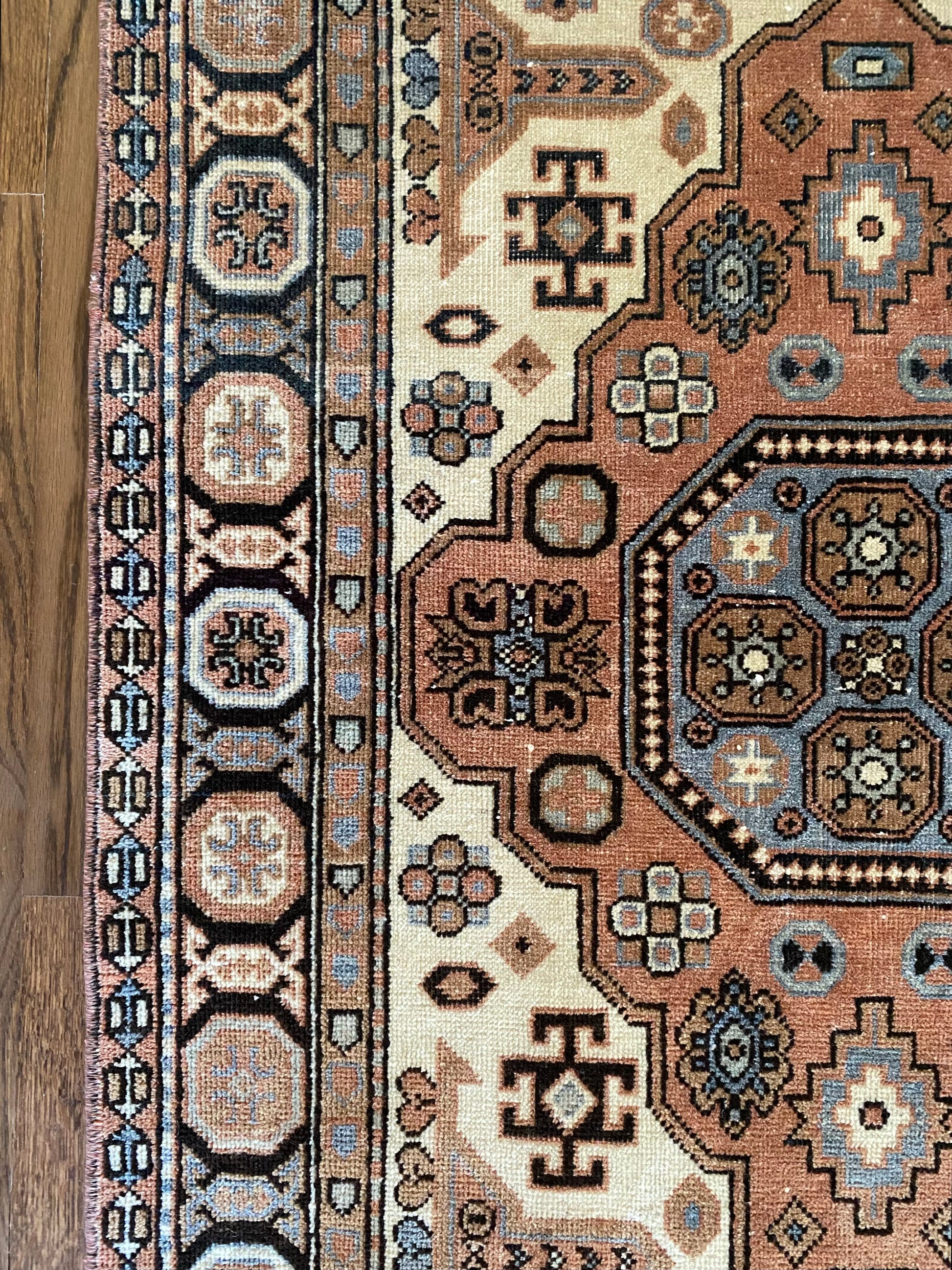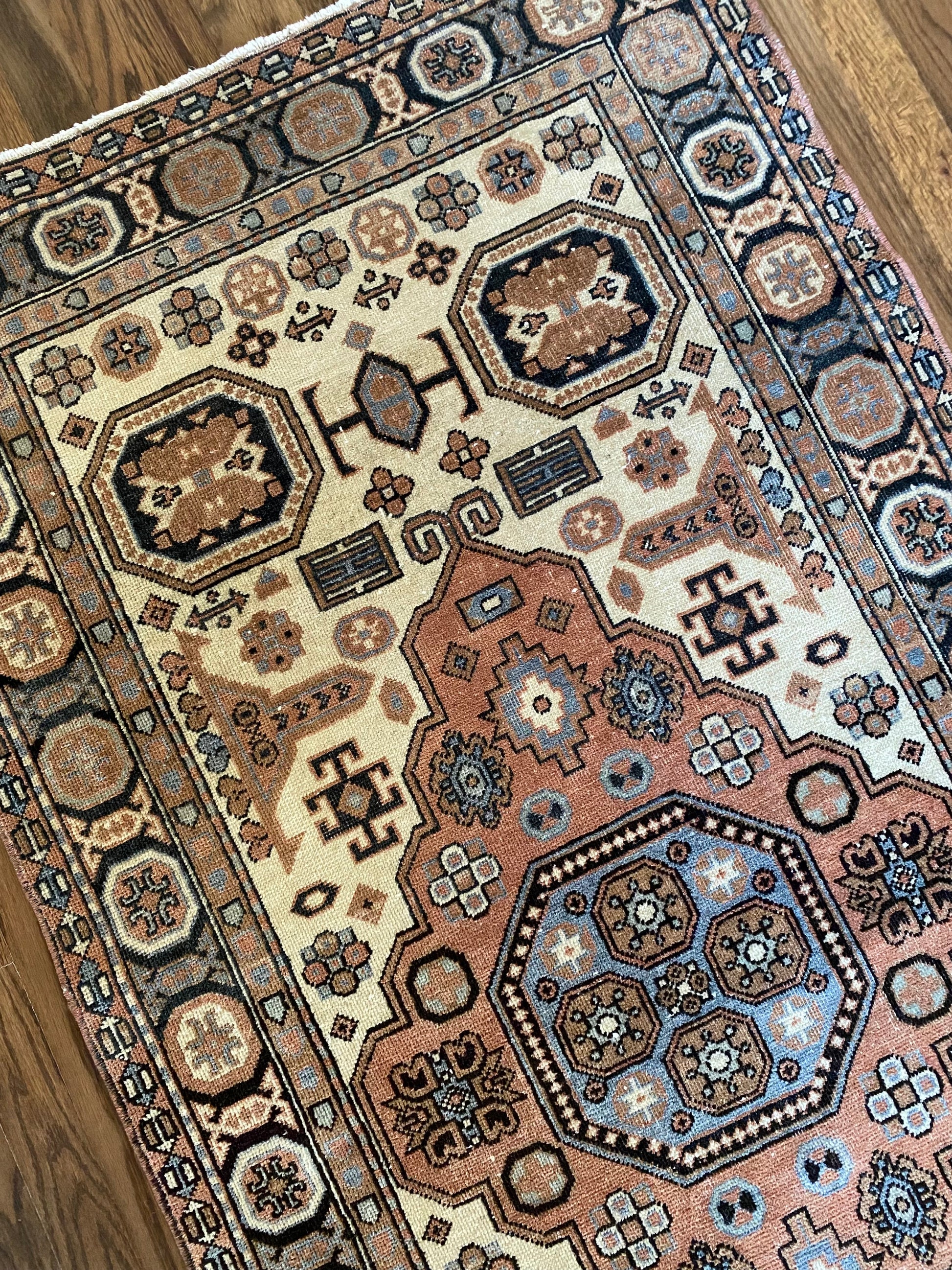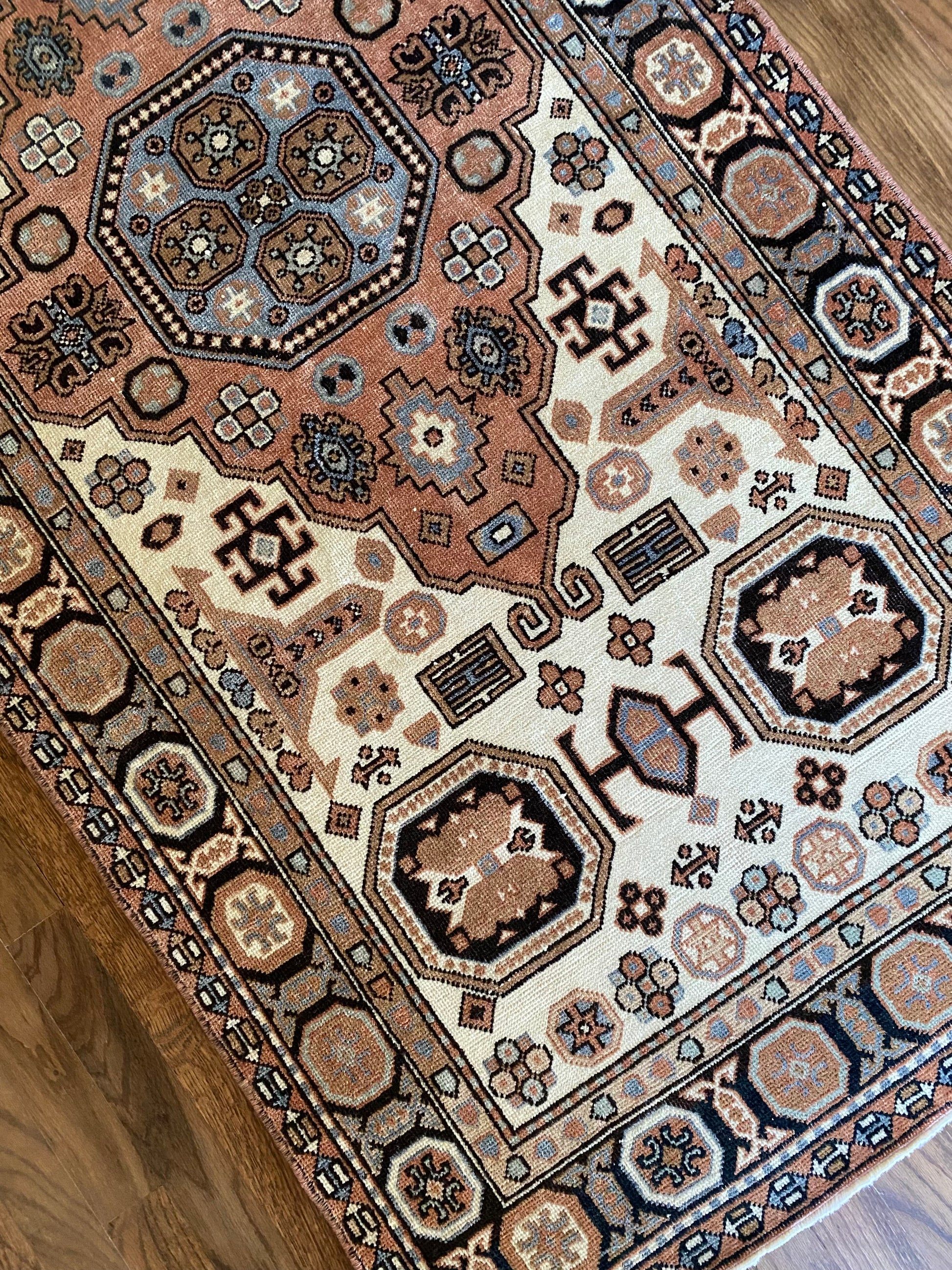 All of our rugs have been professionally cleaned prior to listing. We strive to deliver rugs that everyone loves, but please note that when you purchase from Two Sisters Rugs you are purchasing an item that is pre-owned and vintage by nature. Rugs might have areas of wear, minor repairs, or other unique characteristics, but we believe this is what makes them beautiful and one of a kind. Many rugs do not have perfect lines. All photographs are taken on an iPhone with no filter in natural light unless otherwise noted; colors may vary depending on the placement in your home. Colors may also vary depending on your phone or screen settings. If the area you are placing the rug has less natural light, the rug will appear darker in person. We aim to represent each rugs true colors and designs on the listing photos, but are happy to send additional photos upon request prior to purchase. High quality wool contains a substance called lanolin, which emits a metallic-y, but sweet and grassy scent. ALL SALES ARE FINAL.
