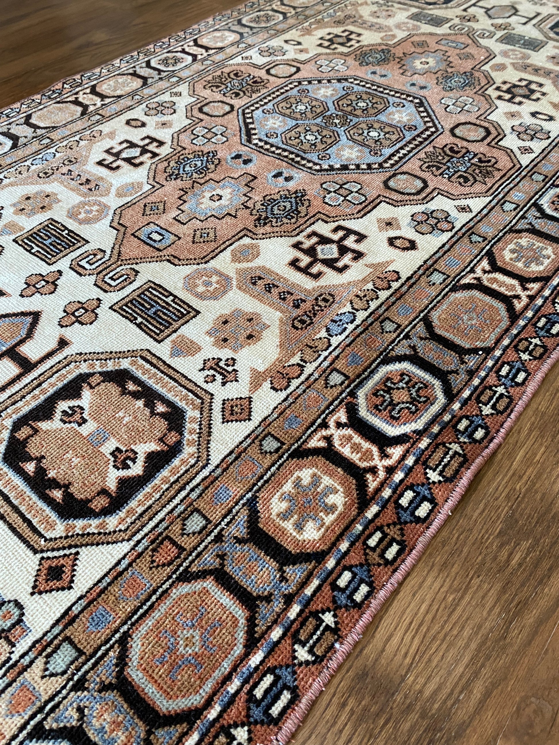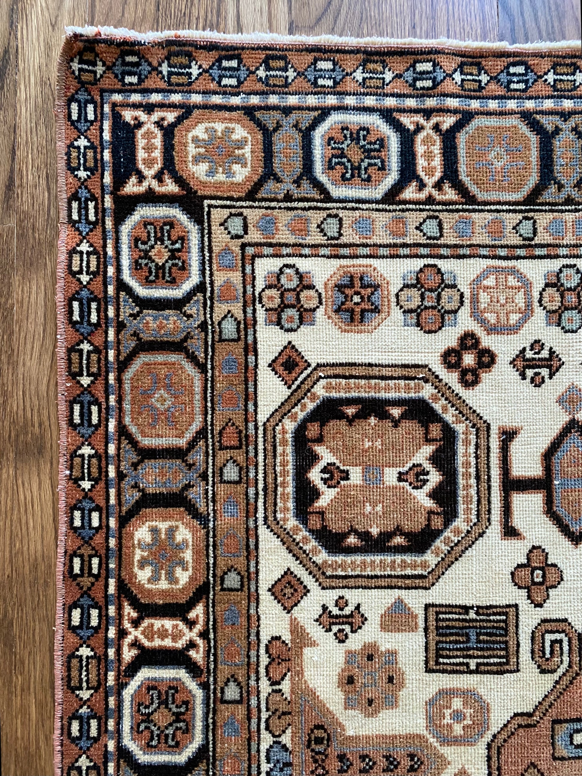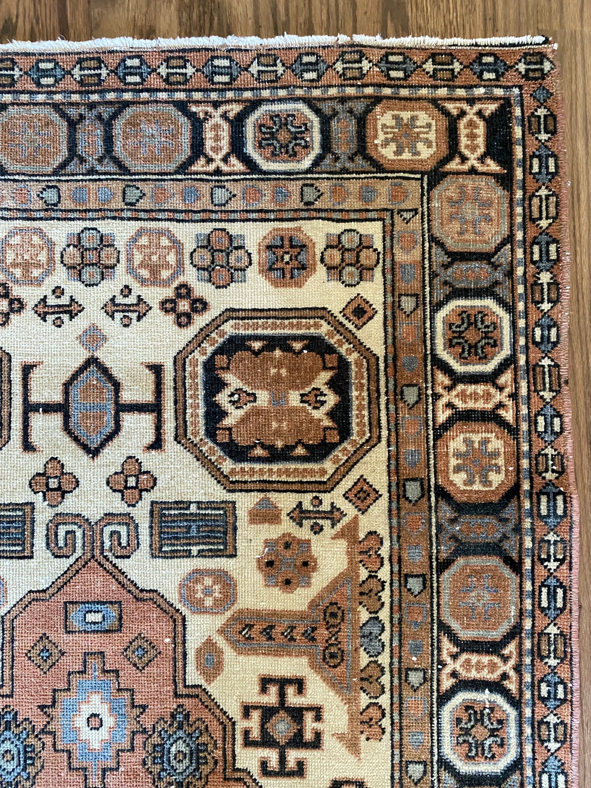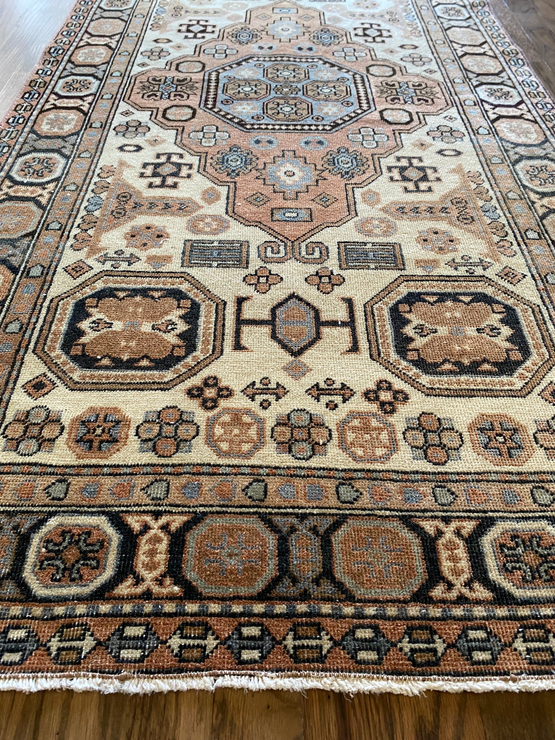 All of our rugs have been professionally cleaned prior to listing. We strive to deliver rugs that everyone loves, but please note that when you purchase from Two Sisters Rugs you are purchasing an item that is pre-owned and vintage by nature. Rugs might have areas of wear, minor repairs, or other unique characteristics, but we believe this is what makes them beautiful and one of a kind. Many rugs do not have perfect lines. All photographs are taken on an iPhone with no filter in natural light unless otherwise noted; colors may vary depending on the placement in your home. Colors may also vary depending on your phone or screen settings. If the area you are placing the rug has less natural light, the rug will appear darker in person. We aim to represent each rugs true colors and designs on the listing photos, but are happy to send additional photos upon request prior to purchase. High quality wool contains a substance called lanolin, which emits a metallic-y, but sweet and grassy scent. ALL SALES ARE FINAL.