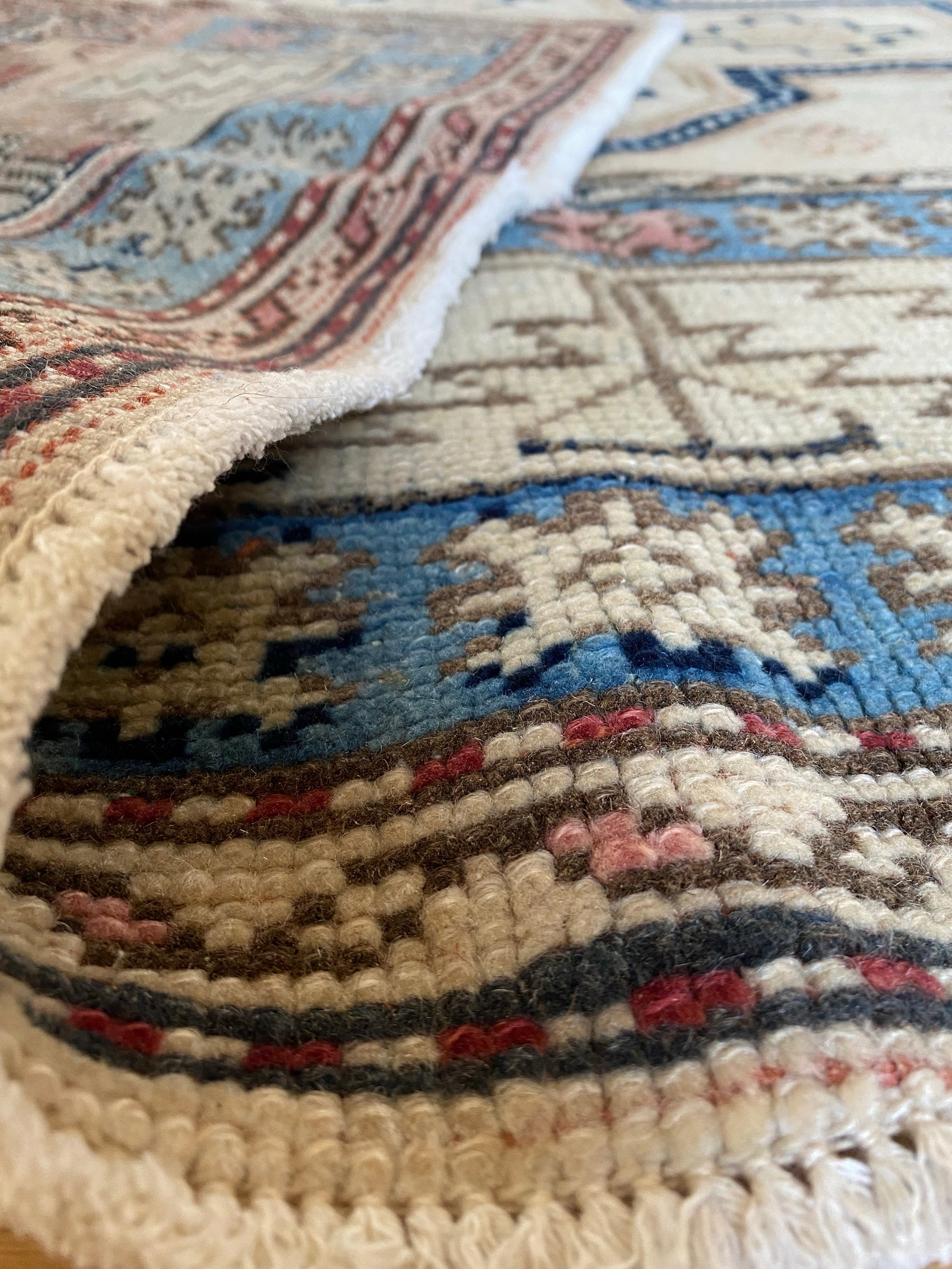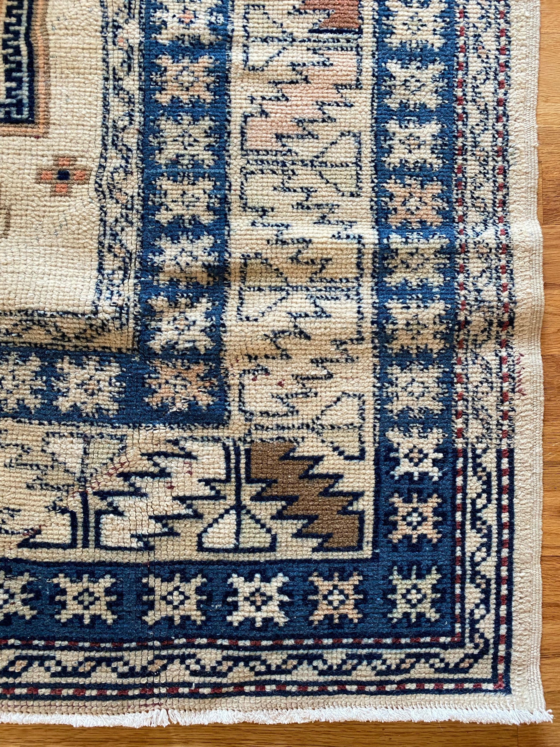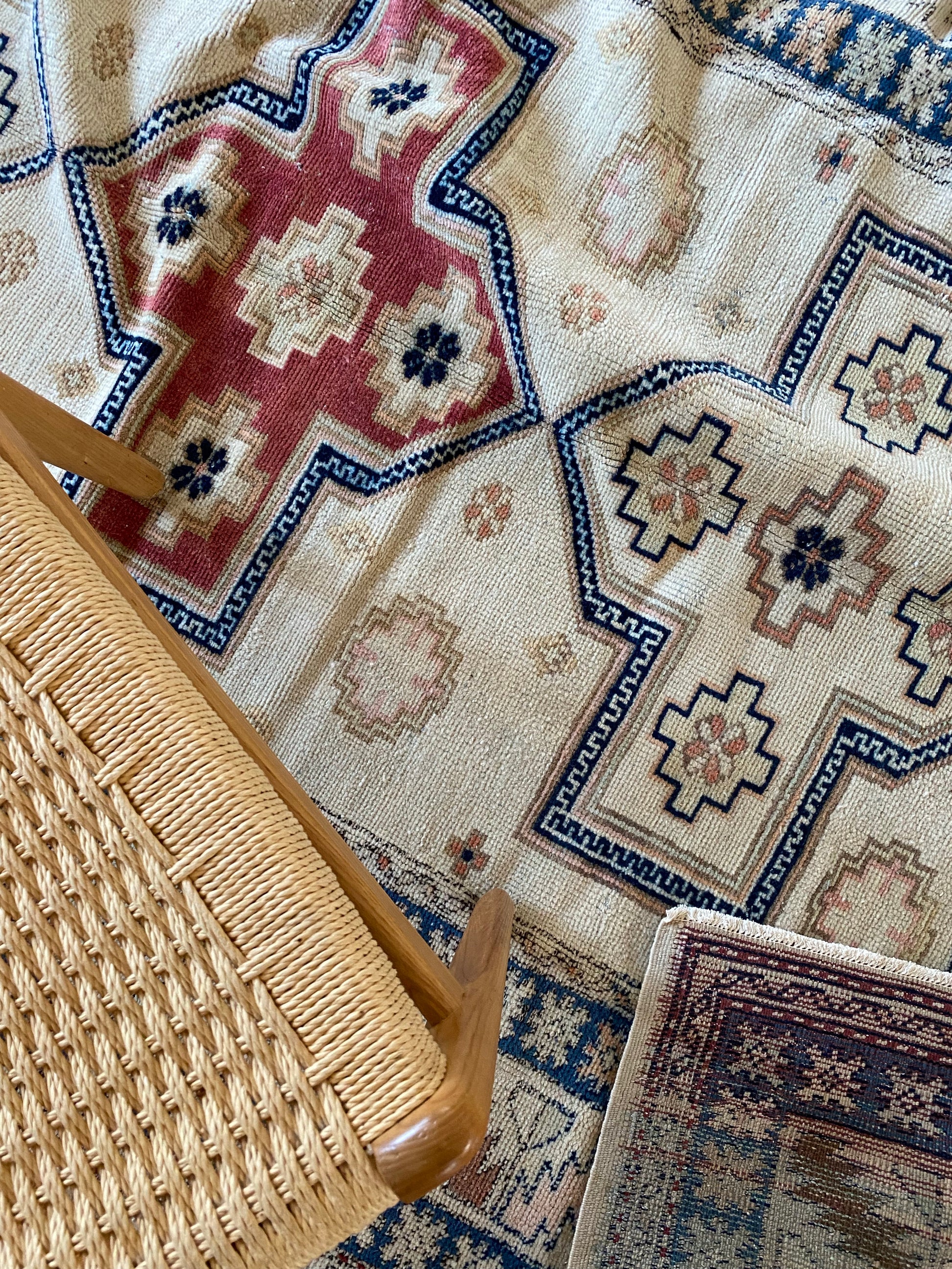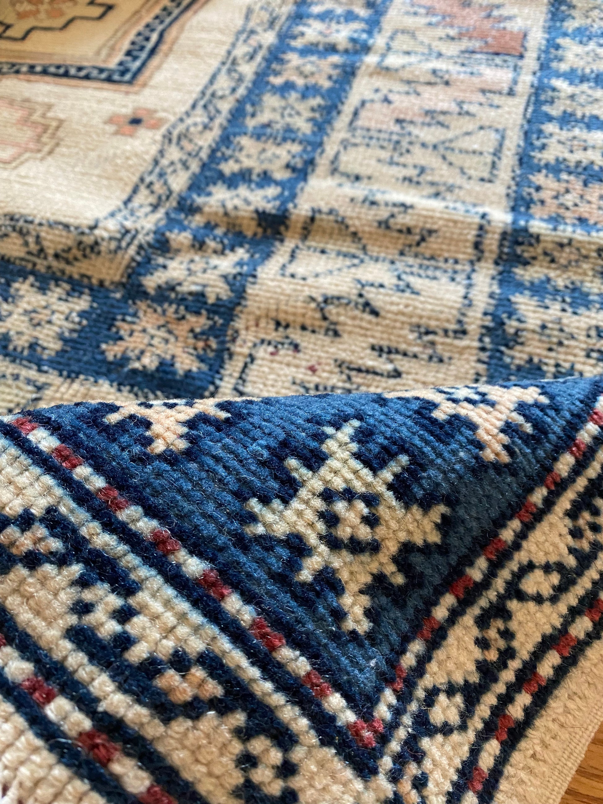 All of our rugs have been professionally cleaned prior to listing. These unique vintage rugs have normal wear related to their age. Some may have minor repairs. All photographs are taken in natural light; colors may vary depending on the placement in your home. Many rugs do not have perfect lines-we believe this adds to the authenticity of these hand-woven beauties. High quality wool contains a substance called lanolin, which emits a metallic-y, but sweet and grassy scent. ALL SALES FINAL.