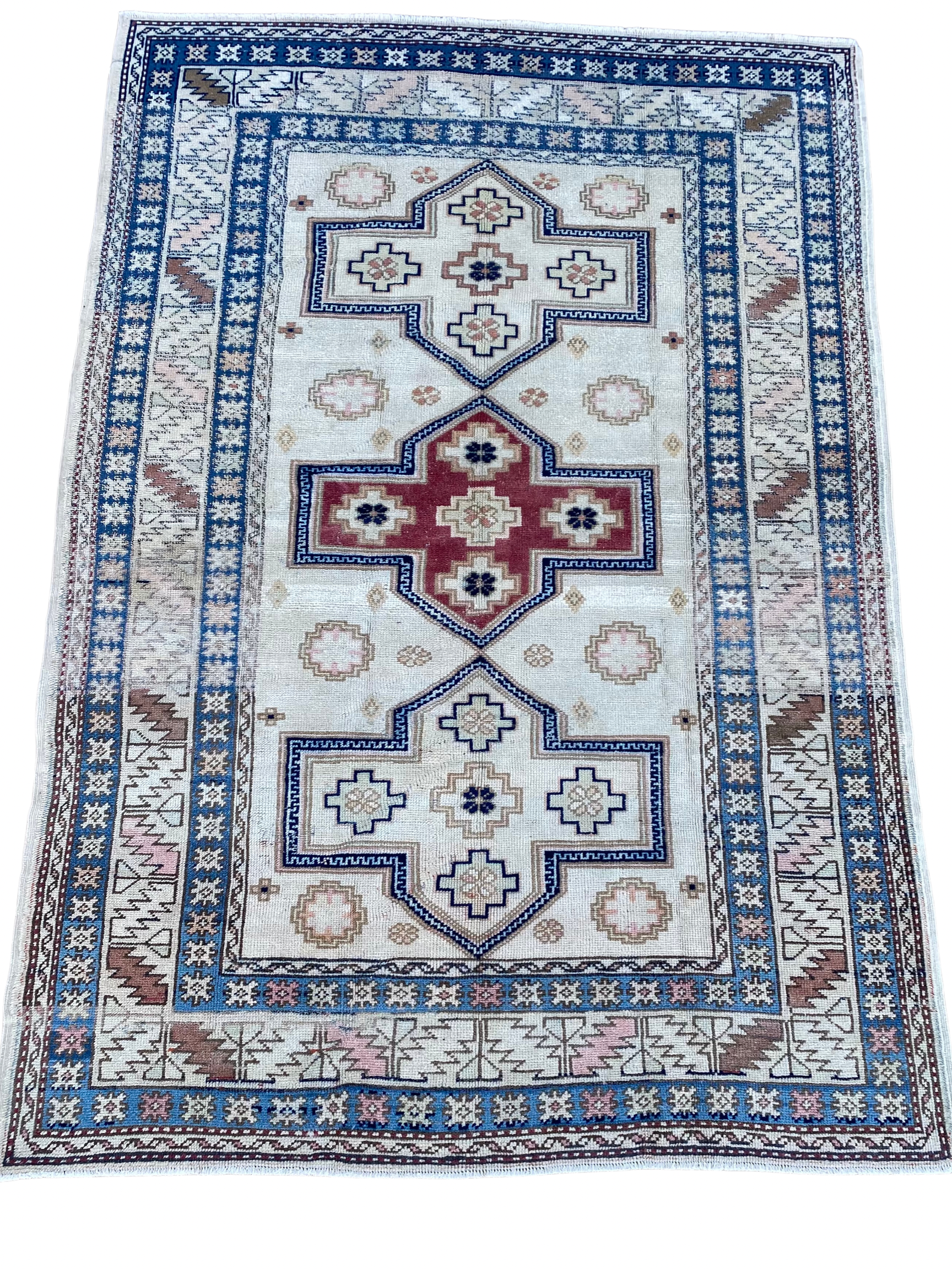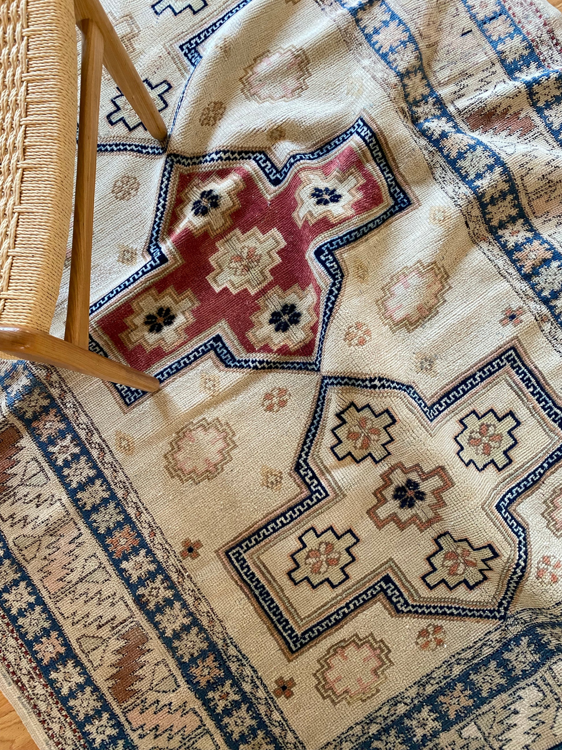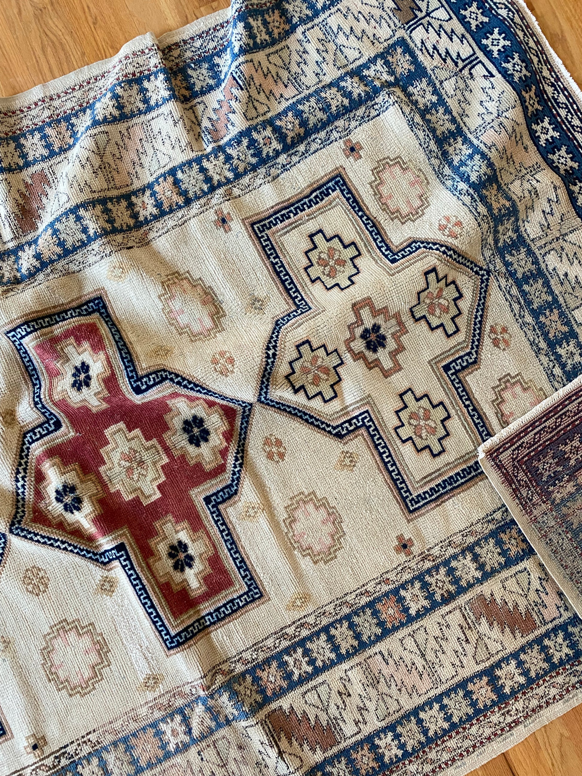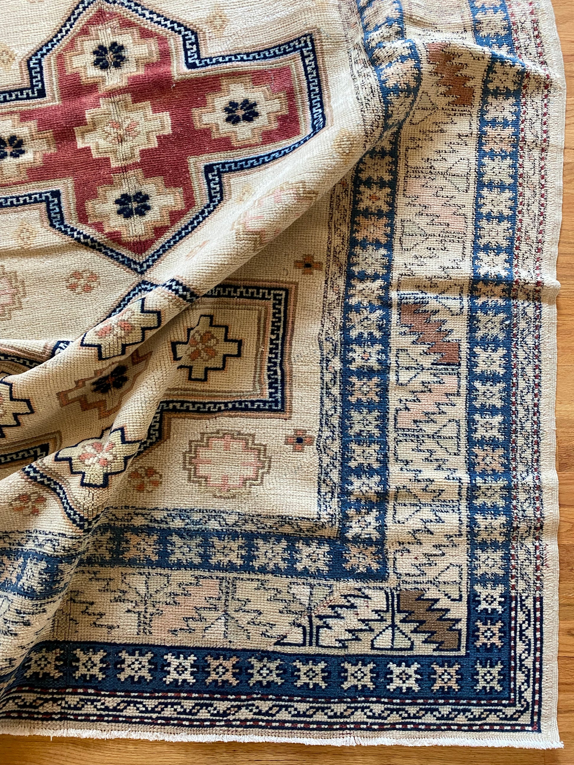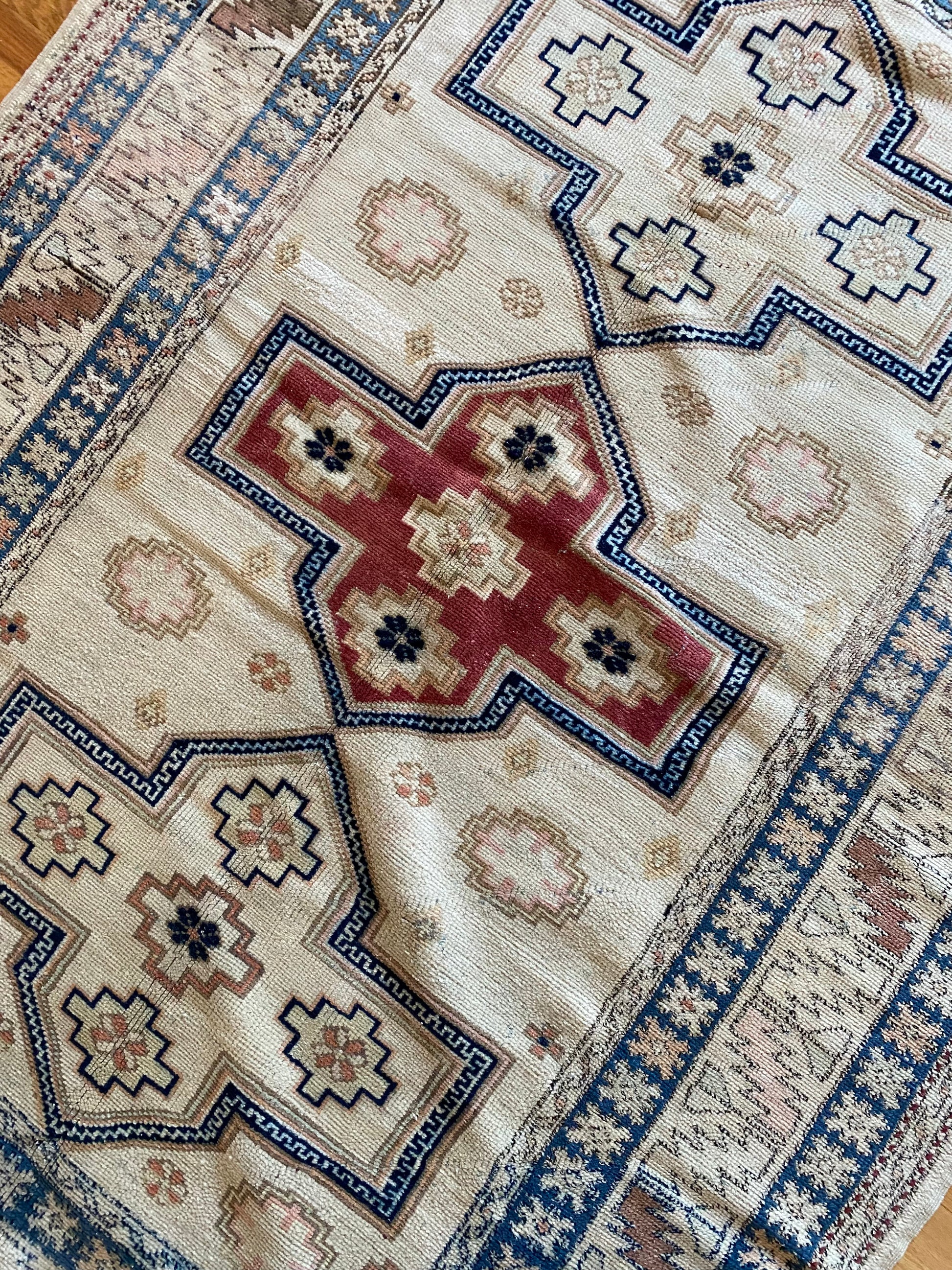 All of our rugs have been professionally cleaned prior to listing. These unique vintage rugs have normal wear related to their age. Some may have minor repairs. All photographs are taken in natural light; colors may vary depending on the placement in your home. Many rugs do not have perfect lines-we believe this adds to the authenticity of these hand-woven beauties. High quality wool contains a substance called lanolin, which emits a metallic-y, but sweet and grassy scent. ALL SALES FINAL.