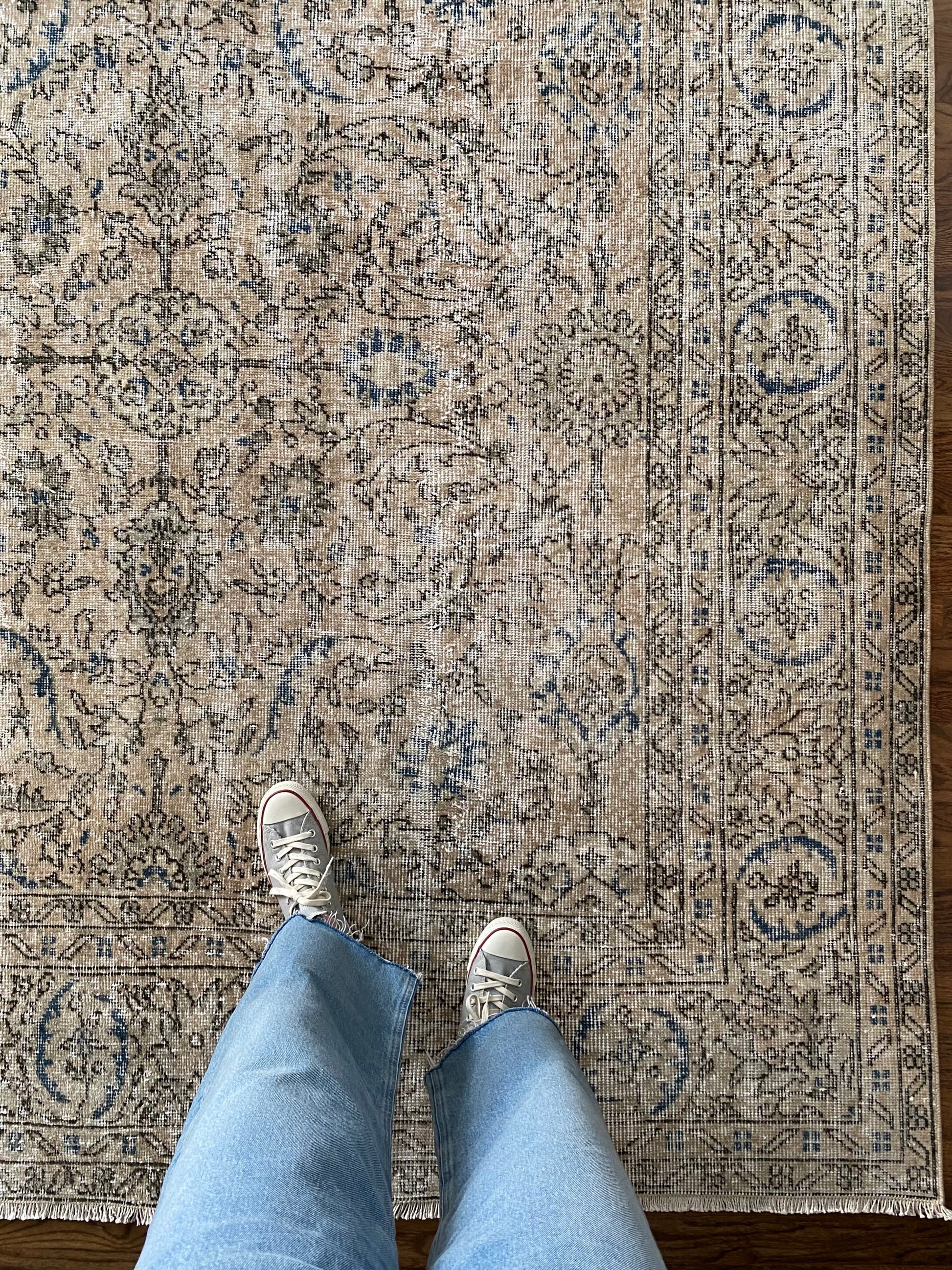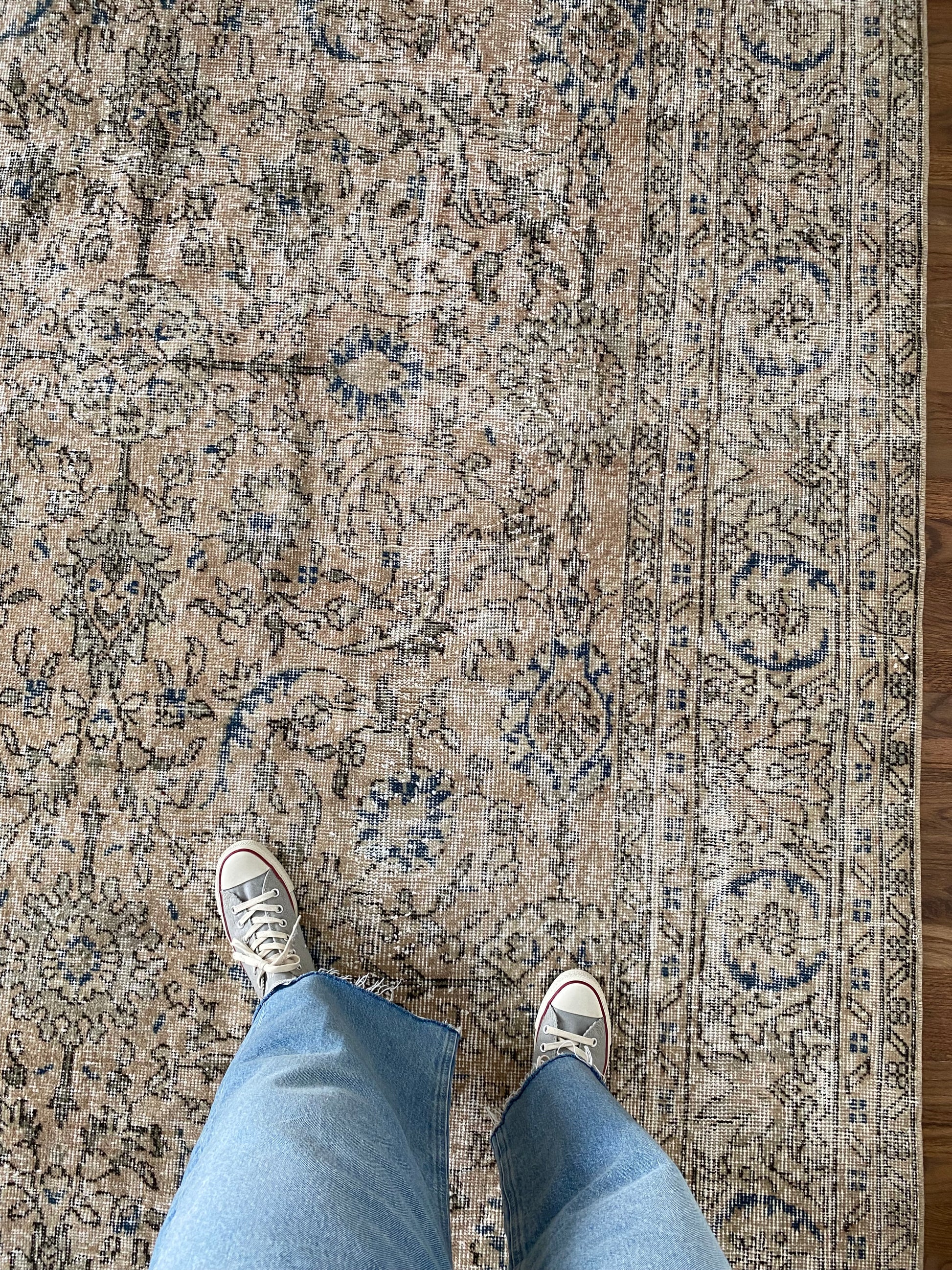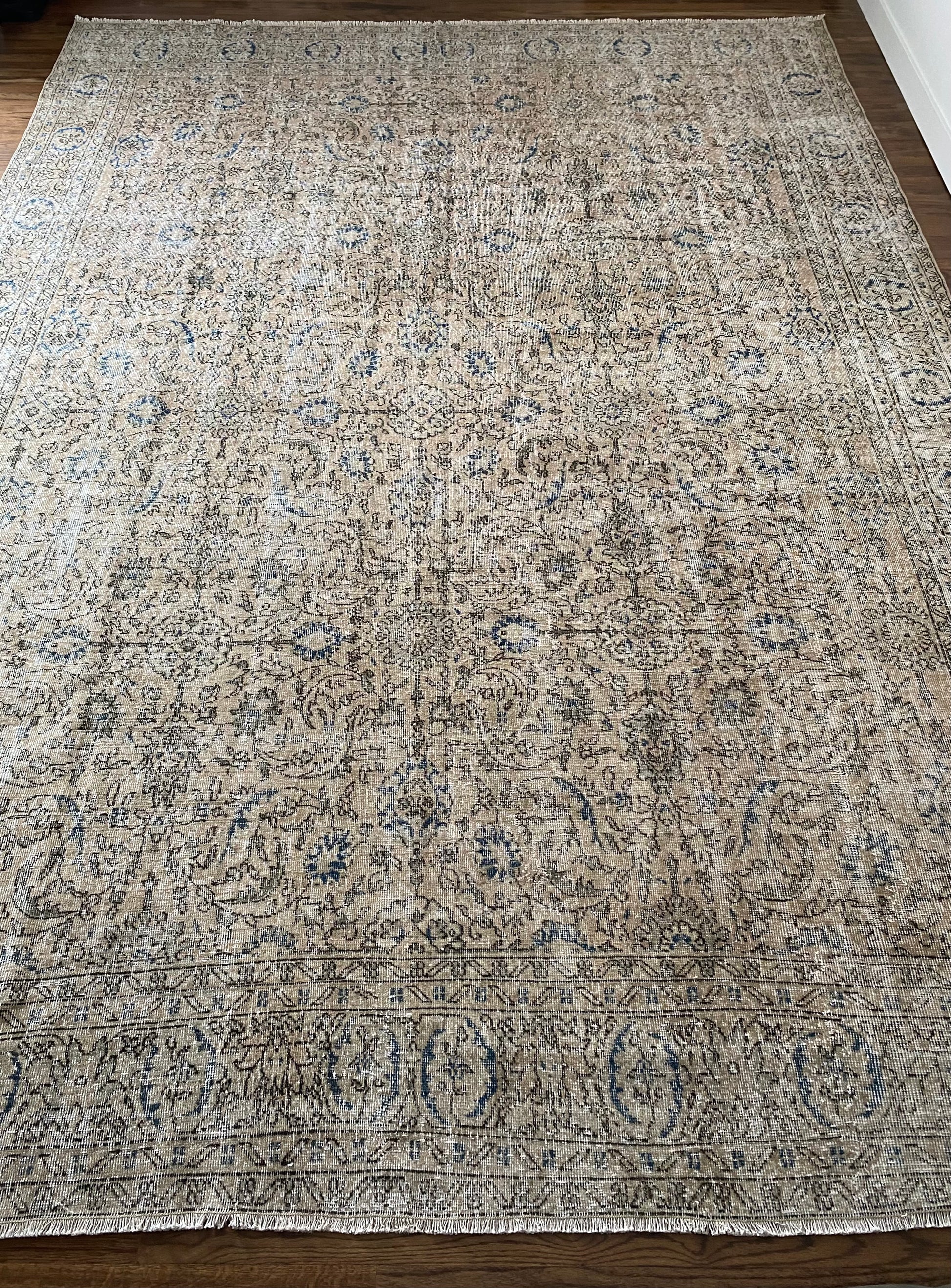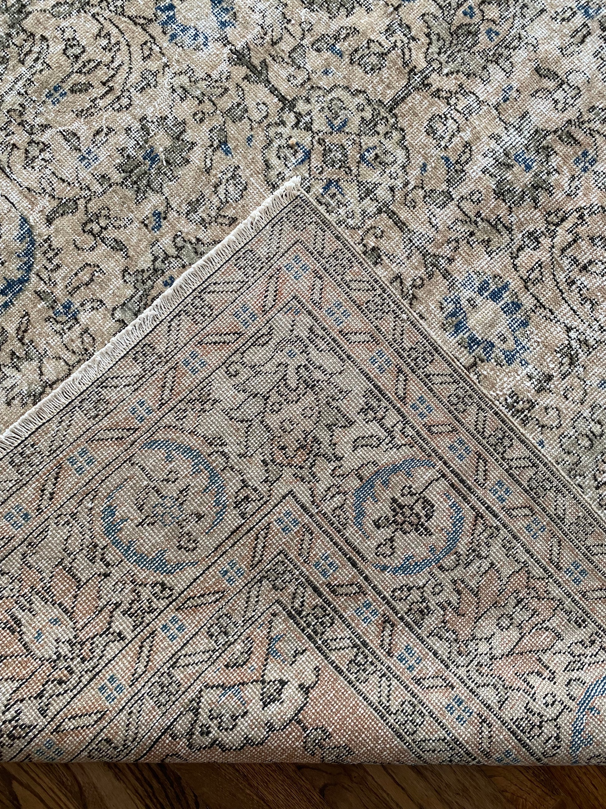 All of our rugs have been professionally cleaned prior to listing. We strive to deliver rugs that everyone loves, but please note that when you purchase from Two Sisters Rugs you are purchasing an item that is pre-owned and vintage by nature. Rugs might have areas of wear, minor repairs, or other unique characteristics, but we believe this is what makes them beautiful and one of a kind. Many rugs do not have perfect lines. All photographs are taken on an iPhone with no filter in natural light unless otherwise noted; colors may vary depending on the placement in your home. Colors may also vary depending on your phone or screen settings. If the area you are placing the rug has less natural light, the rug will appear darker in person. We aim to represent each rugs true colors and designs on the listing photos, but are happy to send additional photos upon request prior to purchase. High quality wool contains a substance called lanolin, which emits a metallic-y, but sweet and grassy scent. ALL SALES ARE FINAL.