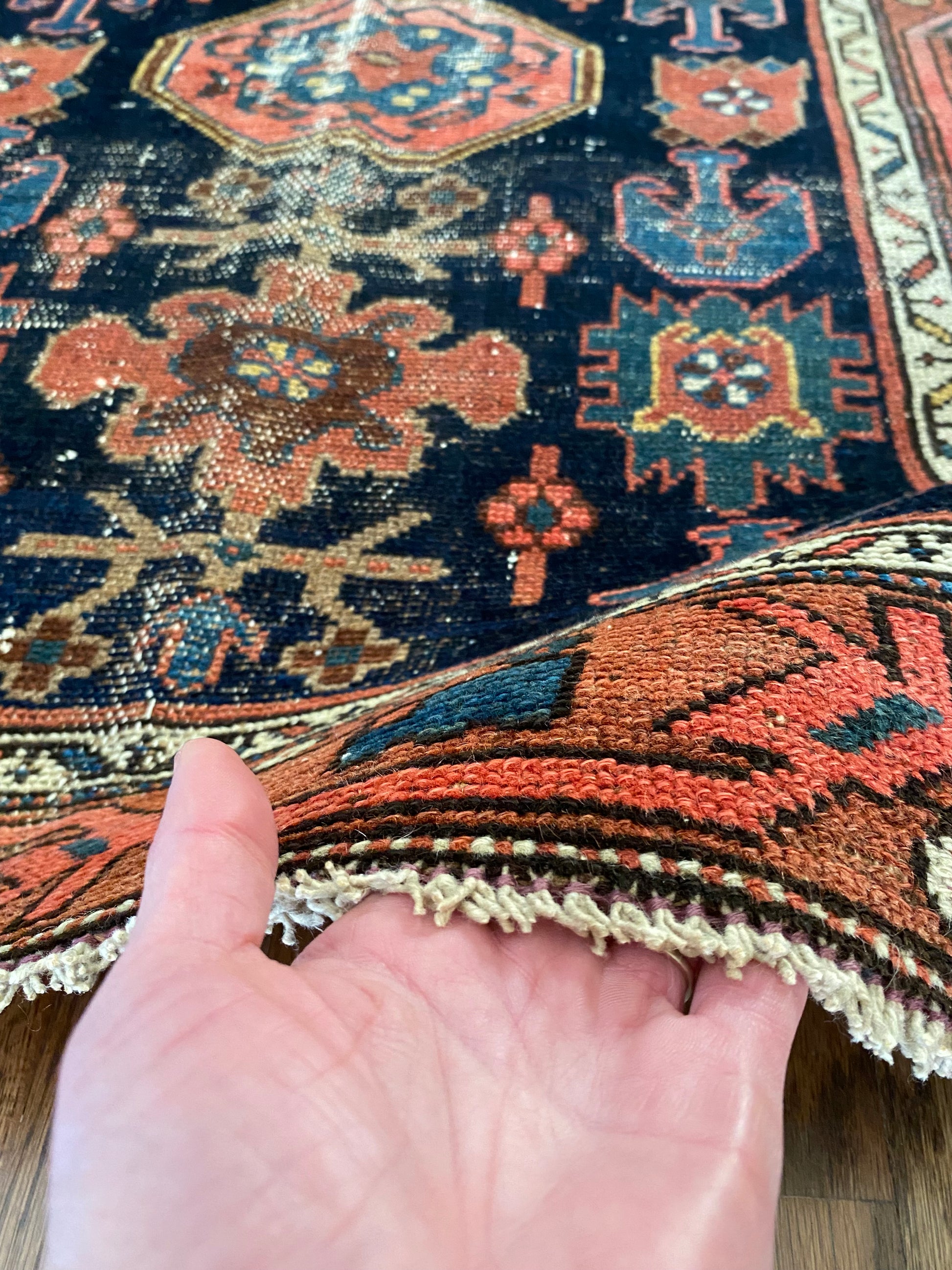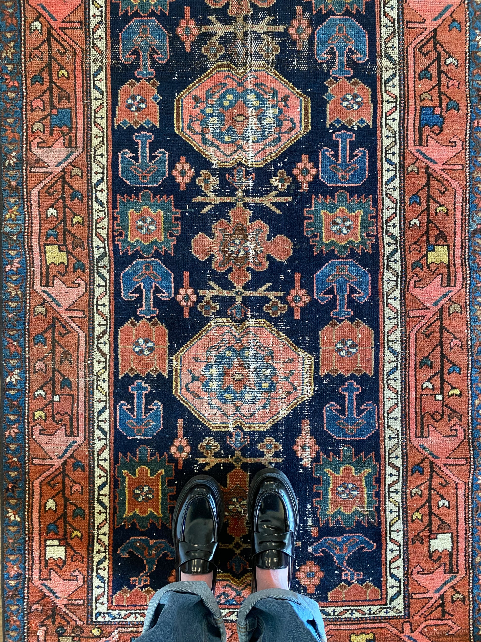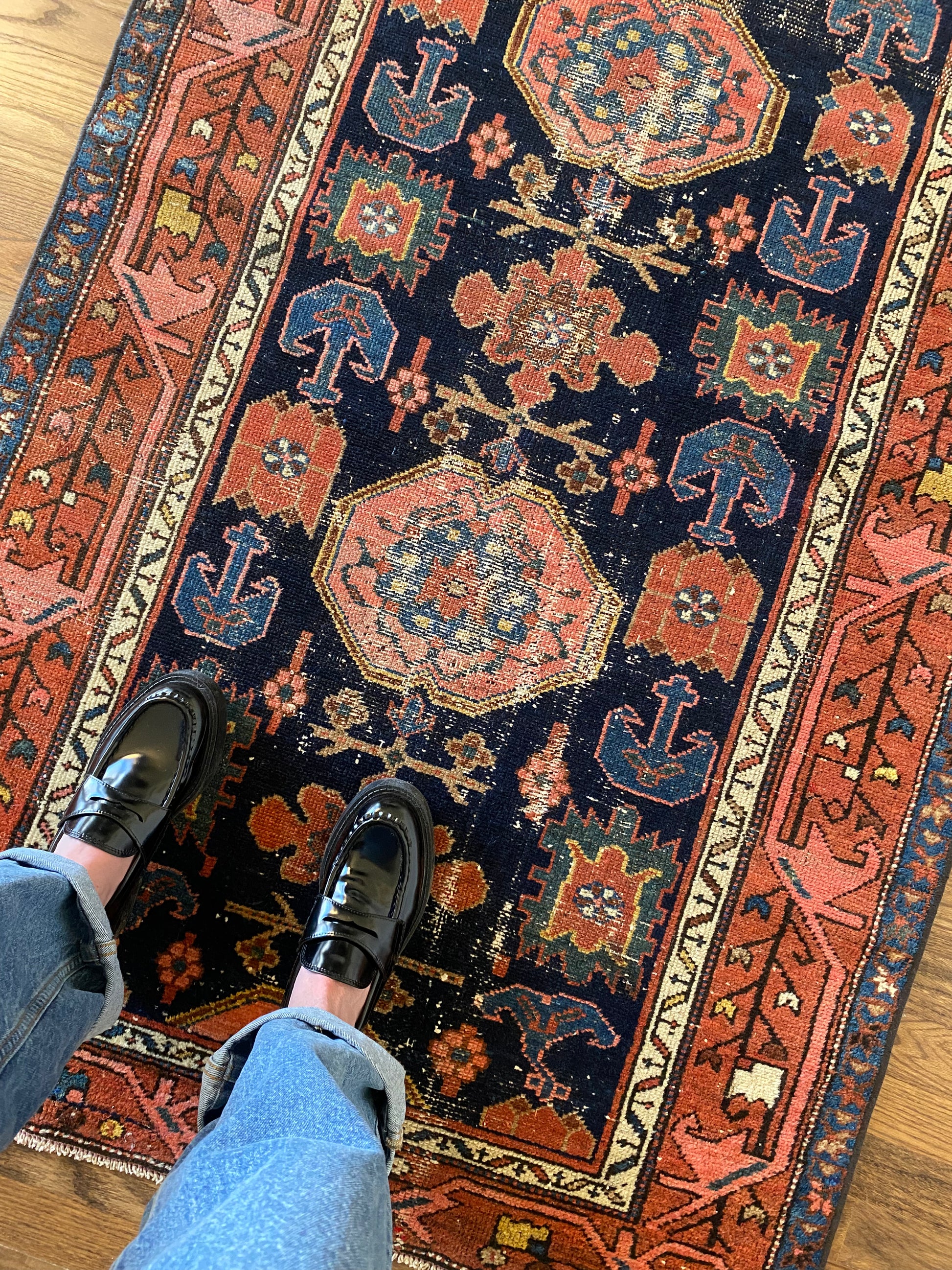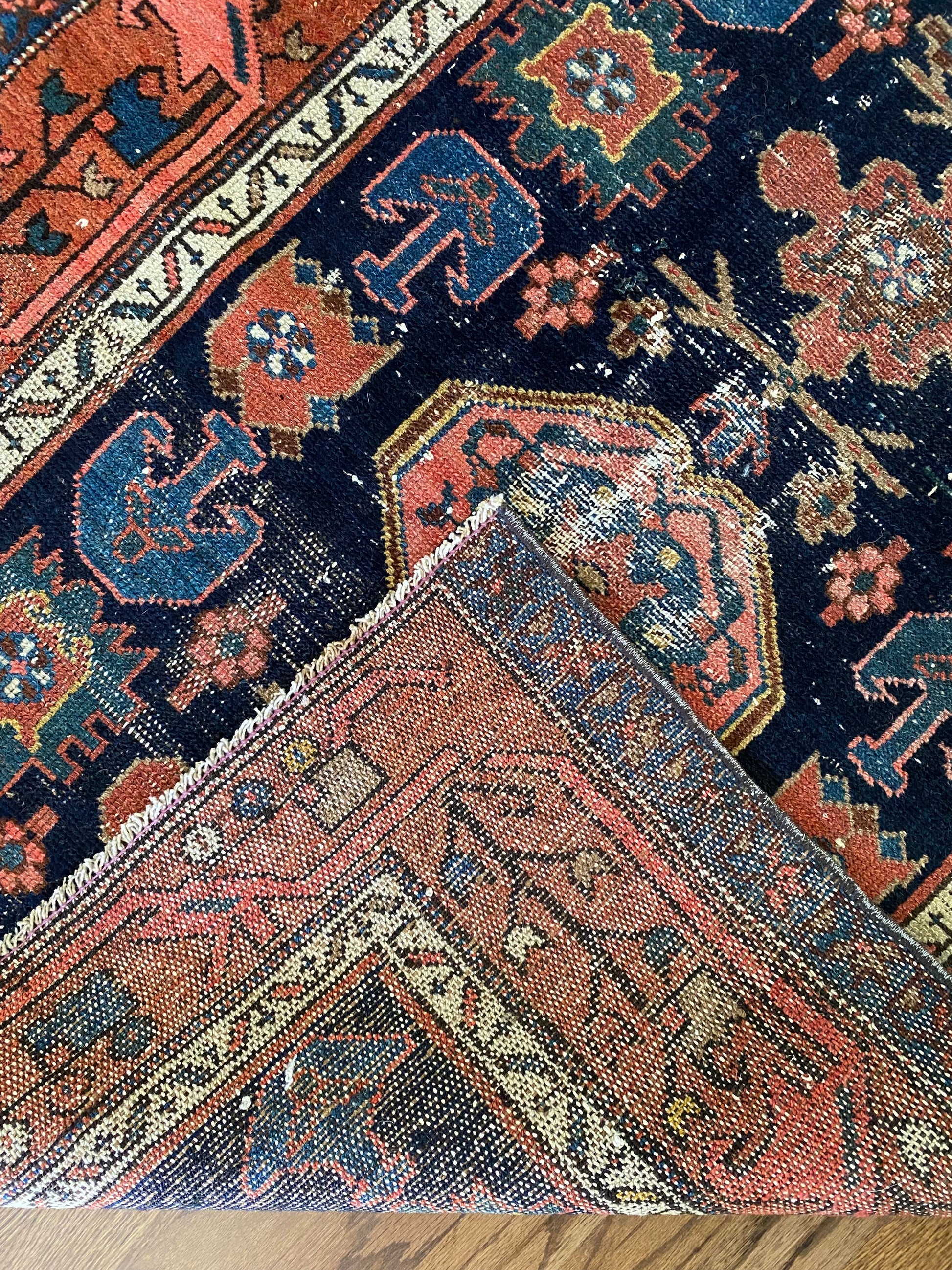 All of our rugs have been professionally cleaned prior to listing. We strive to deliver rugs that everyone loves, but please note that when you purchase from Two Sisters Rugs you are purchasing an item that is pre-owned and vintage by nature. Rugs might have areas of wear, minor repairs, or other unique characteristics, but we believe this is what makes them beautiful and one of a kind. Many rugs do not have perfect lines. All photographs are taken on an iPhone with no filter in natural light unless otherwise noted; colors may vary depending on the placement in your home. Colors may also vary depending on your phone or screen settings. If the area you are placing the rug has less natural light, the rug will appear darker in person. We aim to represent each rugs true colors and designs on the listing photos, but are happy to send additional photos upon request prior to purchase. High quality wool contains a substance called lanolin, which emits a metallic-y, but sweet and grassy scent. ALL SALES ARE FINAL.