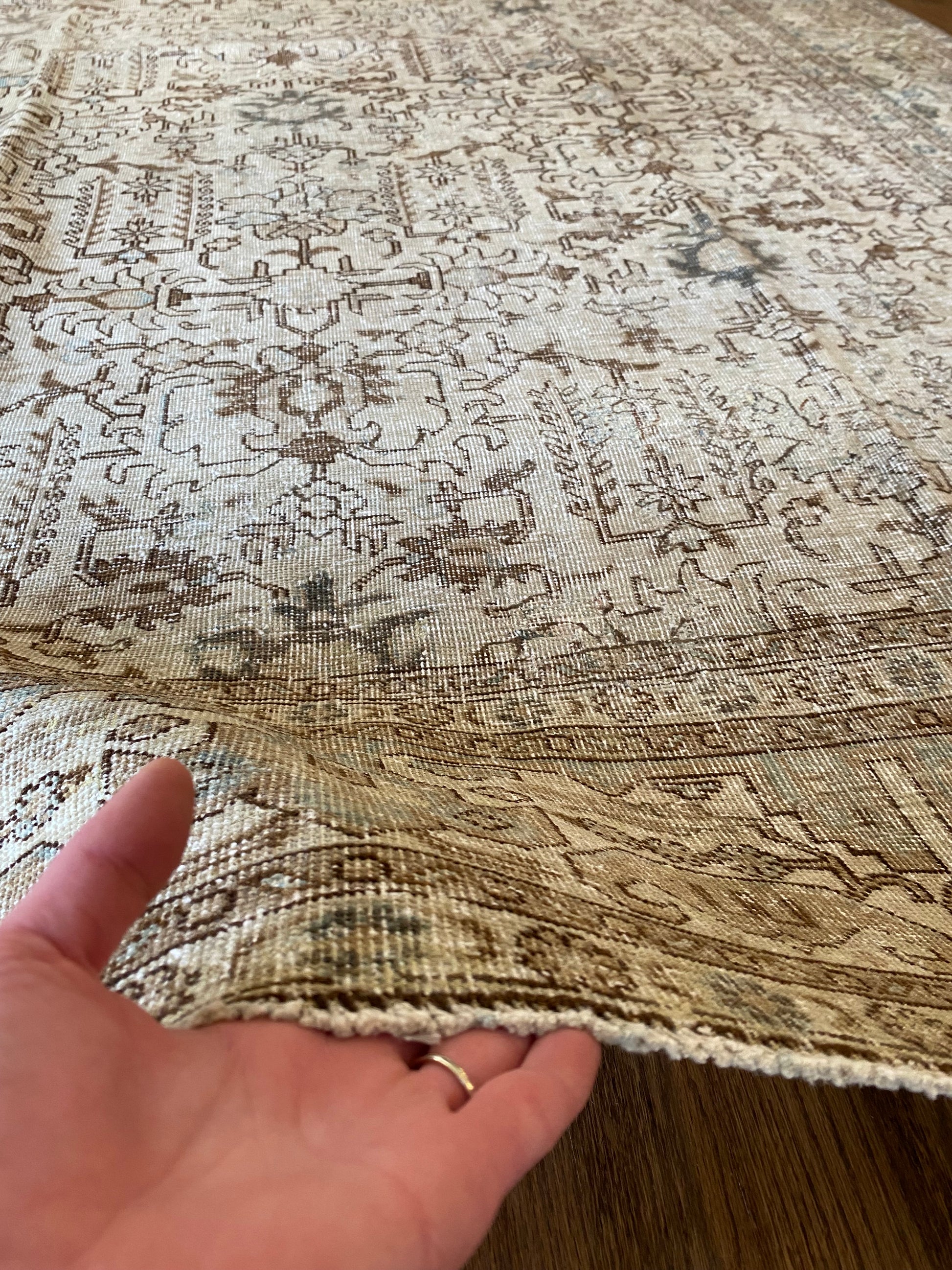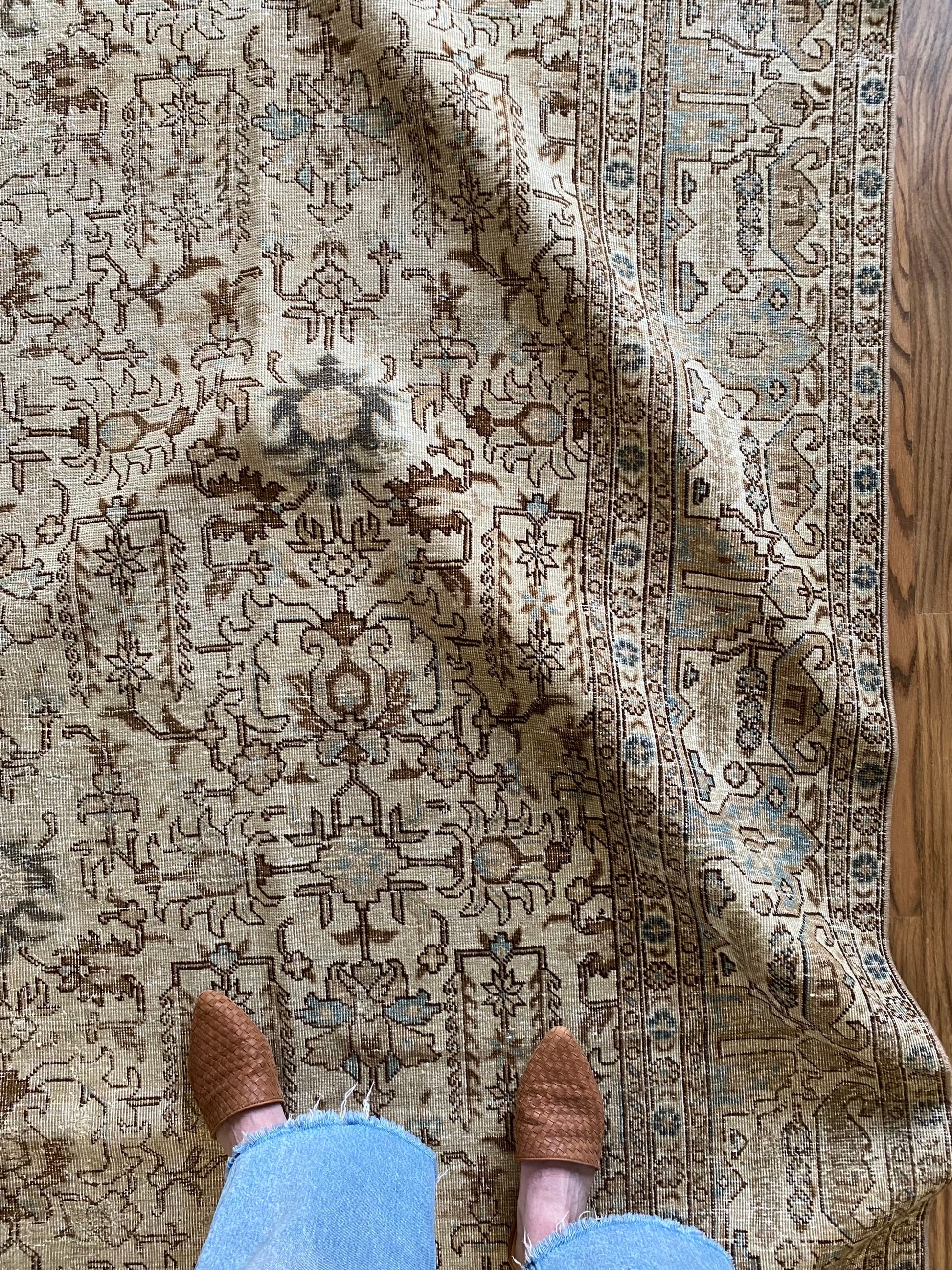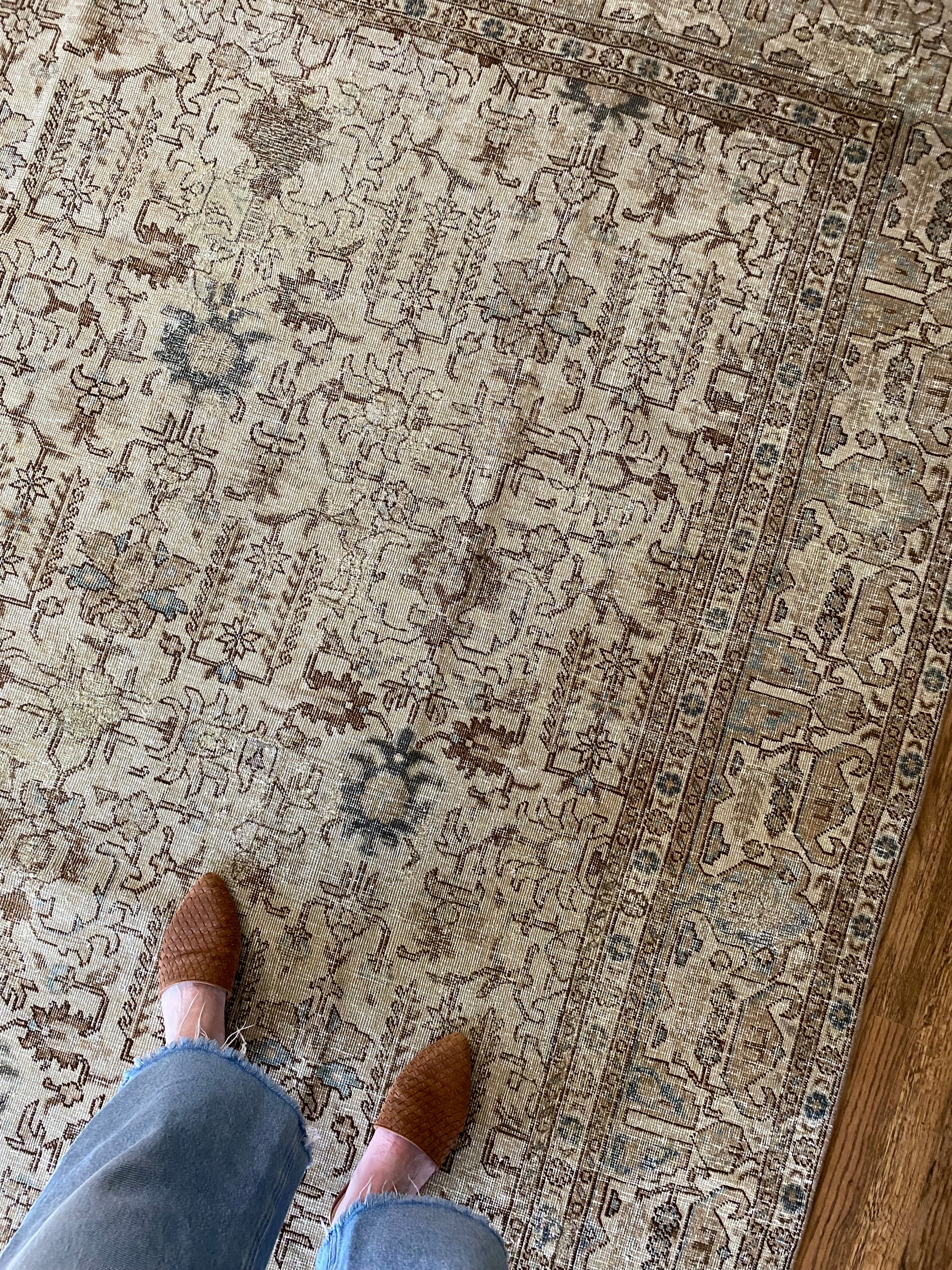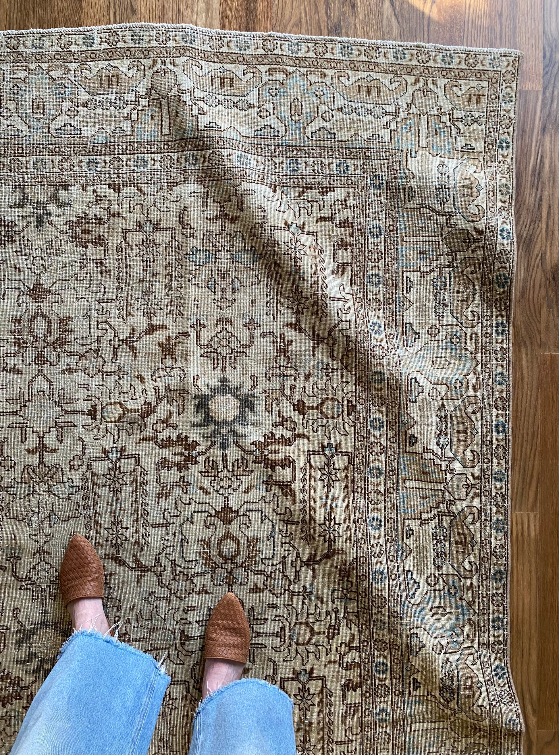 All of our rugs have been professionally cleaned prior to listing. We strive to deliver rugs that everyone loves, but please note that when you purchase from Two Sisters Rugs you are purchasing an item that is pre-owned and vintage by nature. Rugs might have areas of wear, minor repairs, or other unique characteristics, but we believe this is what makes them beautiful and one of a kind. Many rugs do not have perfect lines. All photographs are taken on an iPhone with no filter in natural light unless otherwise noted; colors may vary depending on the placement in your home. Colors may also vary depending on your phone or screen settings. If the area you are placing the rug has less natural light, the rug will appear darker in person. We aim to represent each rugs true colors and designs on the listing photos, but are happy to send additional photos upon request prior to purchase. High quality wool contains a substance called lanolin, which emits a metallic-y, but sweet and grassy scent. ALL SALES ARE FINAL.
