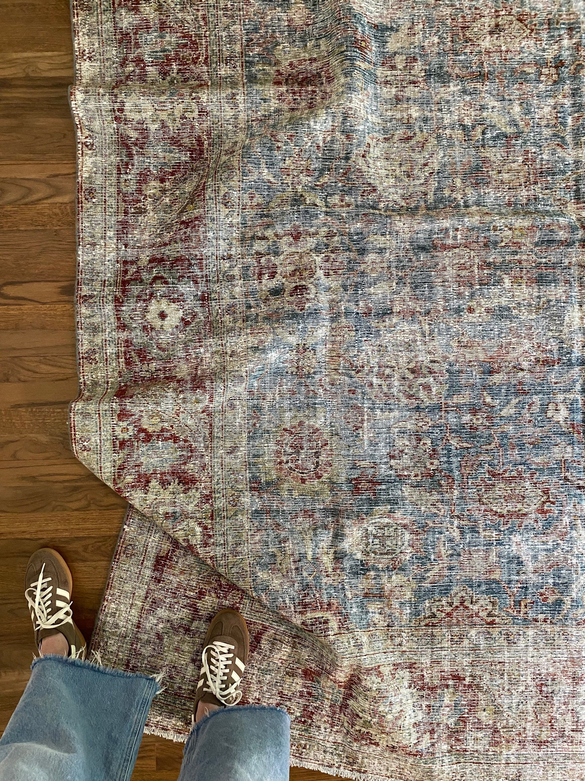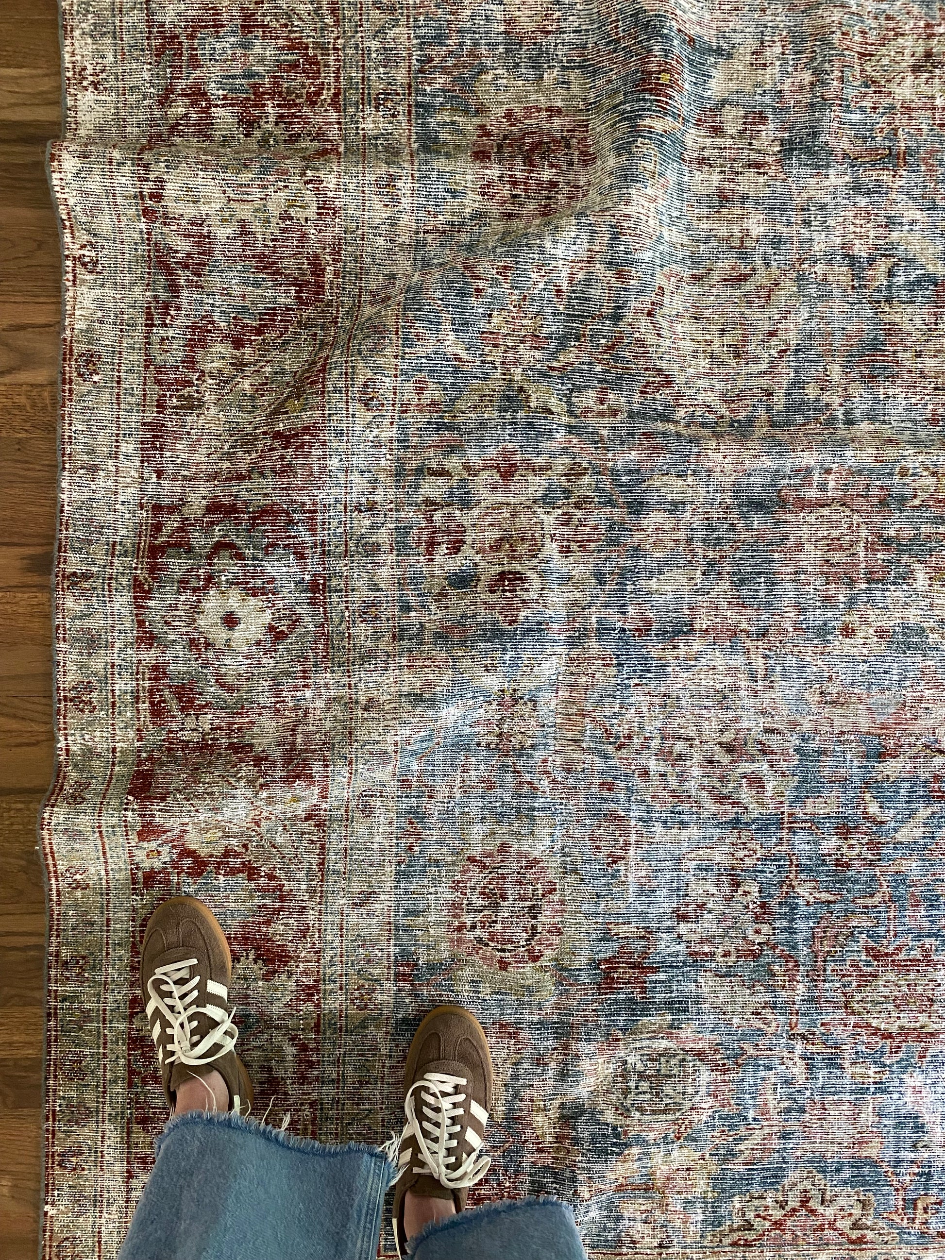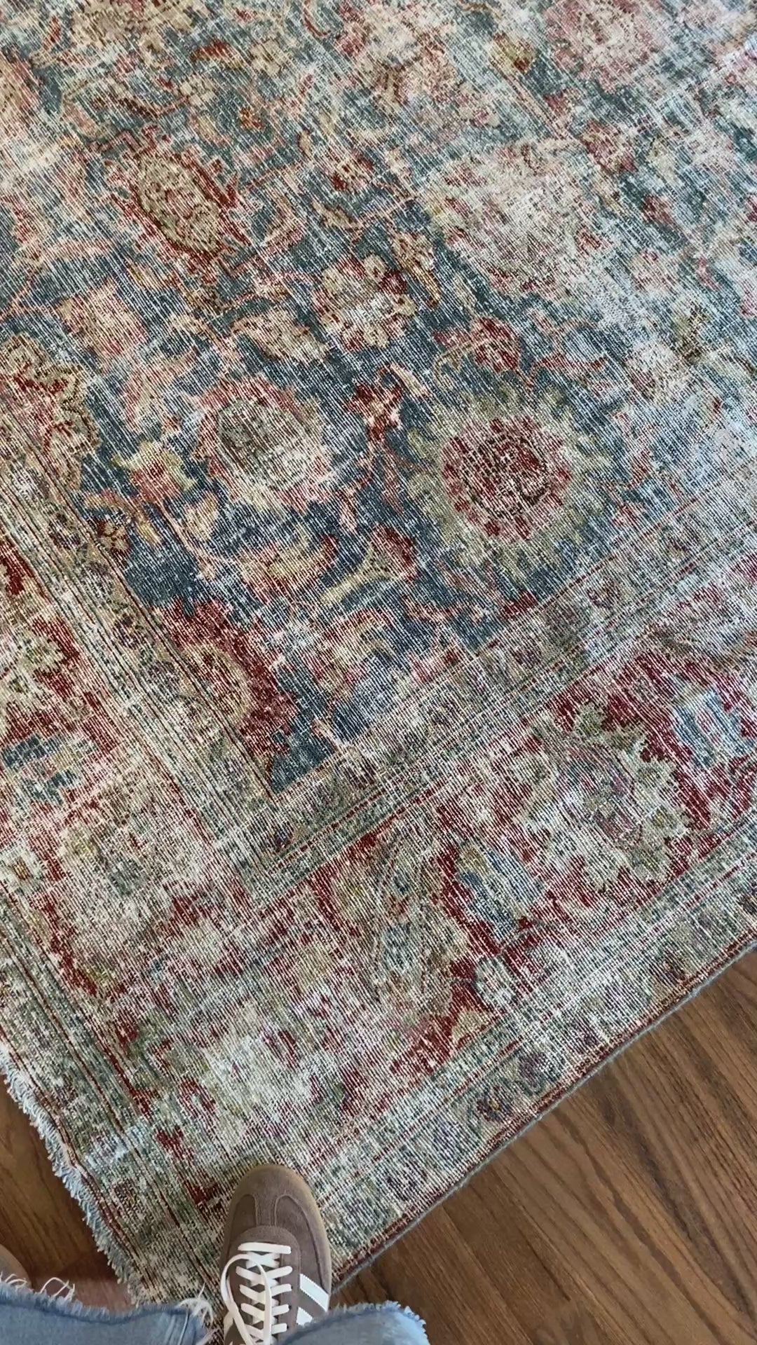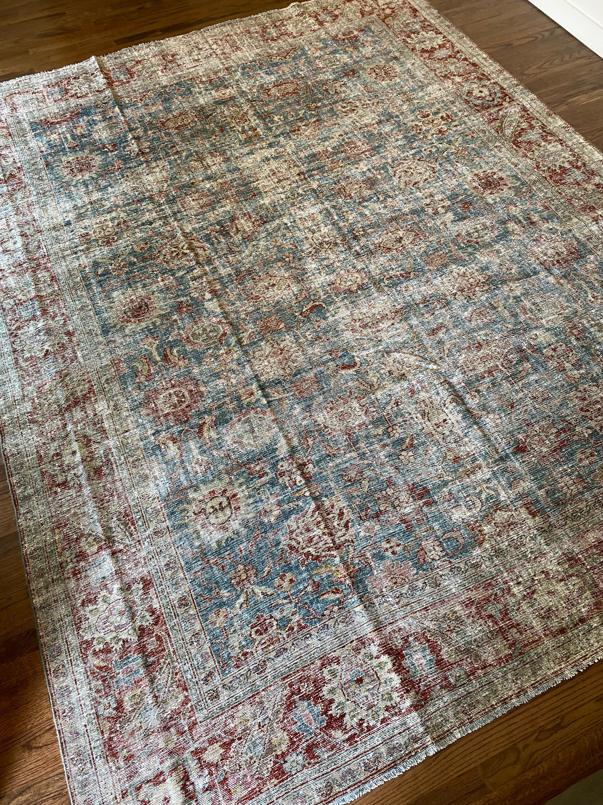 All of our rugs have been professionally cleaned prior to listing. We strive to deliver rugs that everyone loves, but please note that when you purchase from Two Sisters Rugs you are purchasing an item that is pre-owned and vintage by nature. Rugs might have areas of wear, minor repairs, or other unique characteristics, but we believe this is what makes them beautiful and one of a kind. Many rugs do not have perfect lines. All photographs are taken on an iPhone with no filter in natural light unless otherwise noted; colors may vary depending on the placement in your home. Colors may also vary depending on your phone or screen settings. If the area you are placing the rug has less natural light, the rug will appear darker in person. We aim to represent each rugs true colors and designs on the listing photos, but are happy to send additional photos upon request prior to purchase. High quality wool contains a substance called lanolin, which emits a metallic-y, but sweet and grassy scent. ALL SALES ARE FINAL.