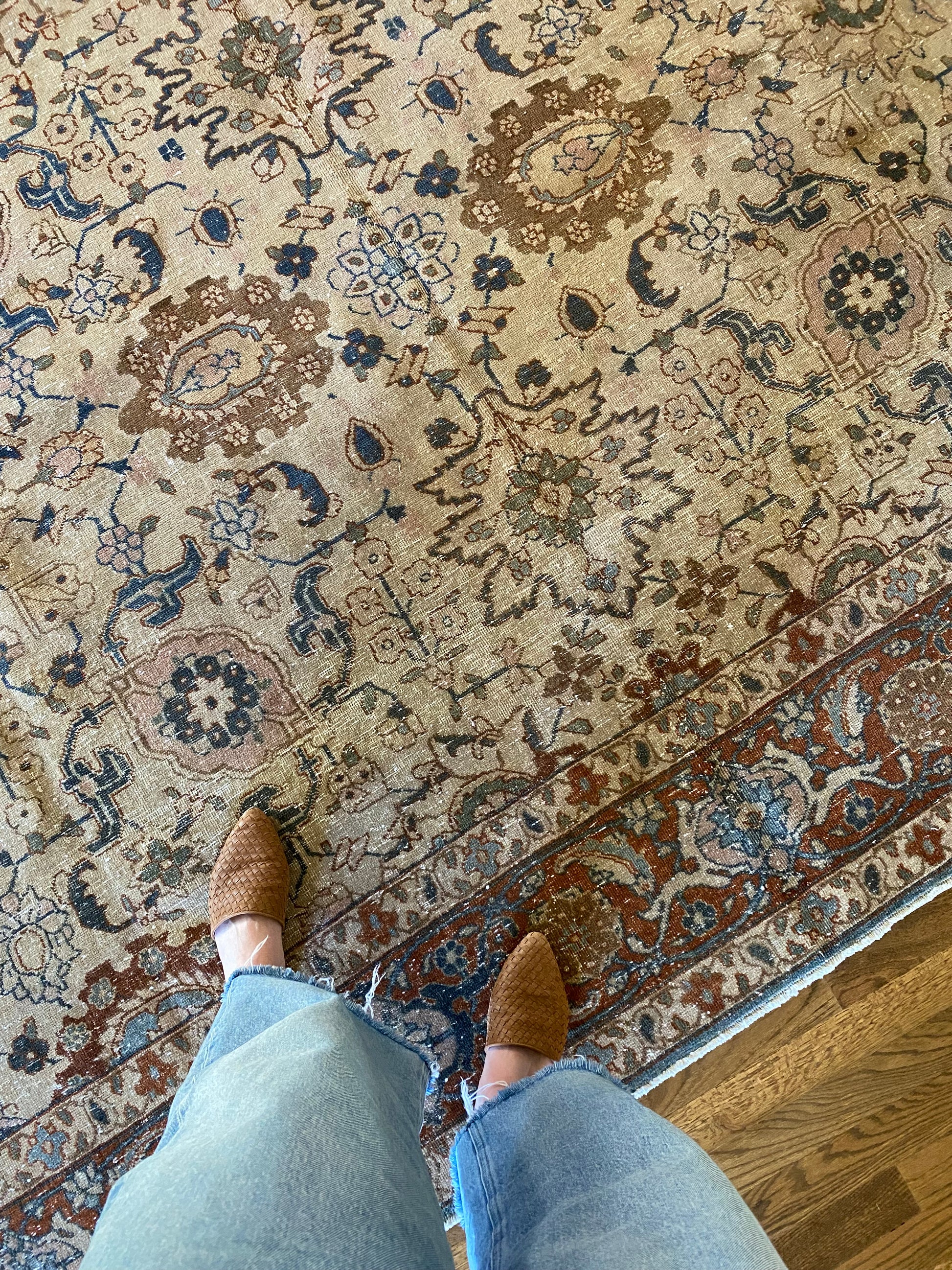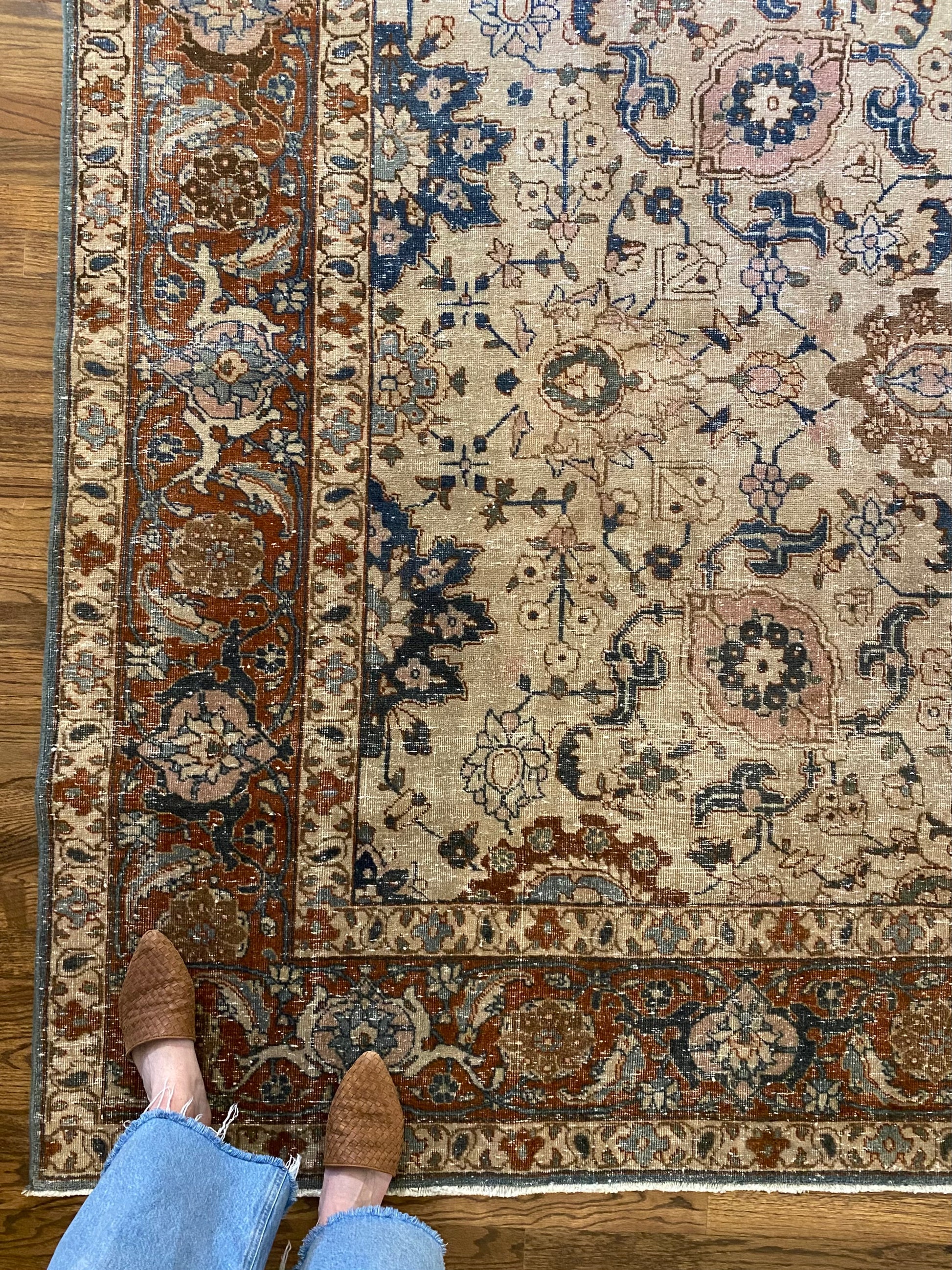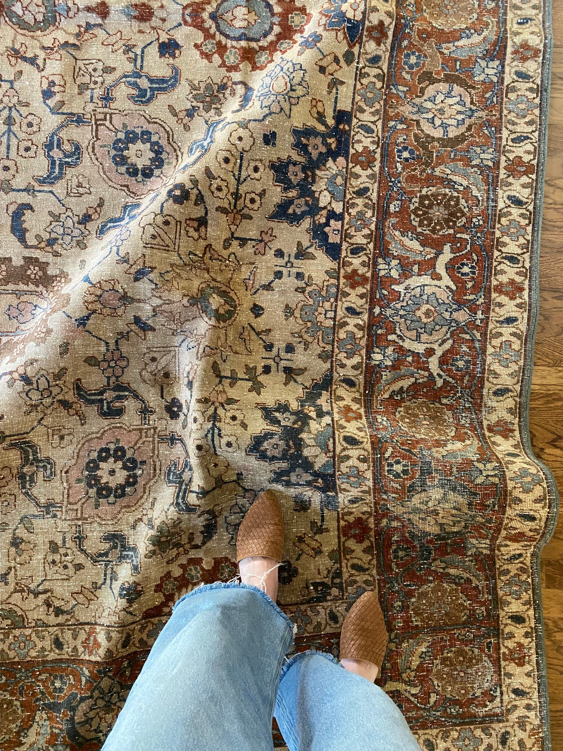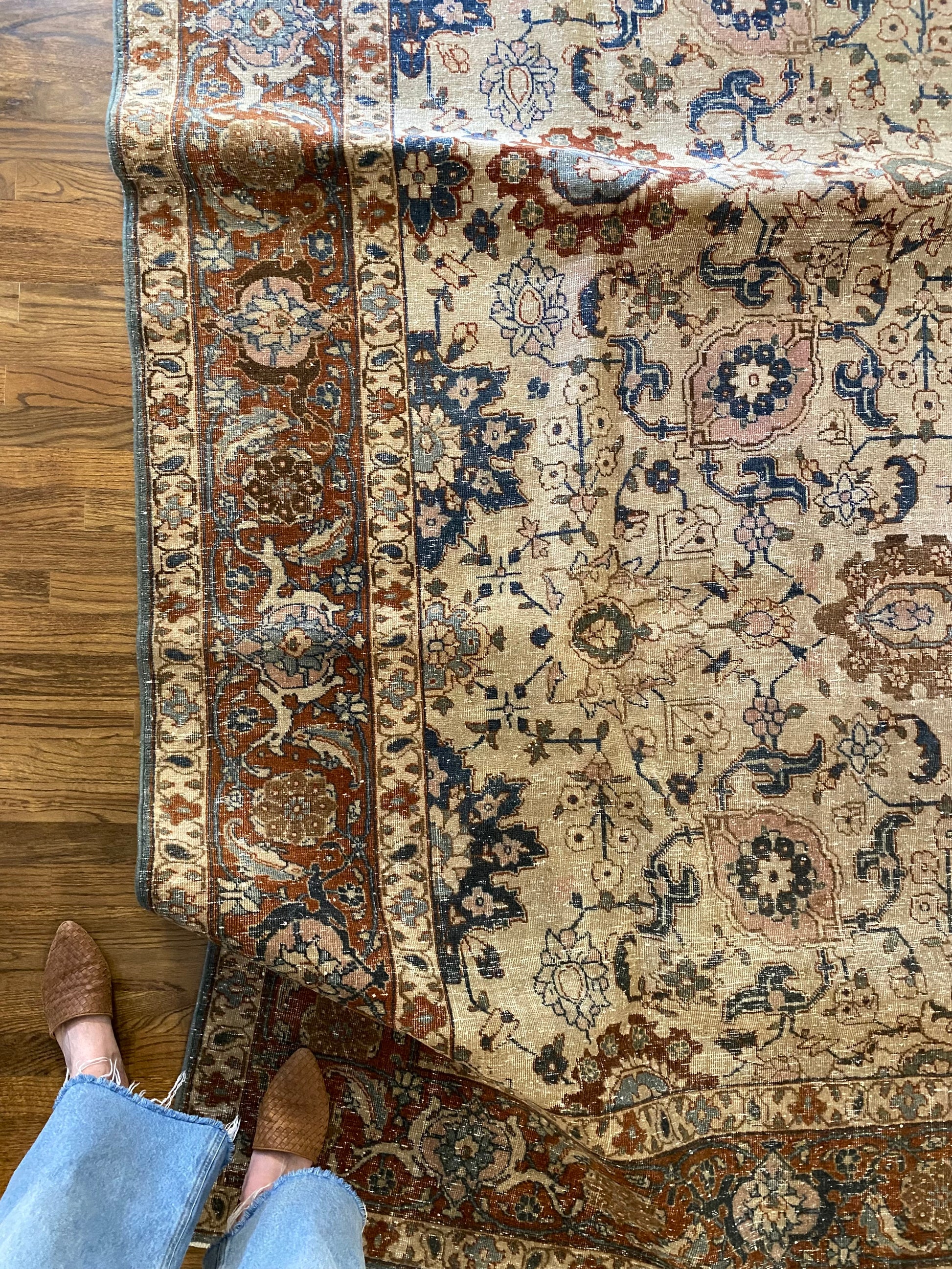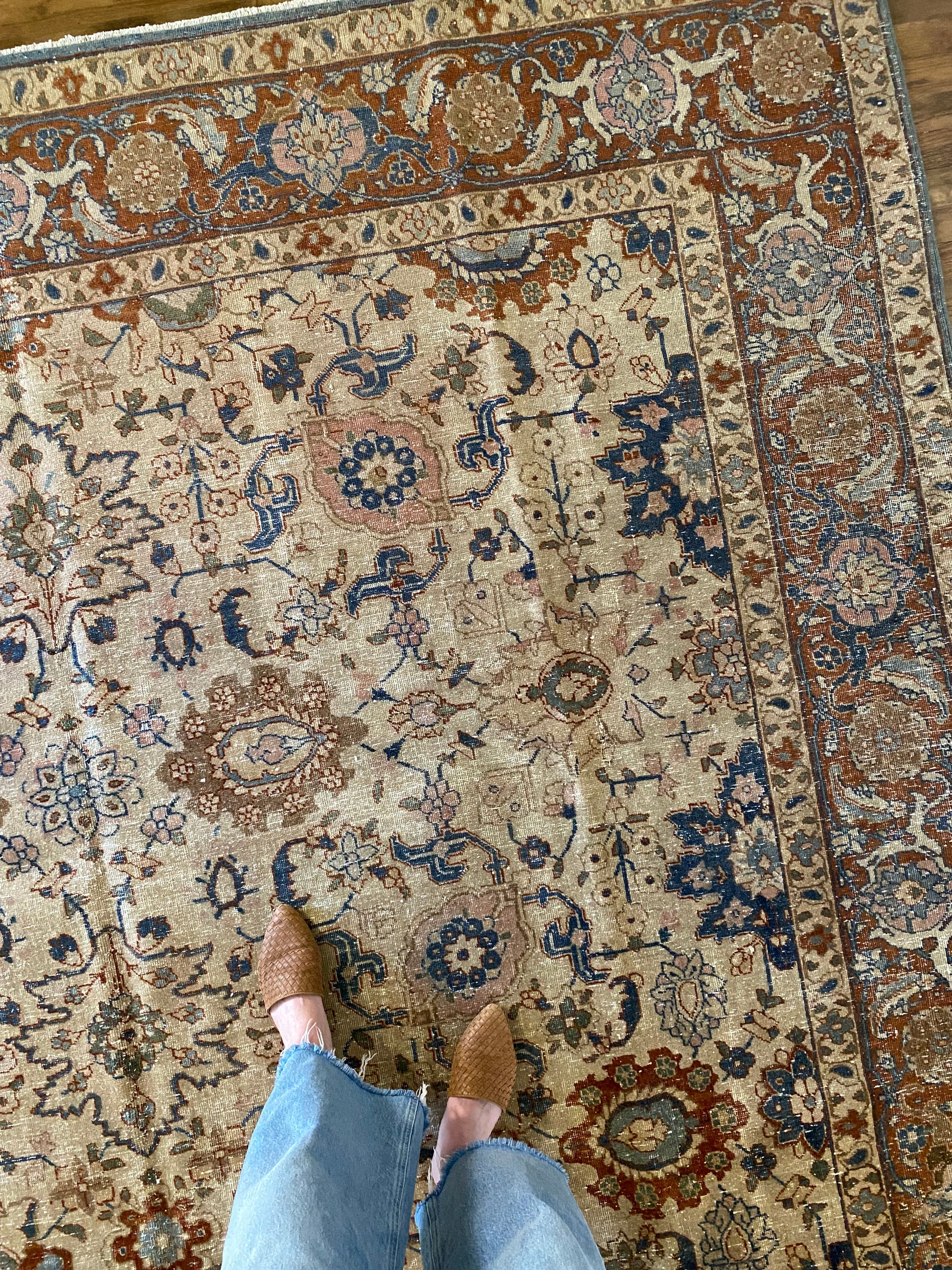All of our rugs have been professionally cleaned prior to listing. We strive to deliver rugs that everyone loves, but please note that when you purchase from Two Sisters Rugs you are purchasing an item that is pre-owned and vintage by nature. Rugs might have areas of wear, minor repairs, or other unique characteristics, but we believe this is what makes them beautiful and one of a kind. Many rugs do not have perfect lines. All photographs are taken on an iPhone with no filter in natural light unless otherwise noted; colors may vary depending on the placement in your home. Colors may also vary depending on your phone or screen settings. If the area you are placing the rug has less natural light, the rug will appear darker in person. We aim to represent each rugs true colors and designs on the listing photos, but are happy to send additional photos upon request prior to purchase. High quality wool contains a substance called lanolin, which emits a metallic-y, but sweet and grassy scent. ALL SALES ARE FINAL.