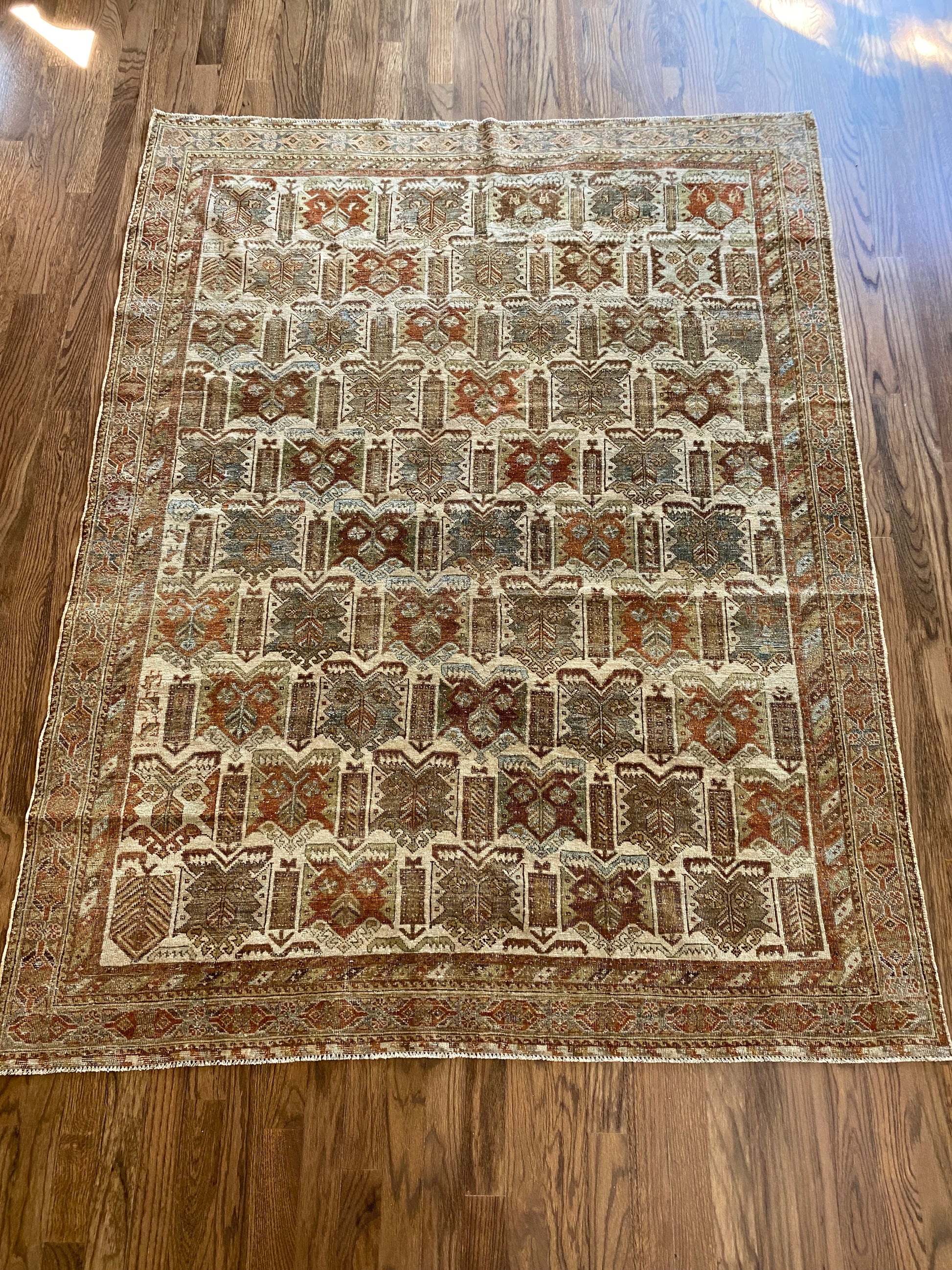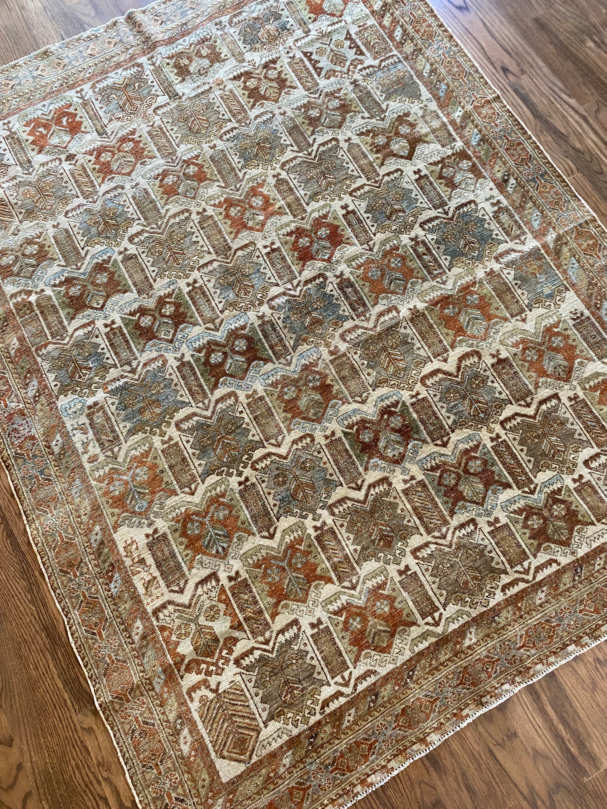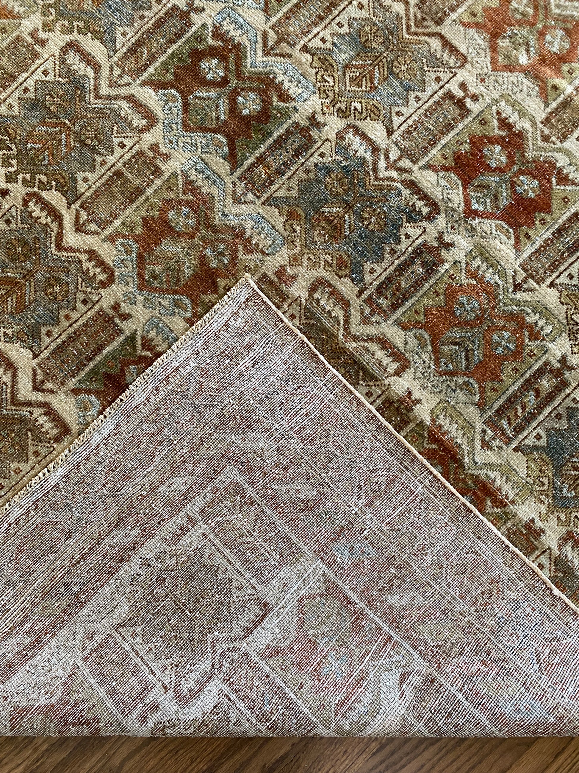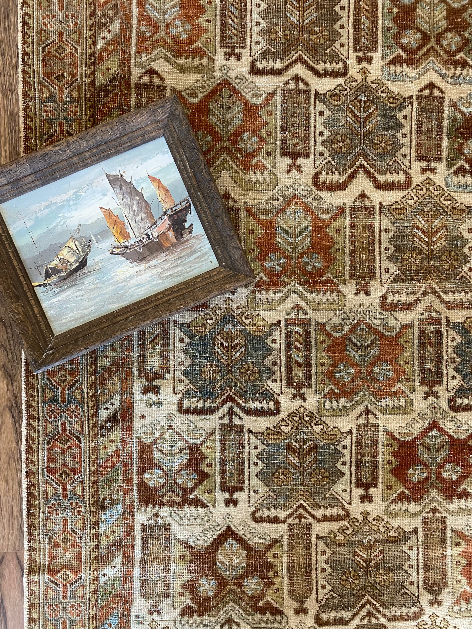 All of our rugs have been professionally cleaned prior to listing. We strive to deliver rugs that everyone loves, but please note that when you purchase from Two Sisters Rugs you are purchasing an item that is pre-owned and vintage by nature. Rugs might have areas of wear, minor repairs, or other unique characteristics, but we believe this is what makes them beautiful and one of a kind. Many rugs do not have perfect lines. All photographs are taken on an iPhone with no filter in natural light unless otherwise noted; colors may vary depending on the placement in your home. Colors may also vary depending on your phone or screen settings. If the area you are placing the rug has less natural light, the rug will appear darker in person. We aim to represent each rugs true colors and designs on the listing photos, but are happy to send additional photos upon request prior to purchase. High quality wool contains a substance called lanolin, which emits a metallic-y, but sweet and grassy scent. ALL SALES ARE FINAL.
