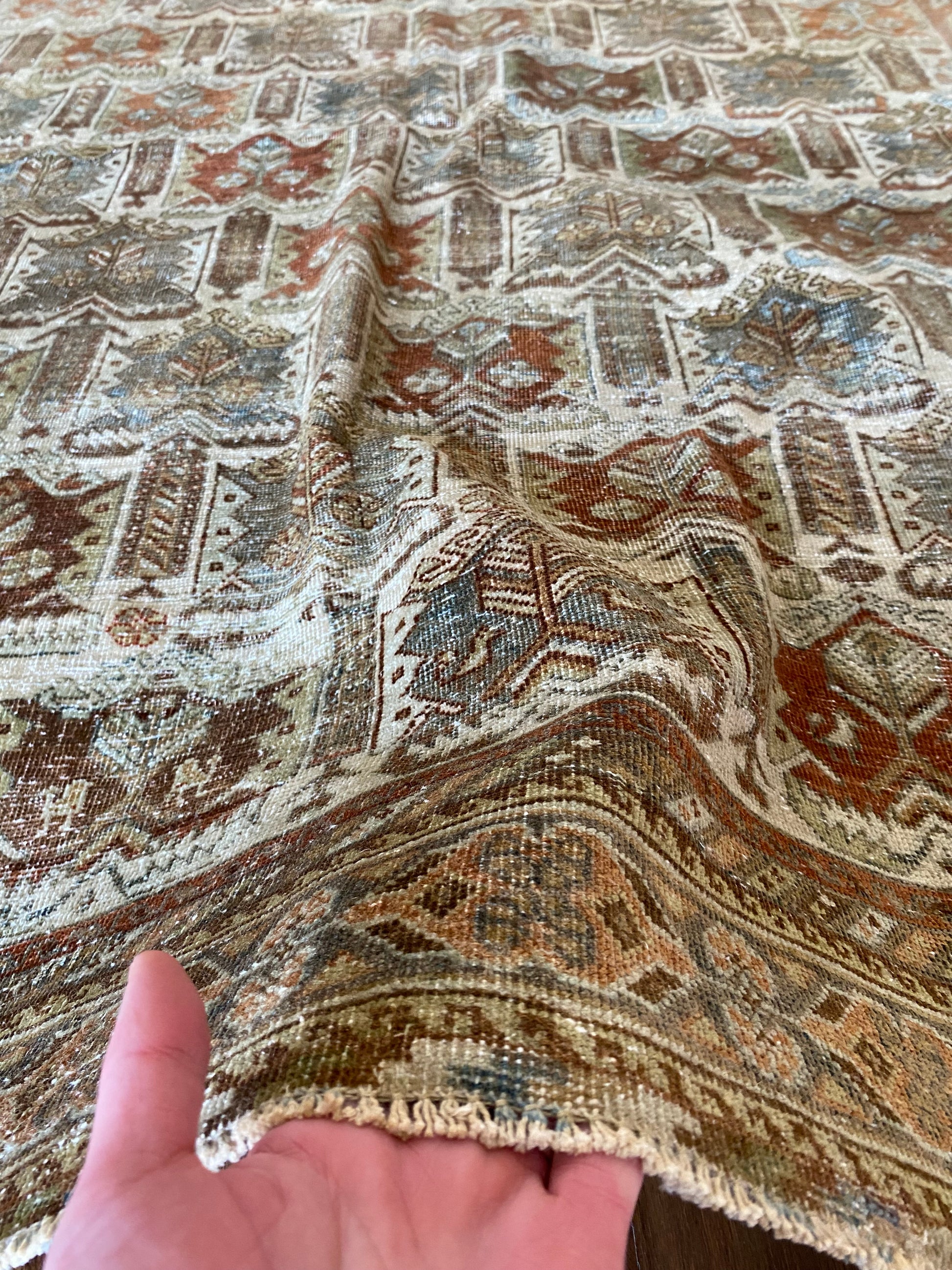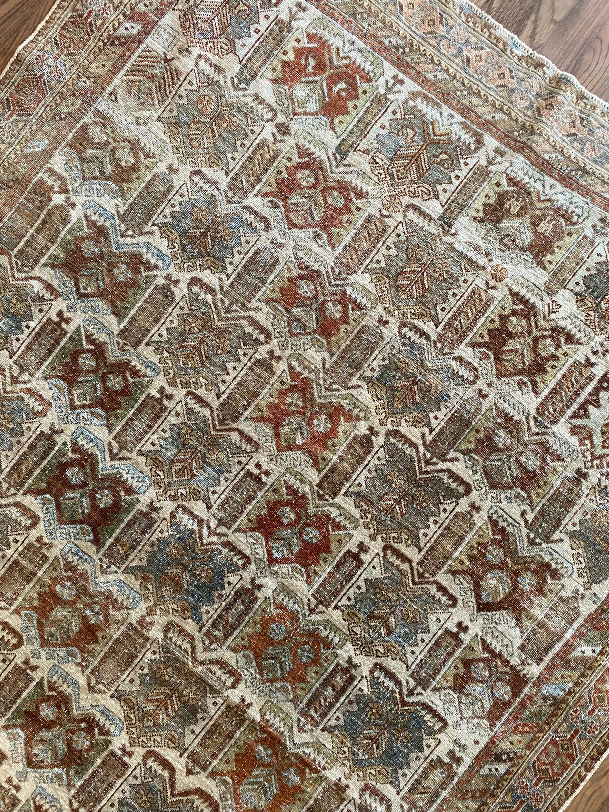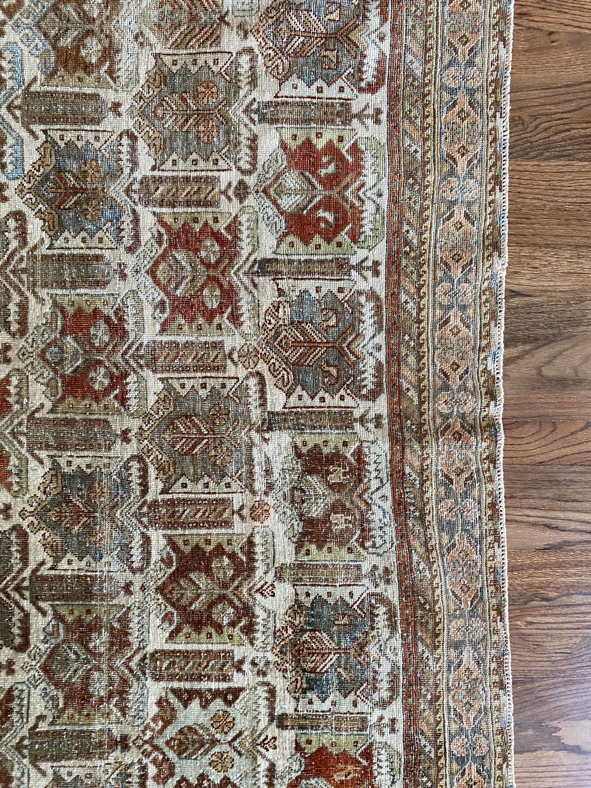 All of our rugs have been professionally cleaned prior to listing. We strive to deliver rugs that everyone loves, but please note that when you purchase from Two Sisters Rugs you are purchasing an item that is pre-owned and vintage by nature. Rugs might have areas of wear, minor repairs, or other unique characteristics, but we believe this is what makes them beautiful and one of a kind. Many rugs do not have perfect lines. All photographs are taken on an iPhone with no filter in natural light unless otherwise noted; colors may vary depending on the placement in your home. Colors may also vary depending on your phone or screen settings. If the area you are placing the rug has less natural light, the rug will appear darker in person. We aim to represent each rugs true colors and designs on the listing photos, but are happy to send additional photos upon request prior to purchase. High quality wool contains a substance called lanolin, which emits a metallic-y, but sweet and grassy scent. ALL SALES ARE FINAL.