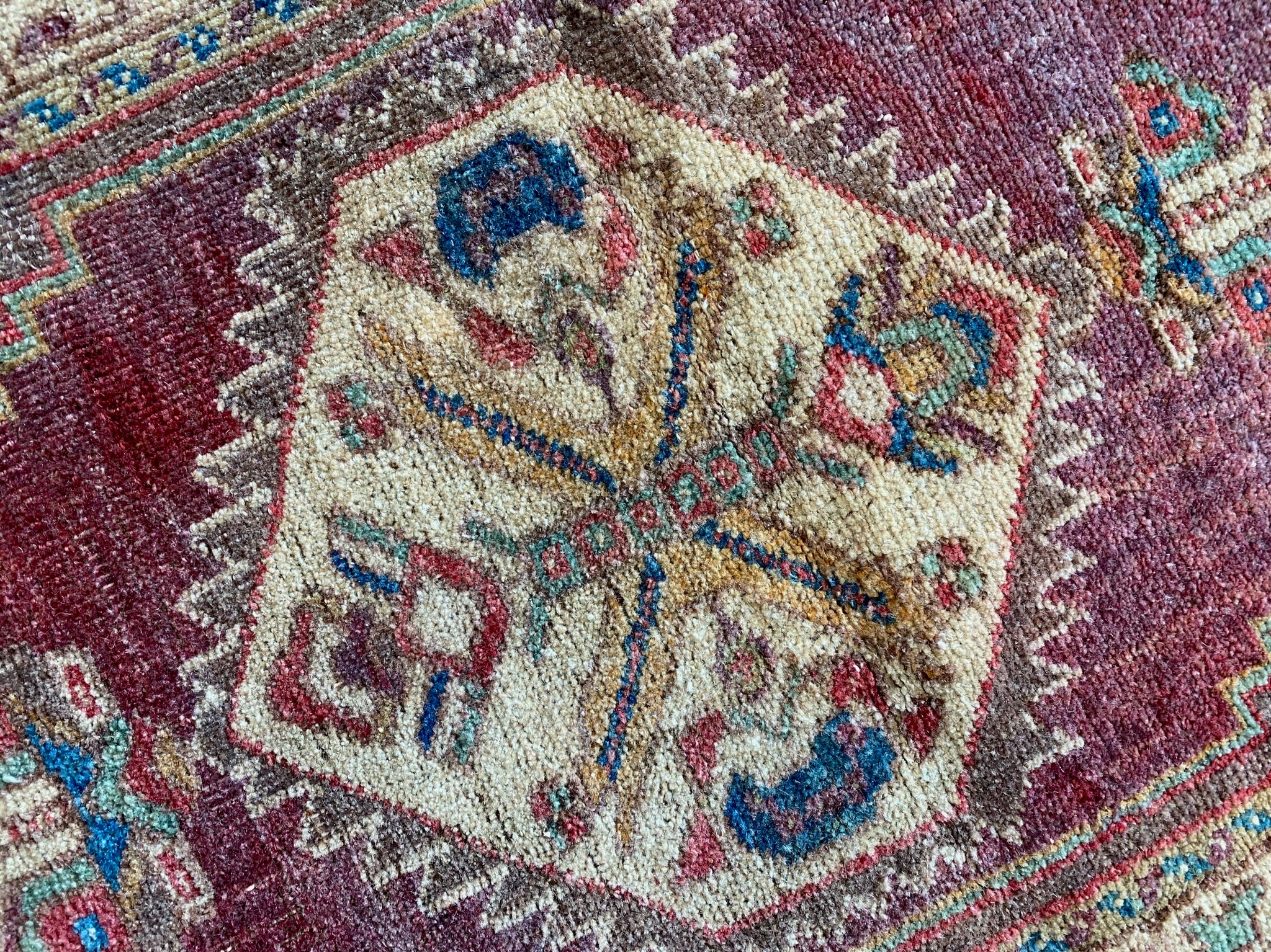 All of our rugs have been professionally cleaned prior to listing. These unique vintage rugs have normal wear related to their age. Some may have minor repairs. All photographs are taken in natural light; colors may vary depending on the placement in your home. Many rugs do not have perfect lines-we believe this adds to the authenticity of these hand-woven beauties. High quality wool contains a substance called lanolin, which emits a metallic-y, but sweet and grassy scent. ALL SALES FINAL.