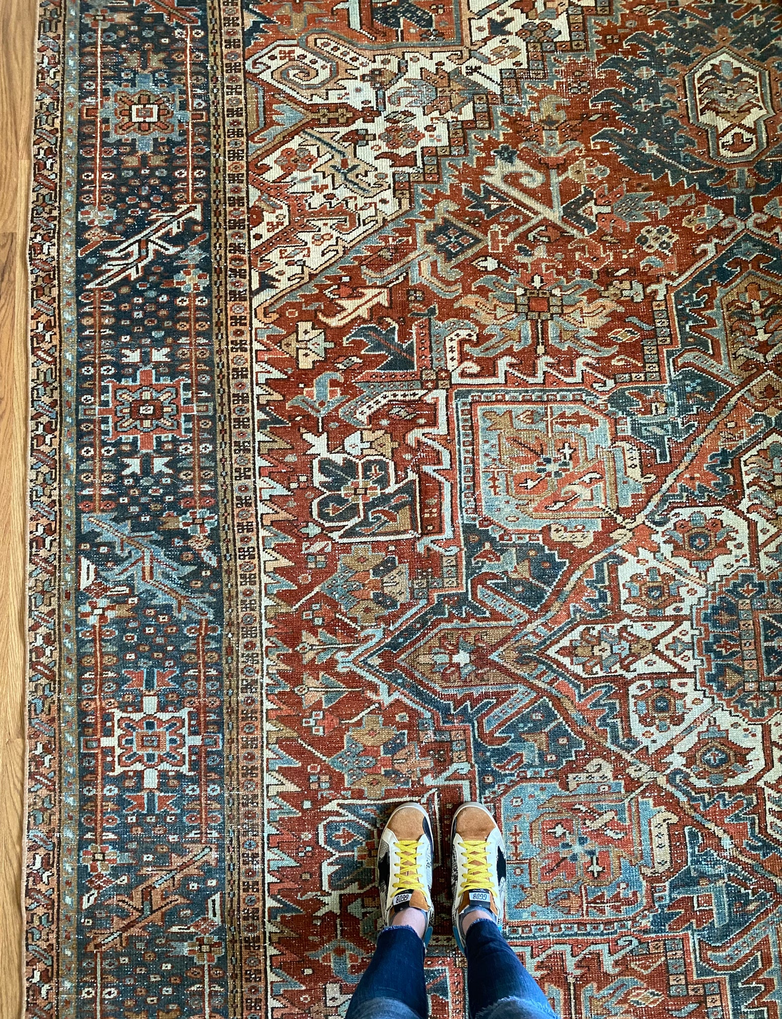 All of our rugs have been professionally cleaned prior to listing. These unique vintage rugs have normal wear related to their age. Some may have minor repairs. All photographs are taken in natural light; colors may vary depending on the placement in your home. Many rugs do not have perfect lines-we believe this adds to the authenticity of these hand-woven beauties. High quality wool contains a substance called lanolin, which emits a metallic-y, but sweet and grassy scent. ALL SALES FINAL.