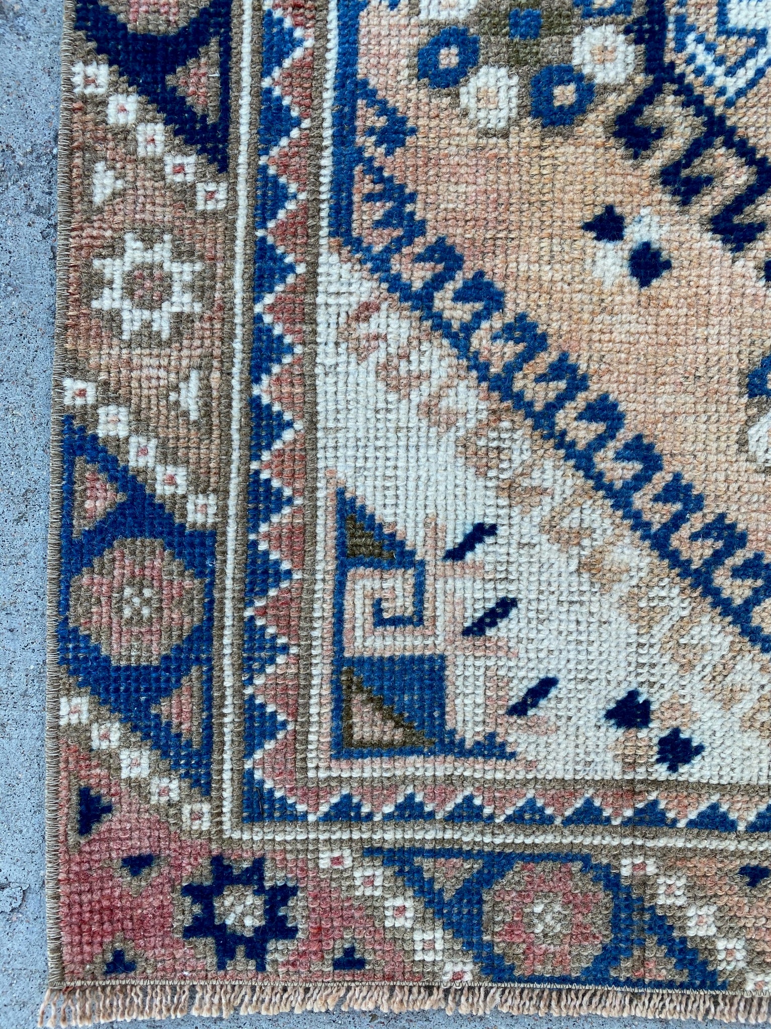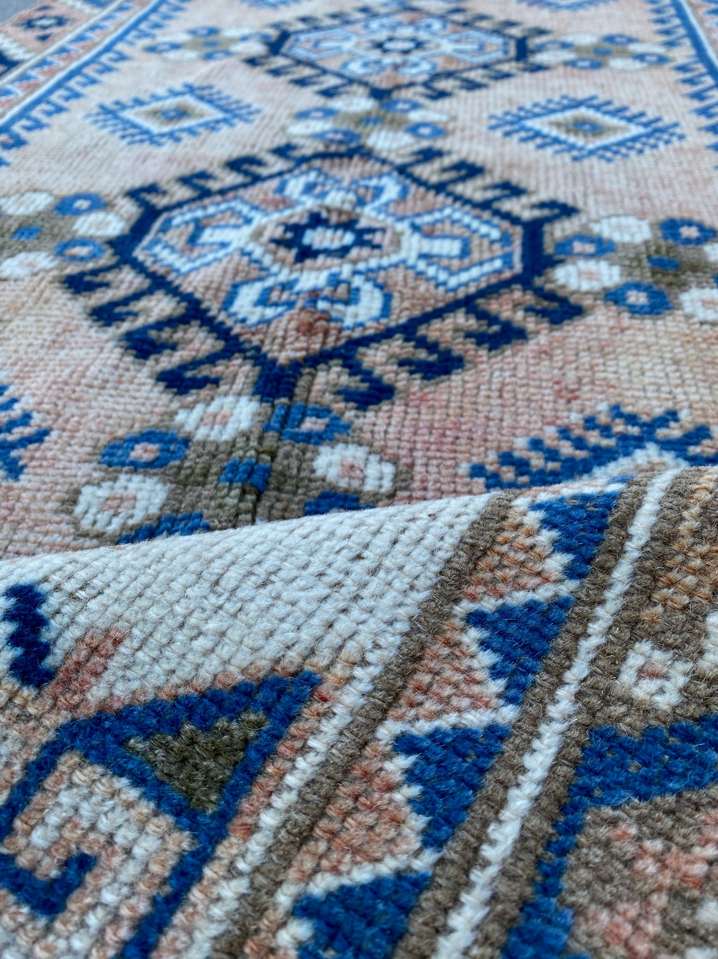 All of our rugs have been professionally cleaned prior to listing. These unique vintage rugs have normal wear related to their age. Some may have minor repairs. All photographs are taken in natural light; colors may vary depending on the placement in your home. Many rugs do not have perfect lines-we believe this adds to the authenticity of these hand-woven beauties.