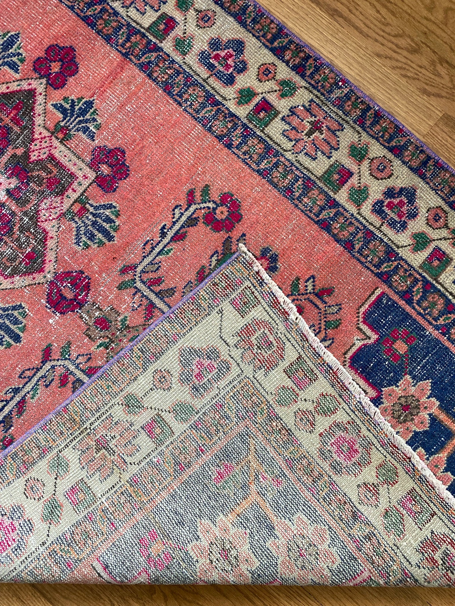 All of our rugs have been professionally cleaned prior to listing. These unique vintage rugs have normal wear related to their age. Some may have minor repairs. All photographs are taken in natural light; colors may vary depending on the placement in your home. Many rugs do not have perfect lines-we believe this adds to the authenticity of these hand-woven beauties. High quality wool contains a substance called lanolin, which emits a metallic-y, but sweet and grassy scent. ALL SALES FINAL.