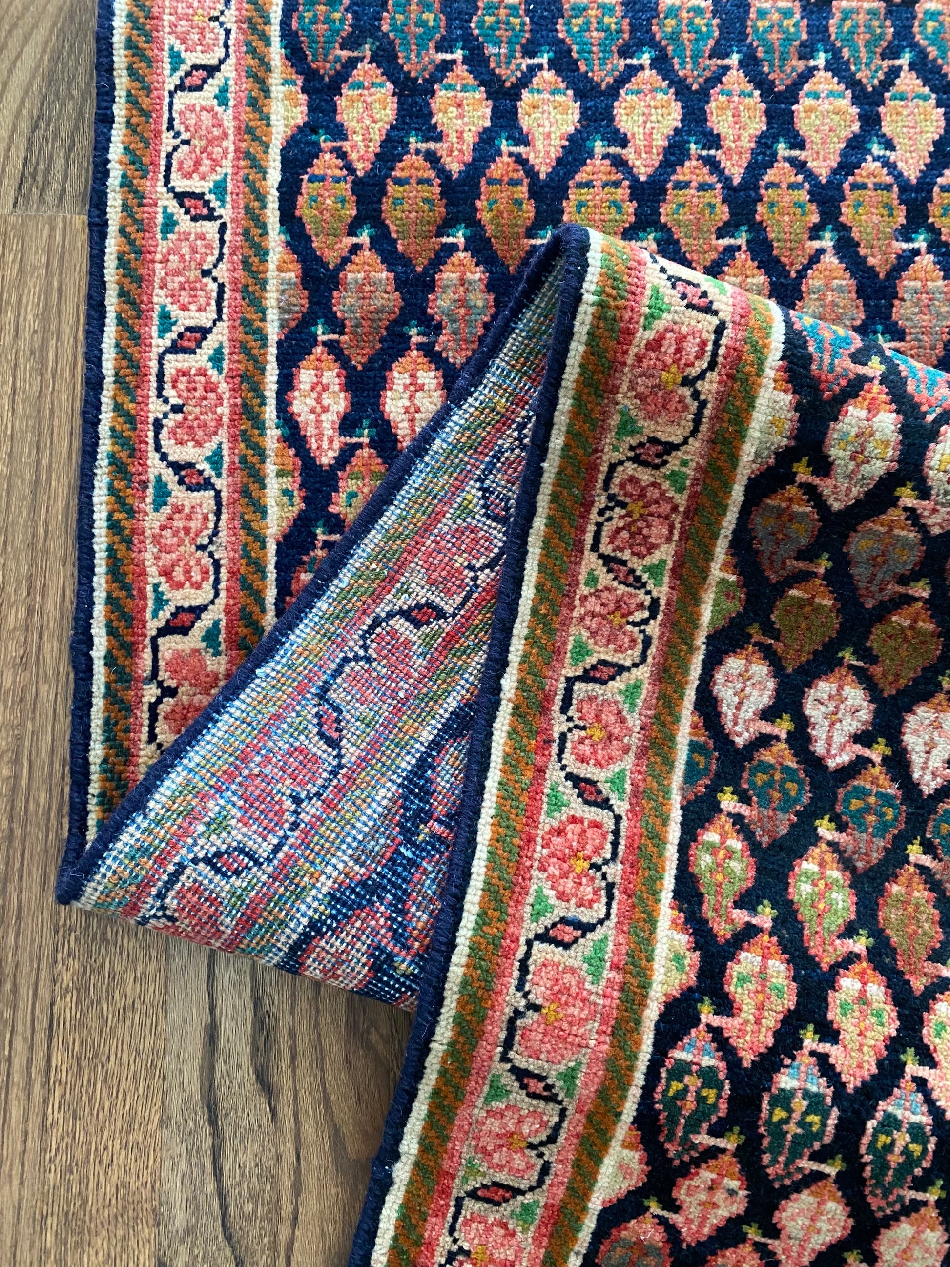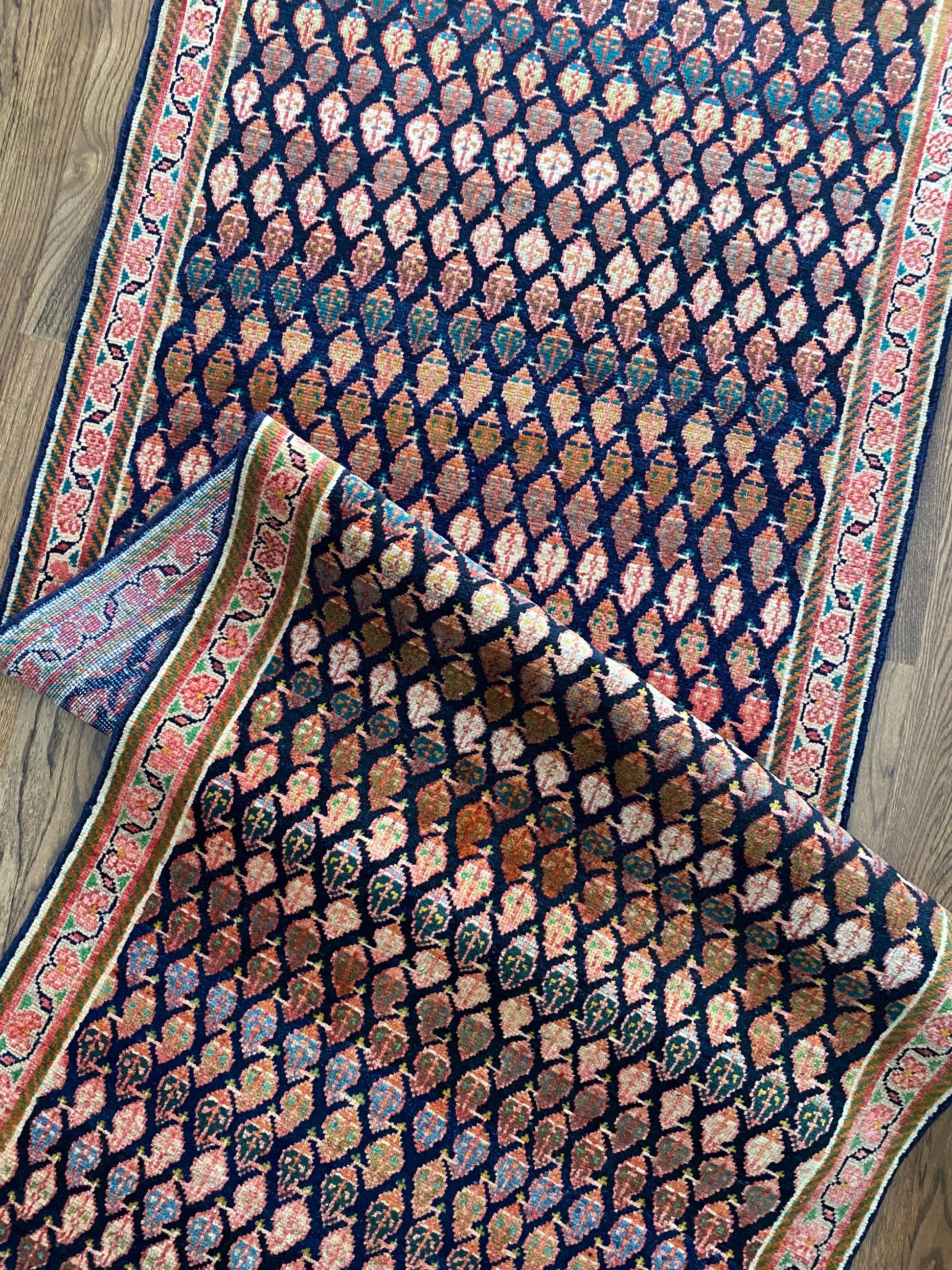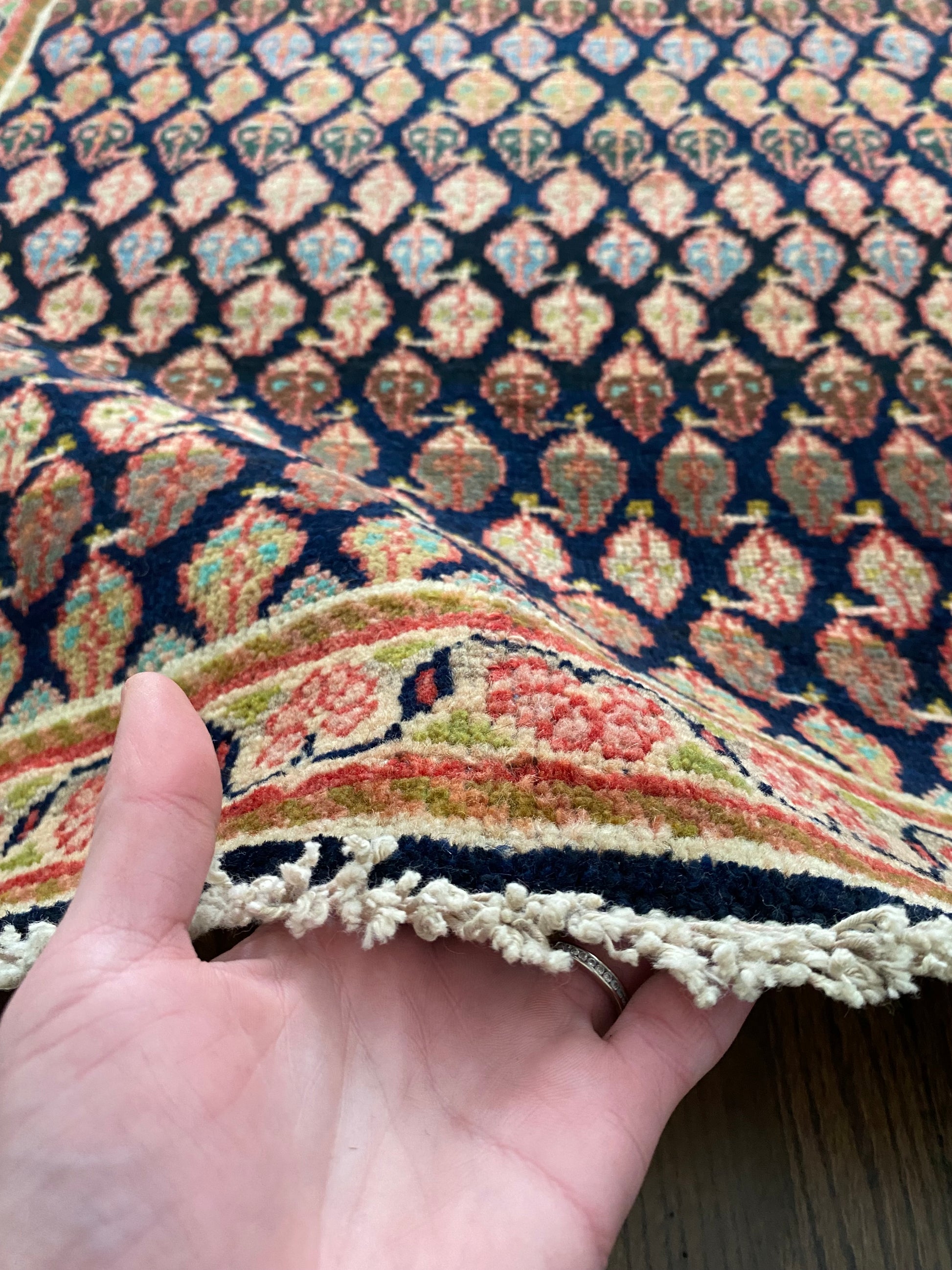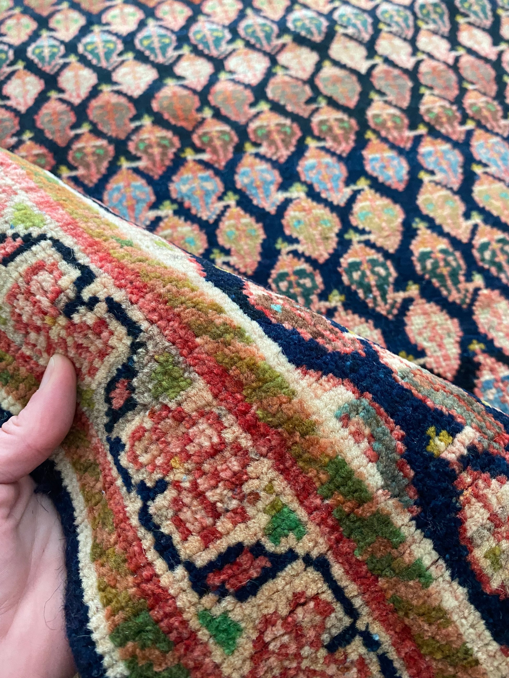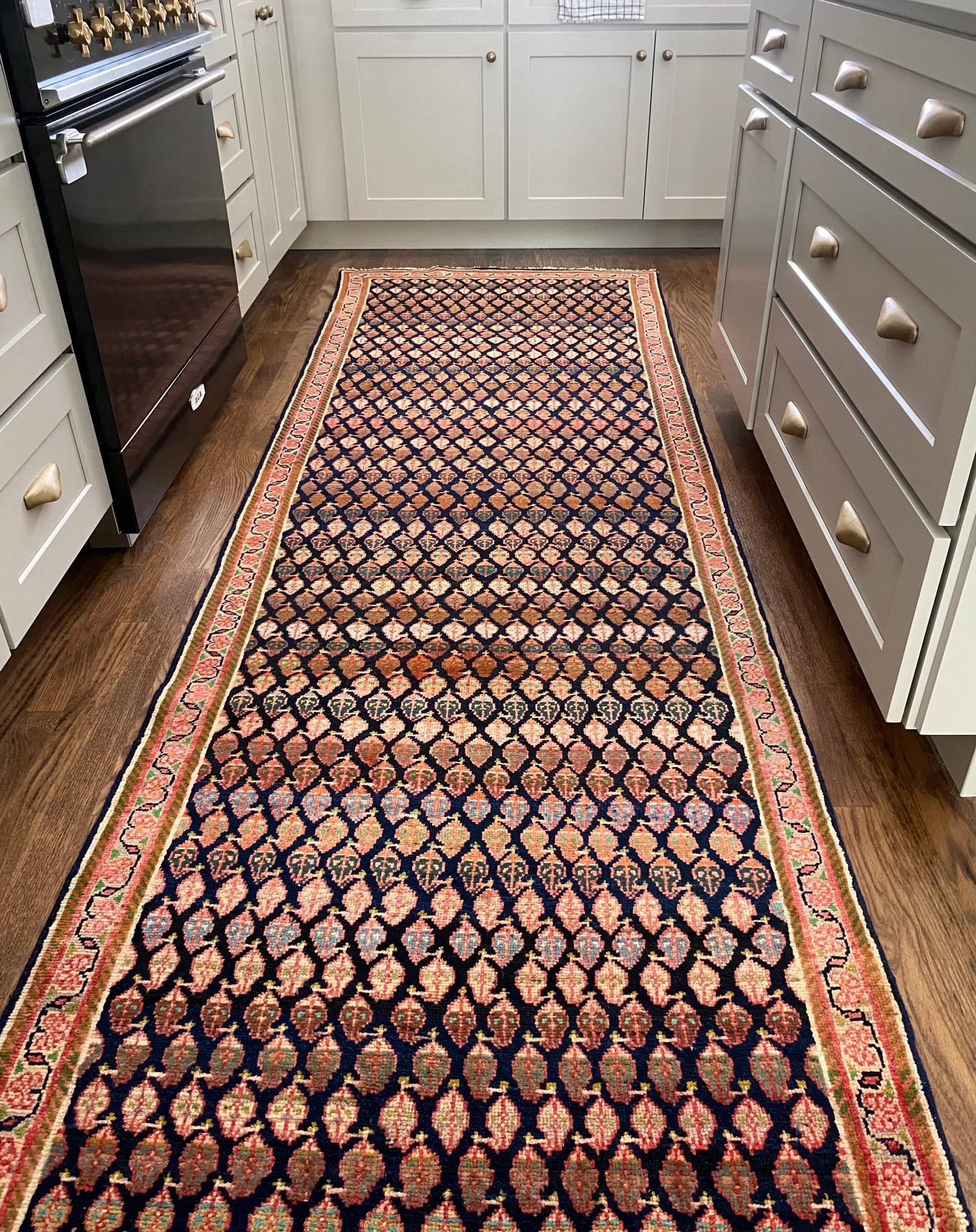 All of our rugs have been professionally cleaned prior to listing. We strive to deliver rugs that everyone loves, but please note that when you purchase from Two Sisters Rugs you are purchasing an item that is pre-owned and vintage by nature. Rugs might have areas of wear, minor repairs, or other unique characteristics, but we believe this is what makes them beautiful and one of a kind. Many rugs do not have perfect lines. All photographs are taken on an iPhone with no filter in natural light unless otherwise noted; colors may vary depending on the placement in your home. Colors may also vary depending on your phone or screen settings. If the area you are placing the rug has less natural light, the rug will appear darker in person. We aim to represent each rugs true colors and designs on the listing photos, but are happy to send additional photos upon request prior to purchase. High quality wool contains a substance called lanolin, which emits a metallic-y, but sweet and grassy scent. ALL SALES ARE FINAL.