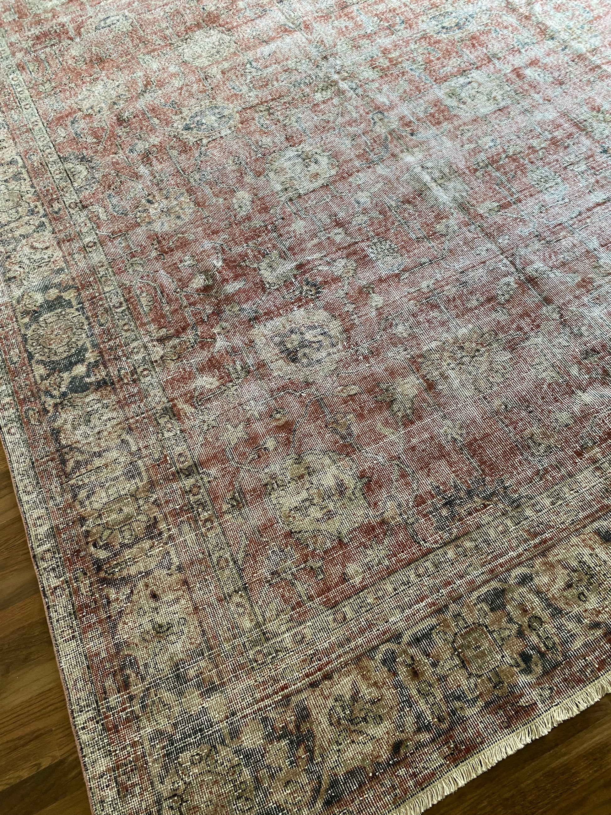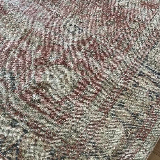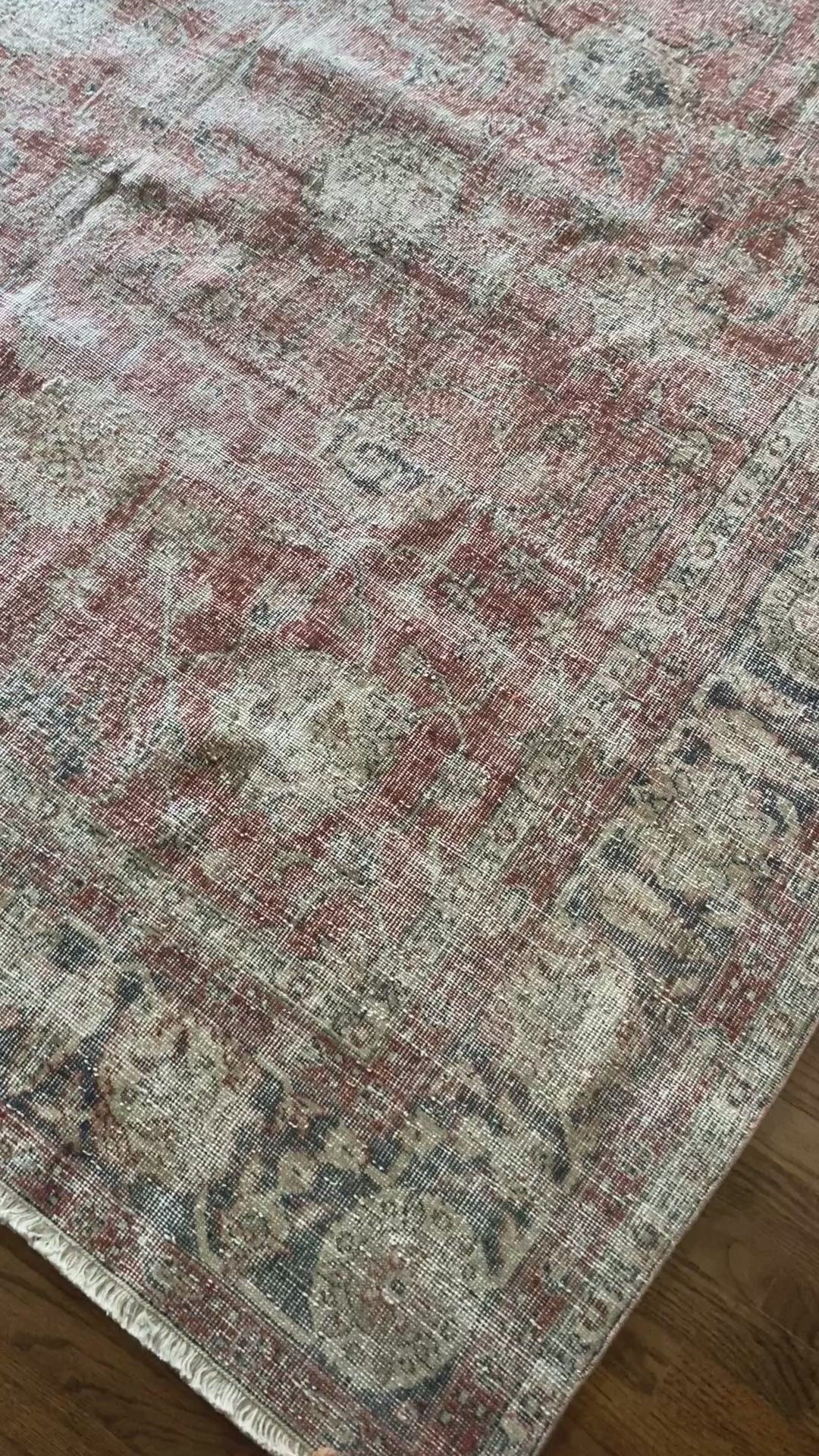Vintage Turkish wool area rug measuring 8’ x 10’6, hand-knotted and one of a kind. This vintage piece features a soft, washed-out palette with muted red tones and a classic floral design—making it a beautiful foundation for living rooms, bedrooms, or layered, collected spaces.