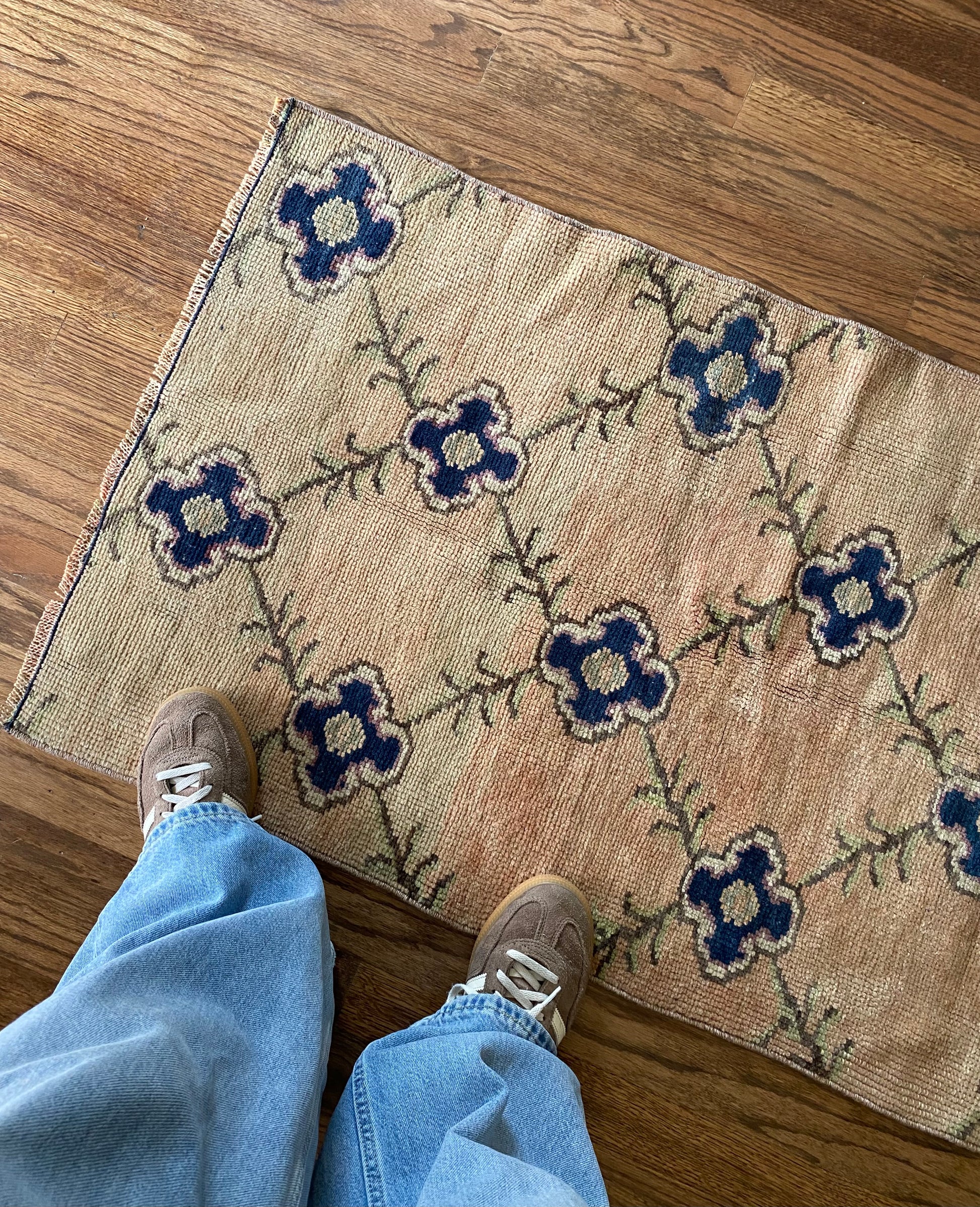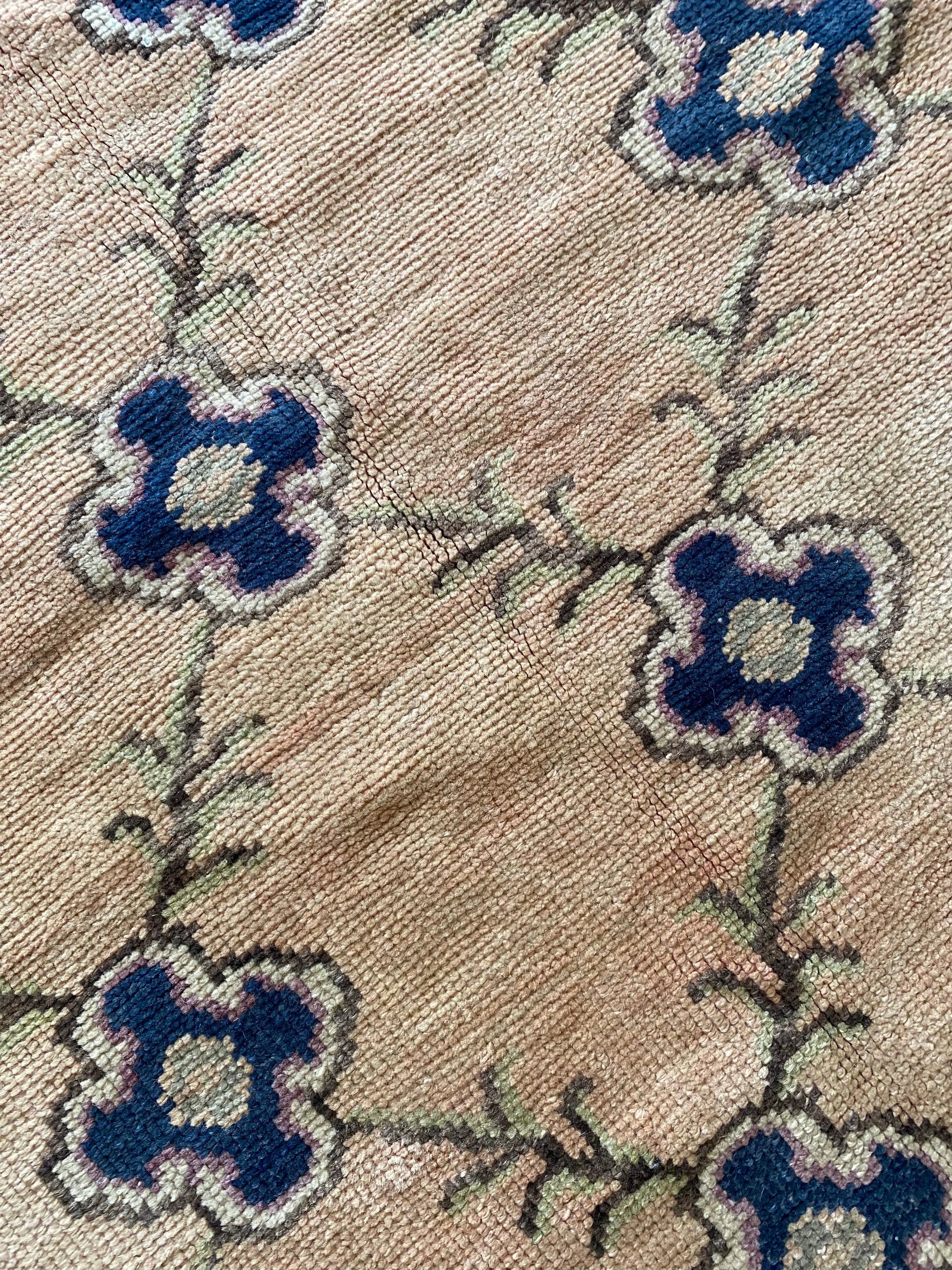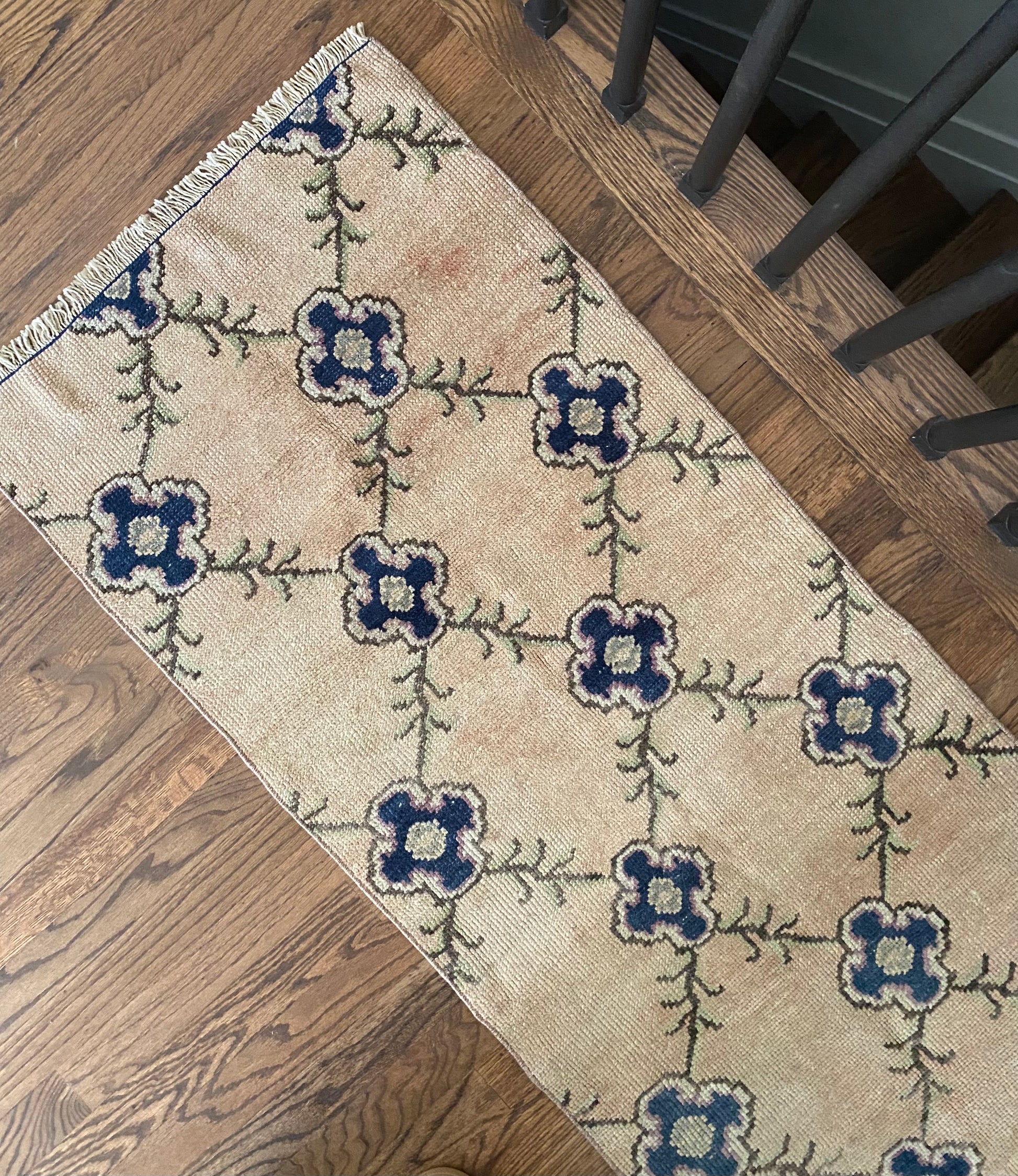All of our rugs have been professionally cleaned prior to listing. We strive to deliver rugs that everyone loves, but please note that when you purchase from Two Sisters Rugs you are purchasing an item that is pre-owned and vintage by nature. Rugs might have areas of wear, minor repairs, or other unique characteristics, but we believe this is what makes them beautiful and one of a kind. Many rugs do not have perfect lines. All photographs are taken on an iPhone with no filter in natural light unless otherwise noted; colors may vary depending on the placement in your home. Colors may also vary depending on your phone or screen settings. If the area you are placing the rug has less natural light, the rug will appear darker in person. We aim to represent each rugs true colors and designs on the listing photos, but are happy to send additional photos upon request prior to purchase. High quality wool contains a substance called lanolin, which emits a metallic-y, but sweet and grassy scent. ALL SALES ARE FINAL.