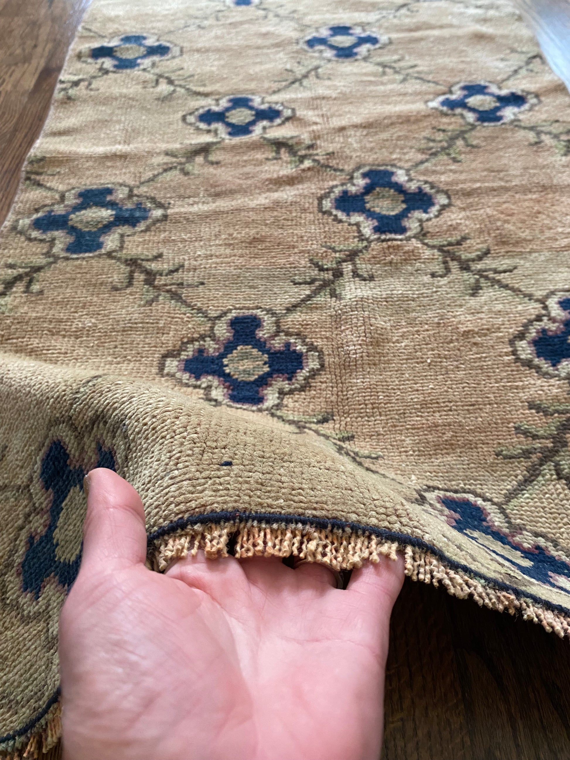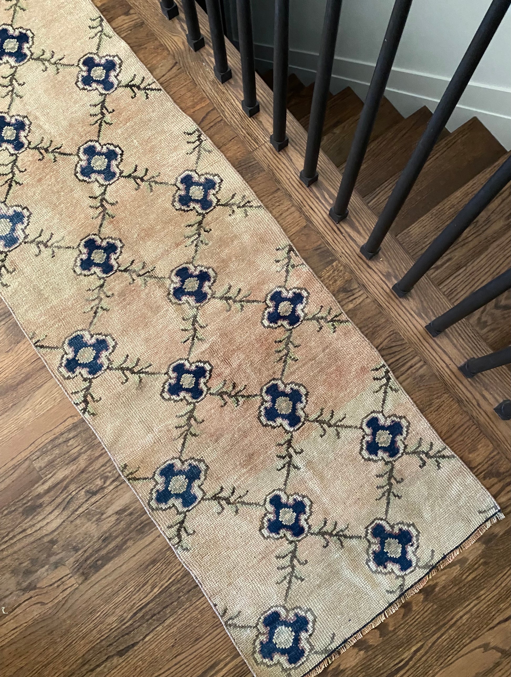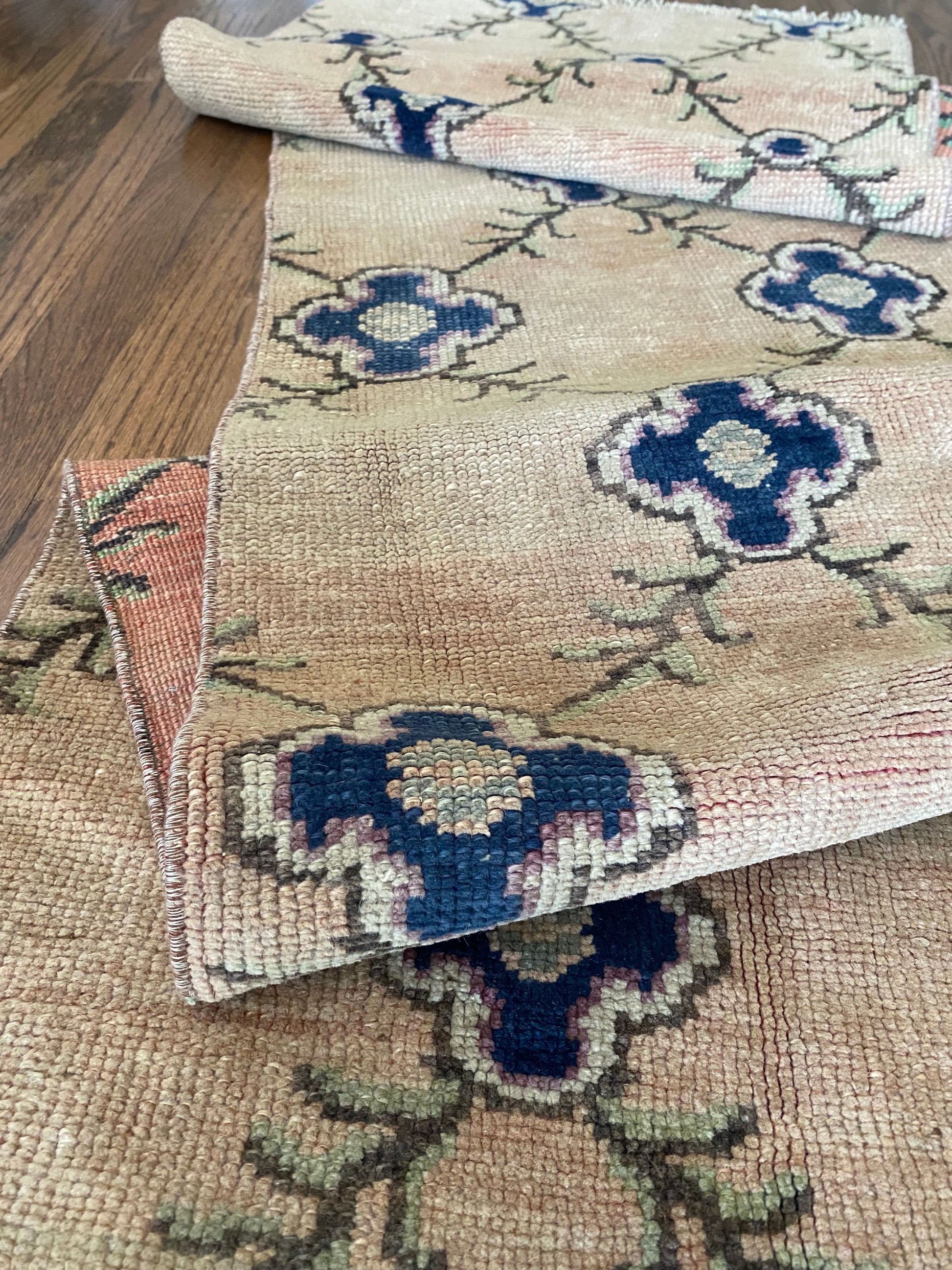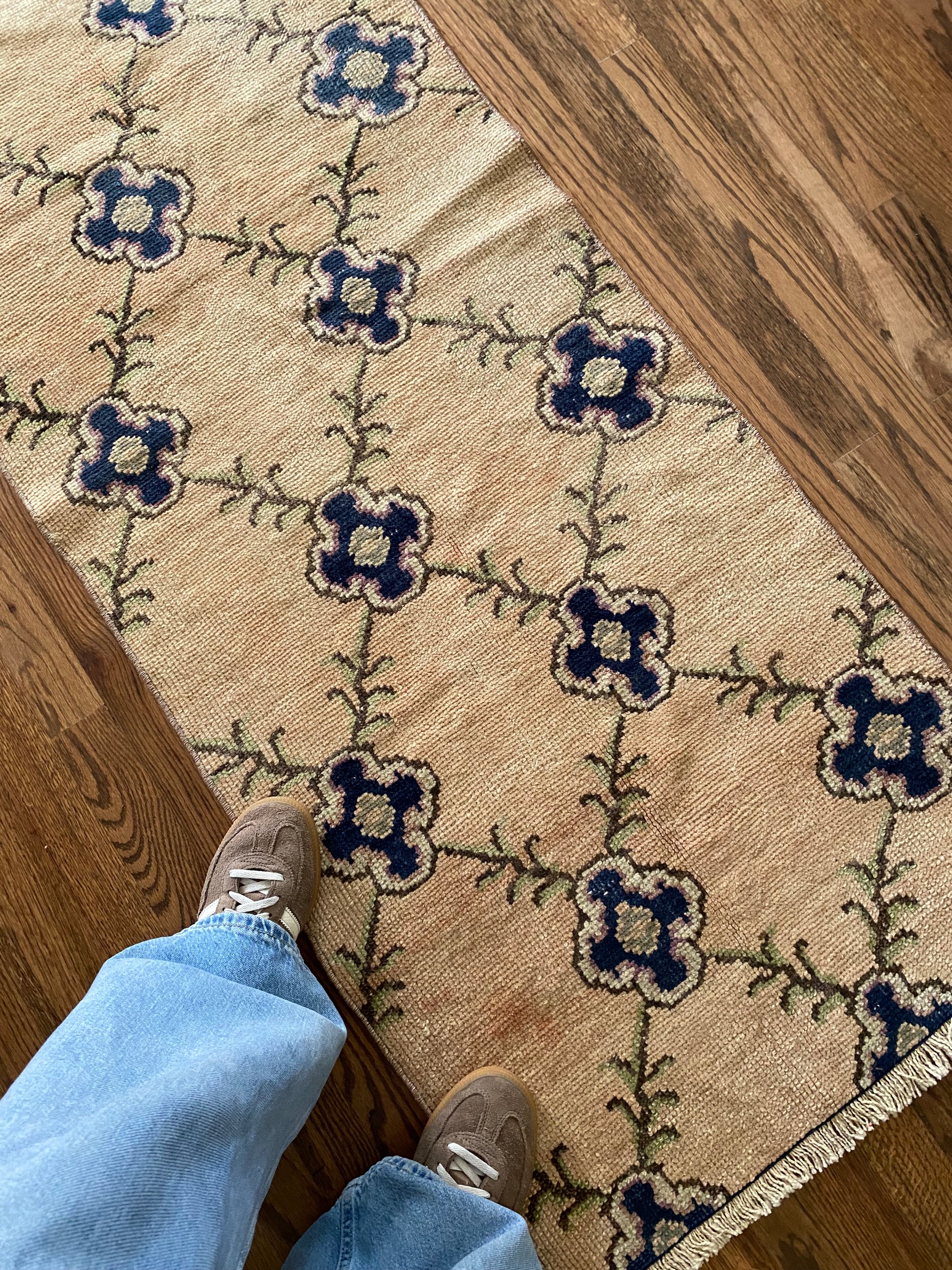 All of our rugs have been professionally cleaned prior to listing. We strive to deliver rugs that everyone loves, but please note that when you purchase from Two Sisters Rugs you are purchasing an item that is pre-owned and vintage by nature. Rugs might have areas of wear, minor repairs, or other unique characteristics, but we believe this is what makes them beautiful and one of a kind. Many rugs do not have perfect lines. All photographs are taken on an iPhone with no filter in natural light unless otherwise noted; colors may vary depending on the placement in your home. Colors may also vary depending on your phone or screen settings. If the area you are placing the rug has less natural light, the rug will appear darker in person. We aim to represent each rugs true colors and designs on the listing photos, but are happy to send additional photos upon request prior to purchase. High quality wool contains a substance called lanolin, which emits a metallic-y, but sweet and grassy scent. ALL SALES ARE FINAL.